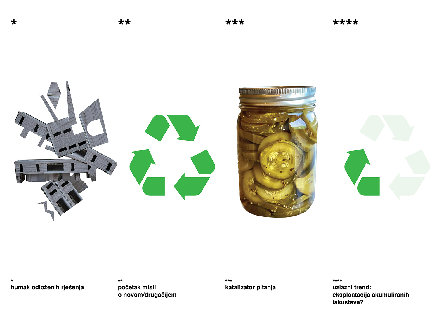 Zimnica je koncipirana kao izložba nerealiziranih projekata. Stavlja koncept u stanje mirovanja kako bi jasnoća ideje ostala sačuvana i tako prenosila nederiviranu emociju samog procesa. Postavlja se pitanje je li uopće moguće izvesti i provesti arhitektove zamisli. Zimnica zaustavlja svaku moguću devijaciju na relaciji koncept – realizacija. Čin kiseljenja ostavlja mogućnost novog i zdravijeg života kuće, novu priliku za istraživanje, inspiraciju i učenje. Fizička transformacija makete označava separaciju ideje od mogućega. Zimnica poziva na akciju. (U)kiselimo!