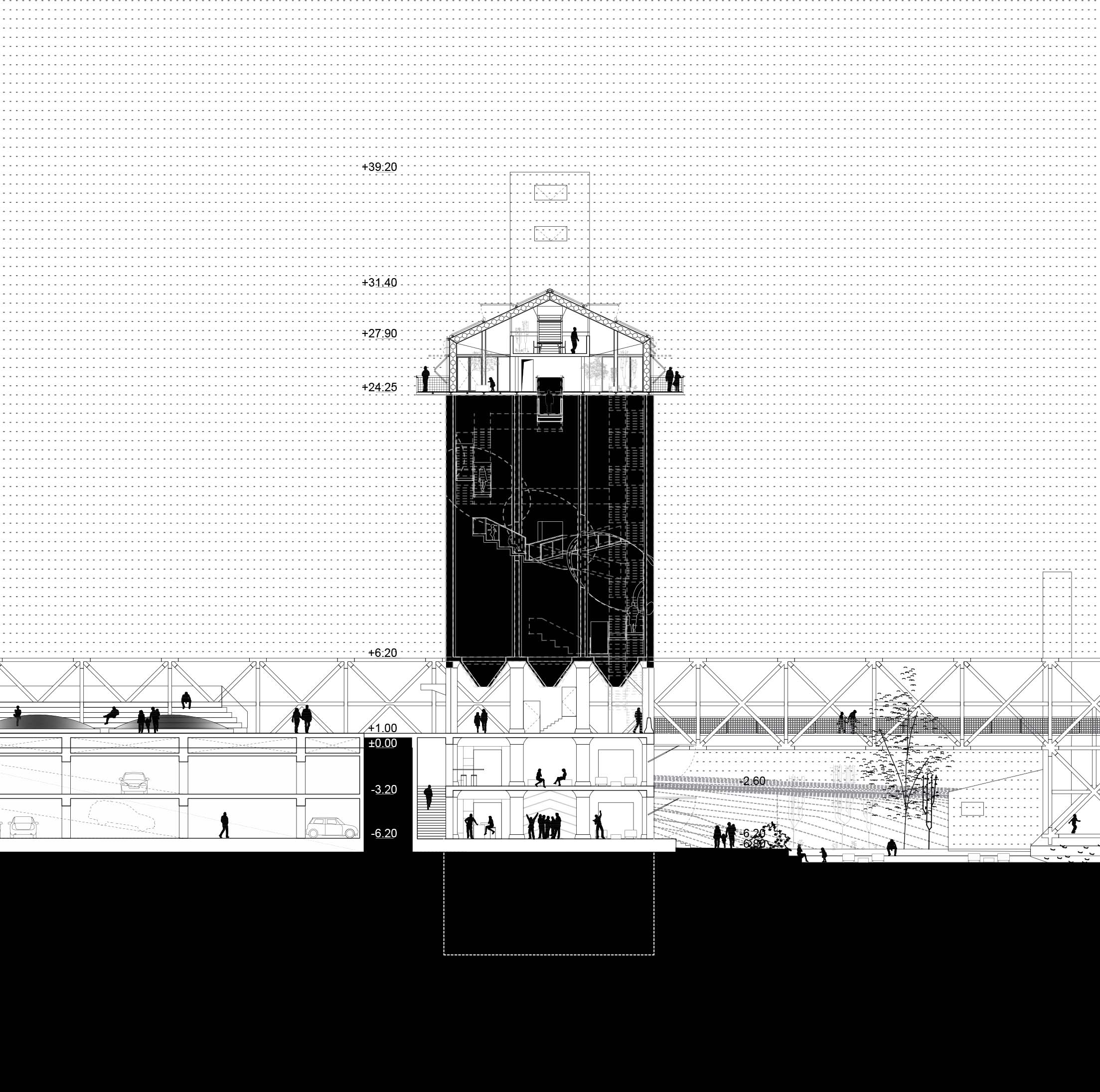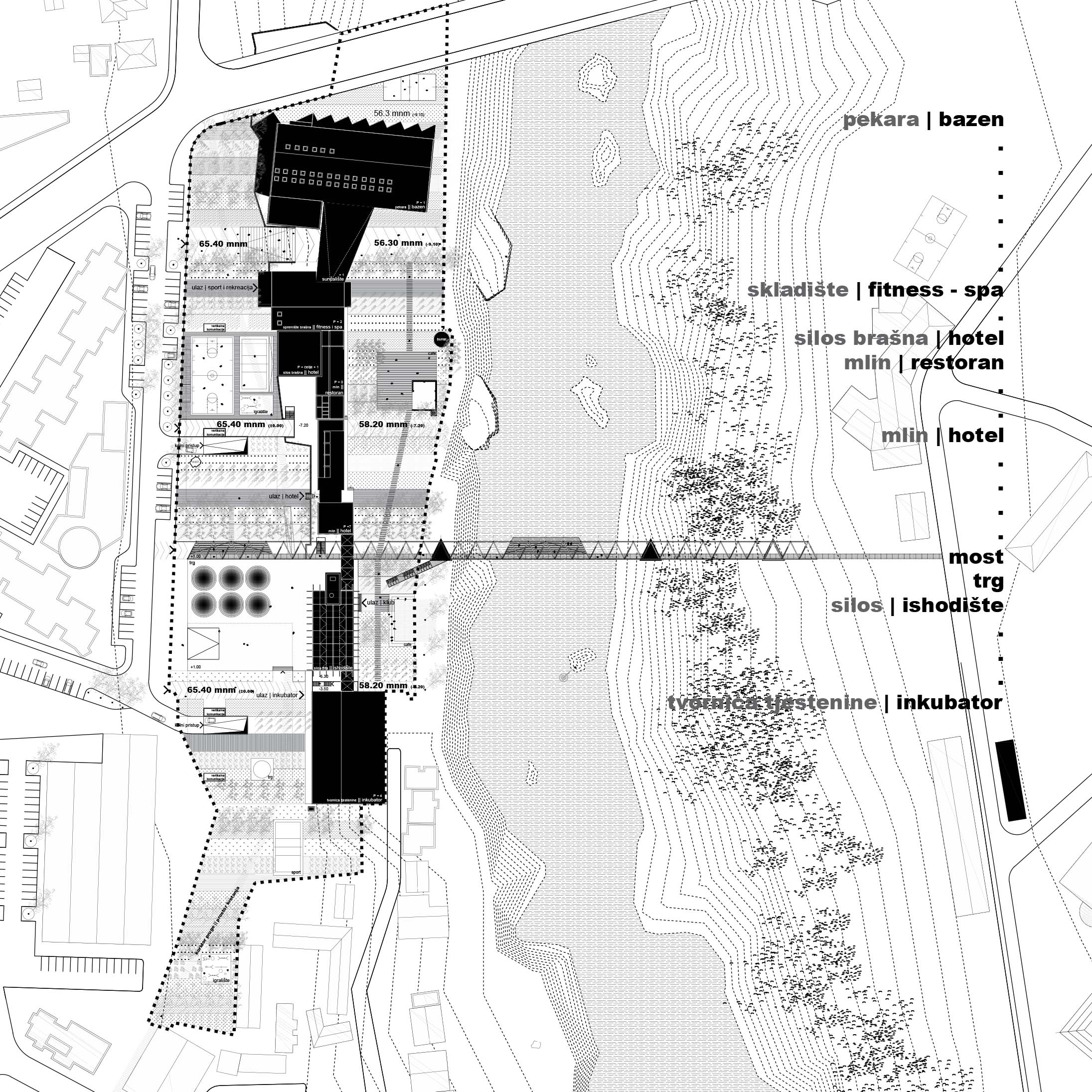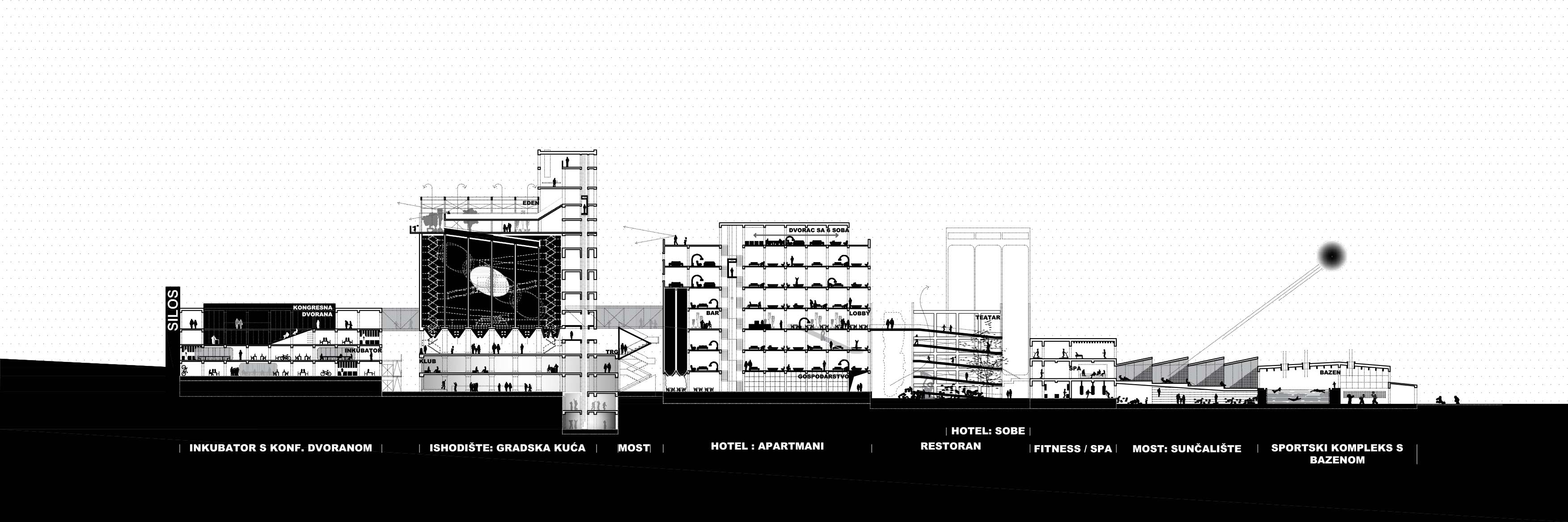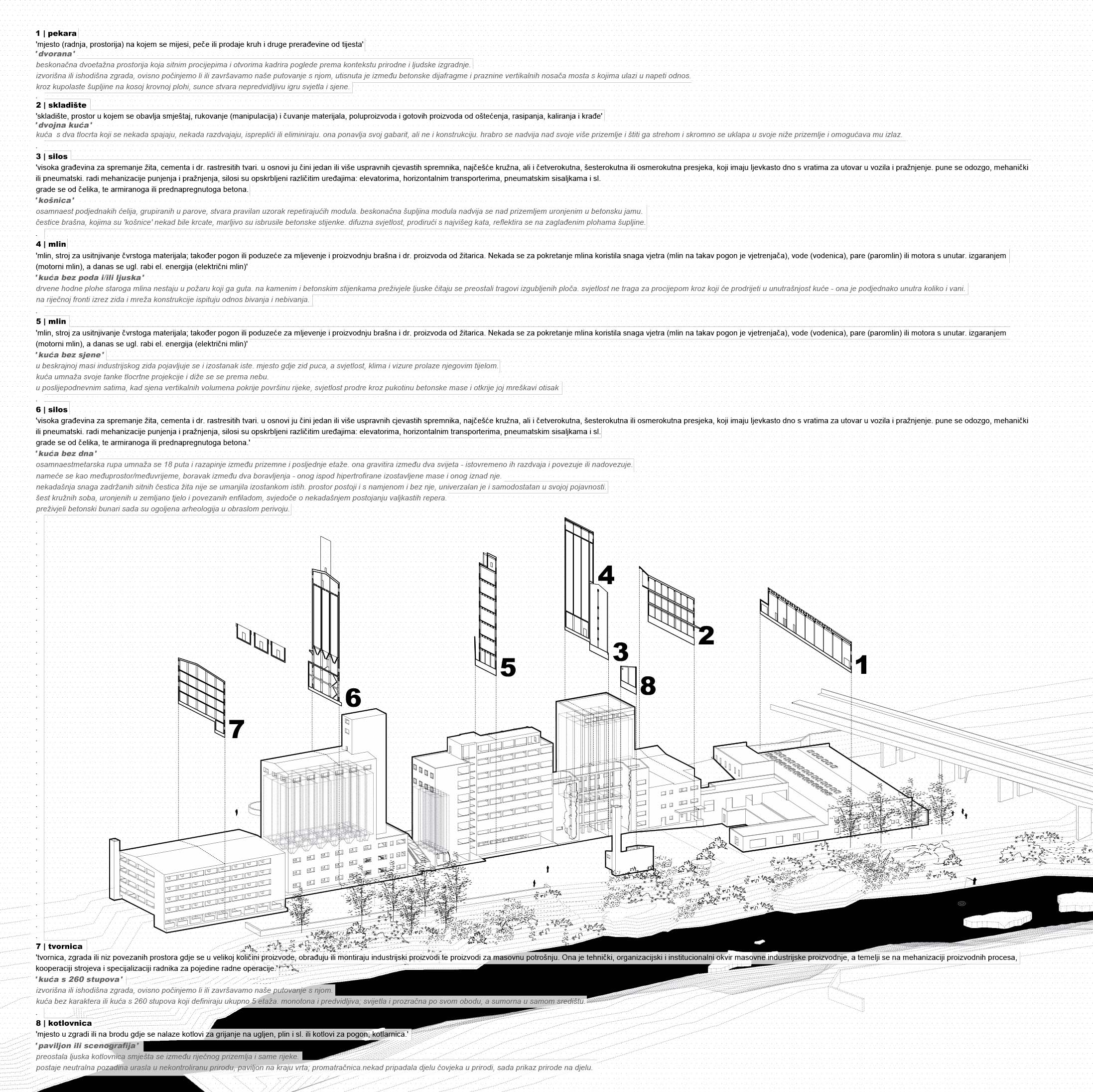 Industrijski sklop od 13 građevina, prisilno devastiran procesima privatizacije, postaje središte arhitektonske intervencije. Zatvoren i autonoman kompleks, konstruktivno nepobjediv i definiran zbrojem svojih volumena, a ne površina, otvara se gradu, rijeci i koritu. Nekadašnja kuća žita postaje kuća ljudi, a silosi i trg definiraju novo gradsko ishodište. Kretanje izbušenom masom početak je doživljavanja oslobođenih scenarija – nova praznina otkriva cjelovitost kuće. Mjesec dana od završetka rada počinje rušenje kompleksa.