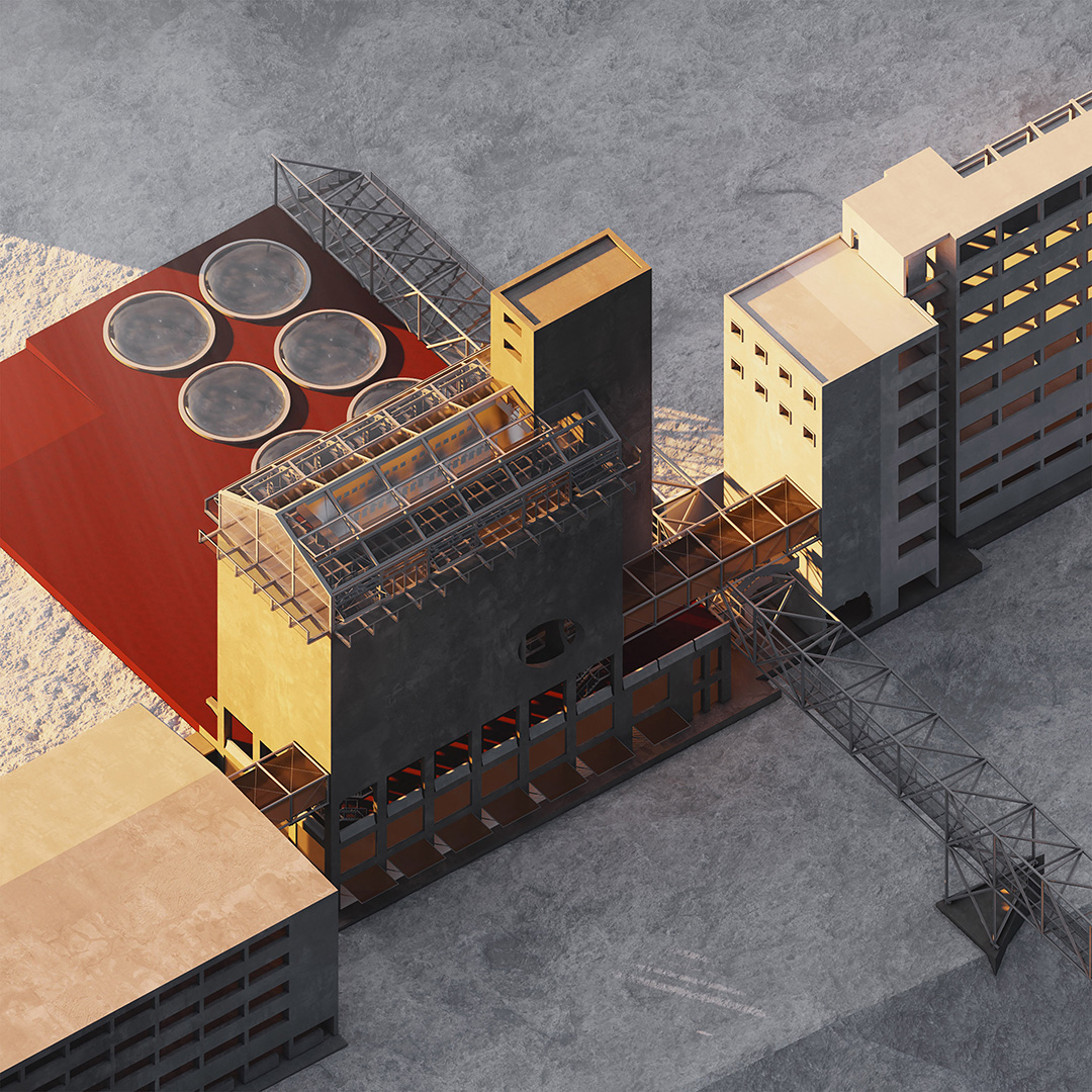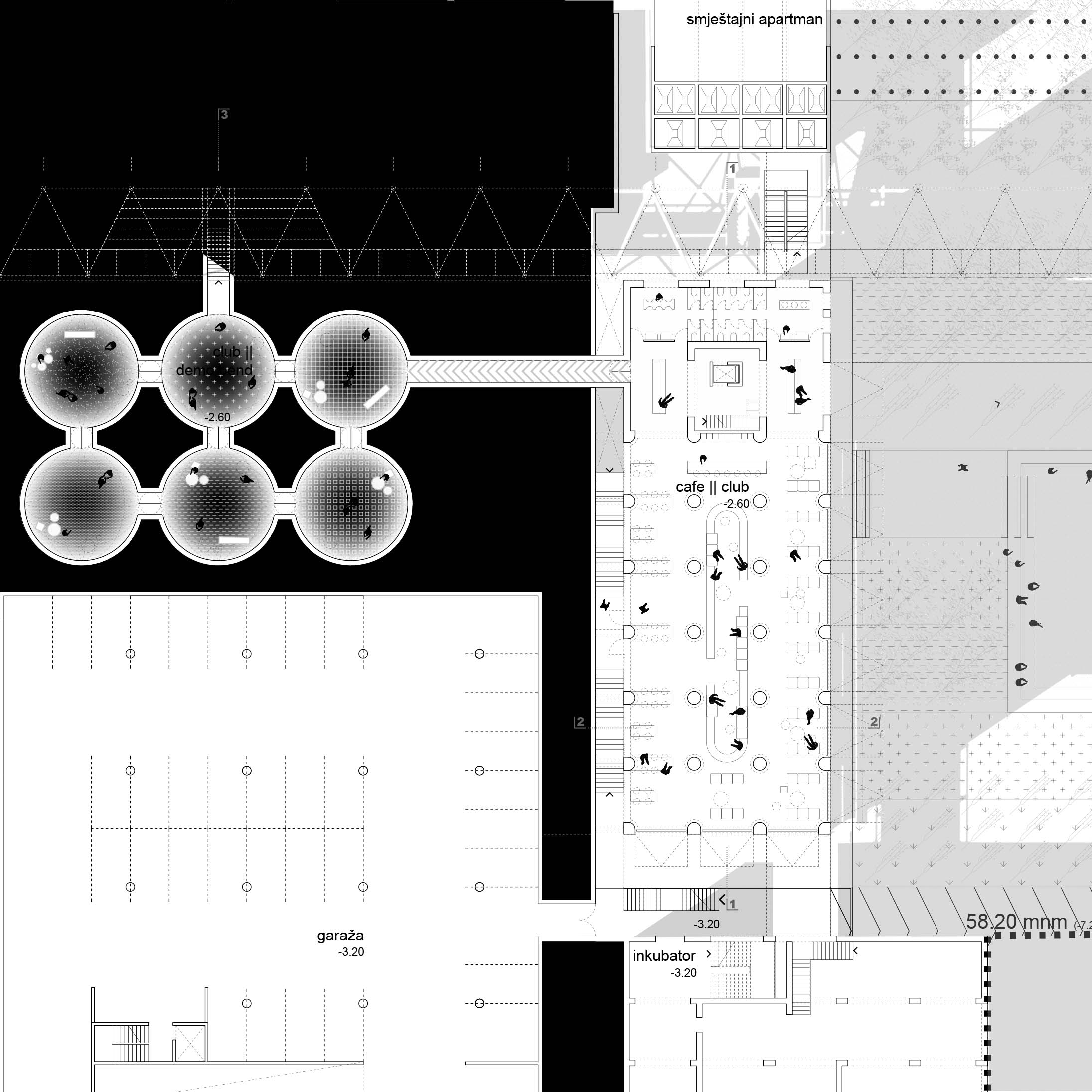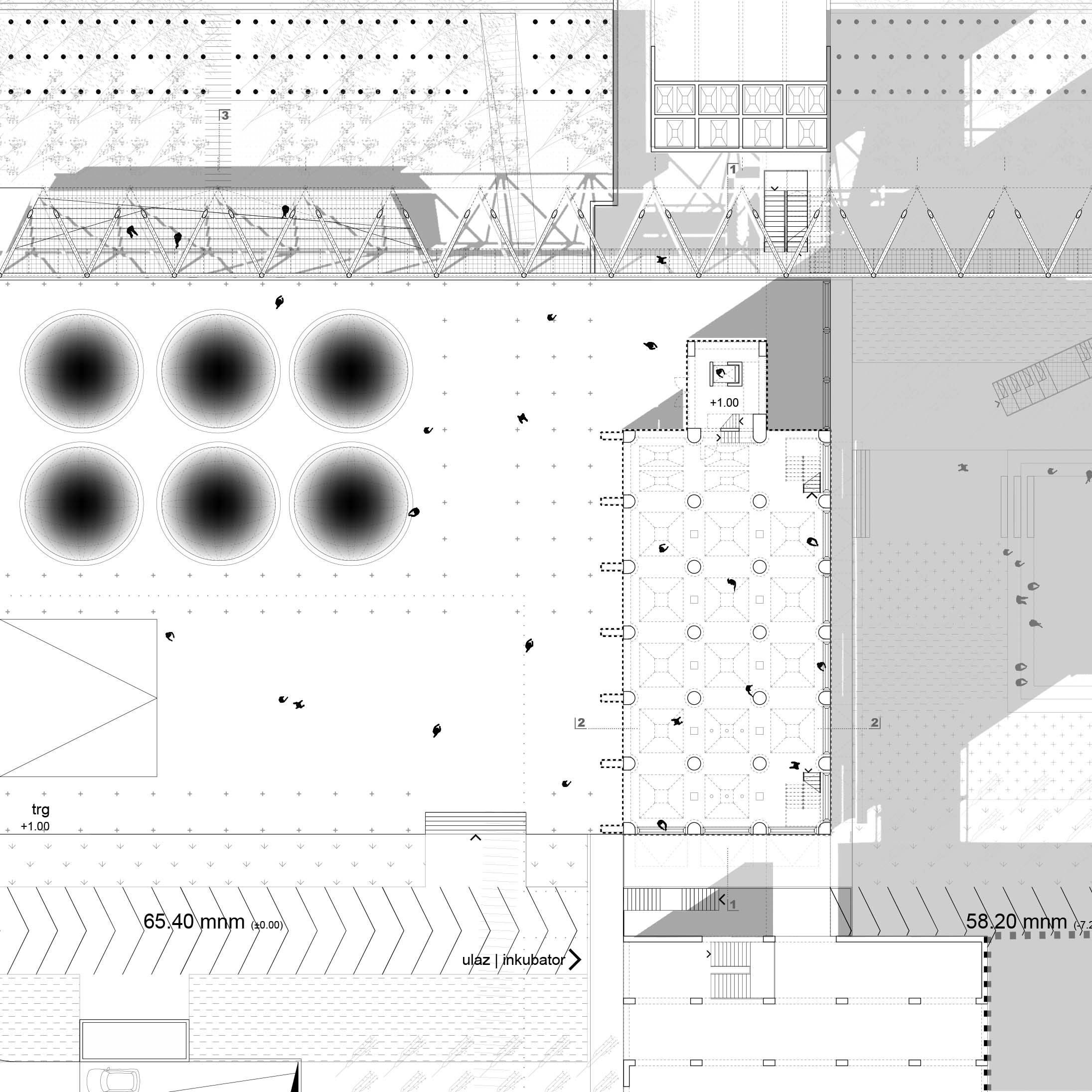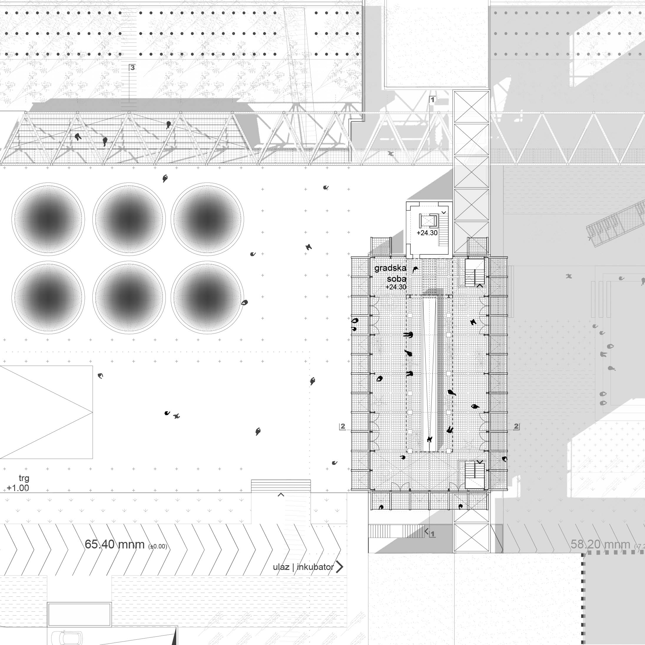 Industrijski sklop od 13 građevina, prisilno devastiran procesima privatizacije, postaje središte arhitektonske intervencije. Zatvoren i autonoman kompleks, konstruktivno nepobjediv i definiran zbrojem svojih volumena, a ne površina, otvara se gradu, rijeci i koritu. Nekadašnja kuća žita postaje kuća ljudi, a silosi i trg definiraju novo gradsko ishodište. Kretanje izbušenom masom početak je doživljavanja oslobođenih scenarija – nova praznina otkriva cjelovitost kuće. Mjesec dana od završetka rada počinje rušenje kompleksa.
