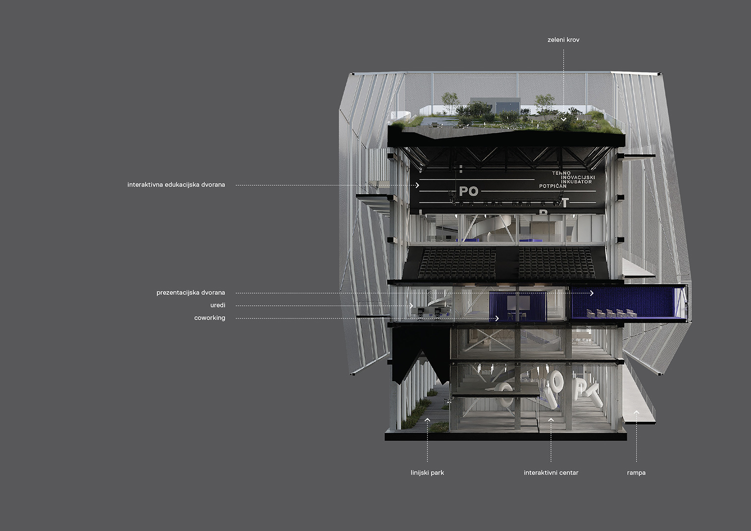 Inkubator u mjestu Potpićan trebao bi se izvesti prenamjenom i rekonstrukcijom postojeće zgrade nekadašnjega industrijskog objekta za separaciju ugljena. Projektiran je „srednji put“ obnove – djelomično očuvanje zatečenoga, uza značajniju adiciju novog sloja za buduće vrijeme i novu funkciju. Zgrada se proteže na 9000 m2, a uza suvremenu fasadu, javnu rampu po perimetru zgrade i zeleni krov, pri vrhu objekta adirana je i višenamjenska dvorana za korisnike inkubatora, ali i za lokalno stanovništvo.