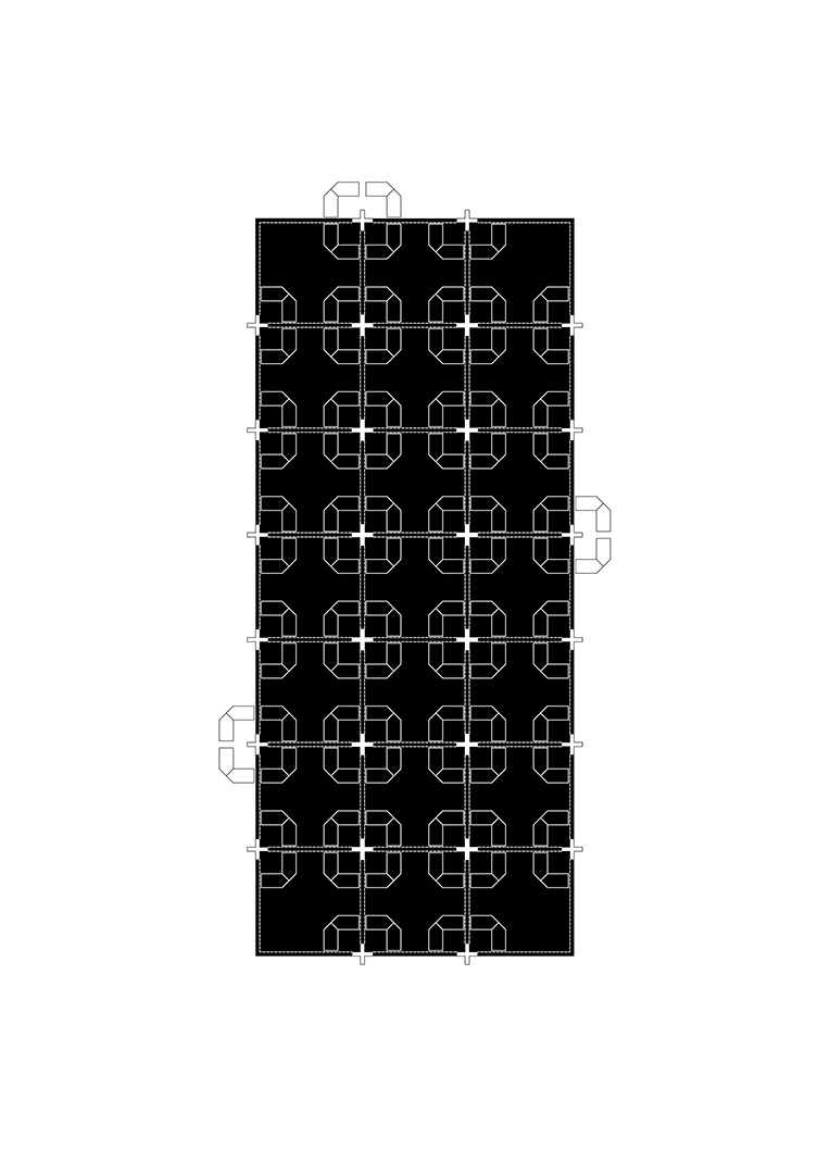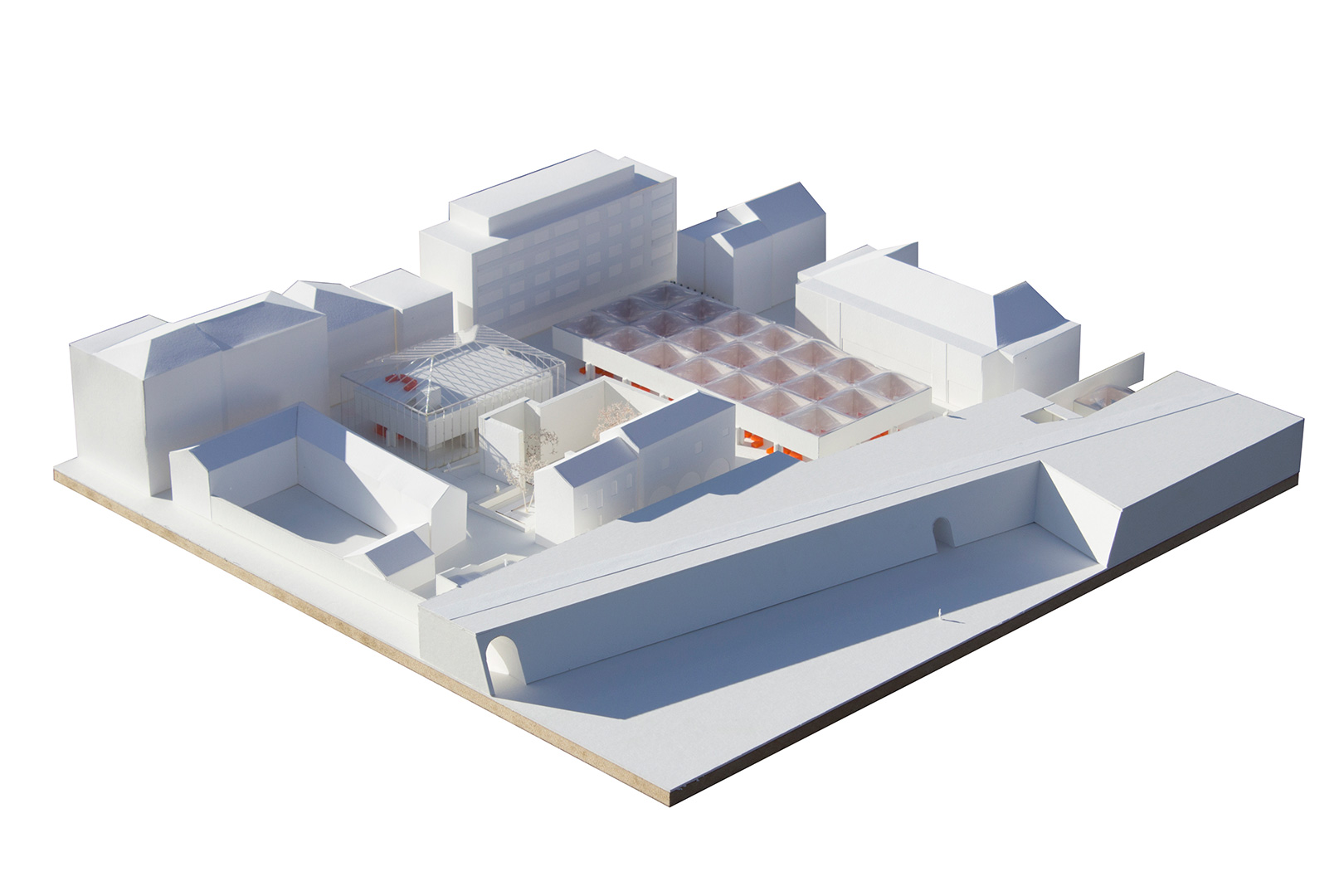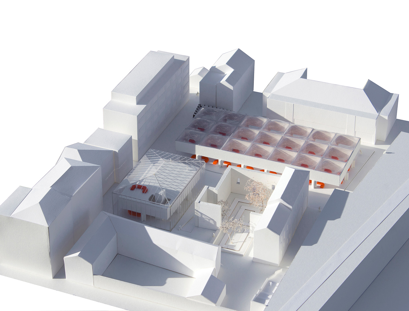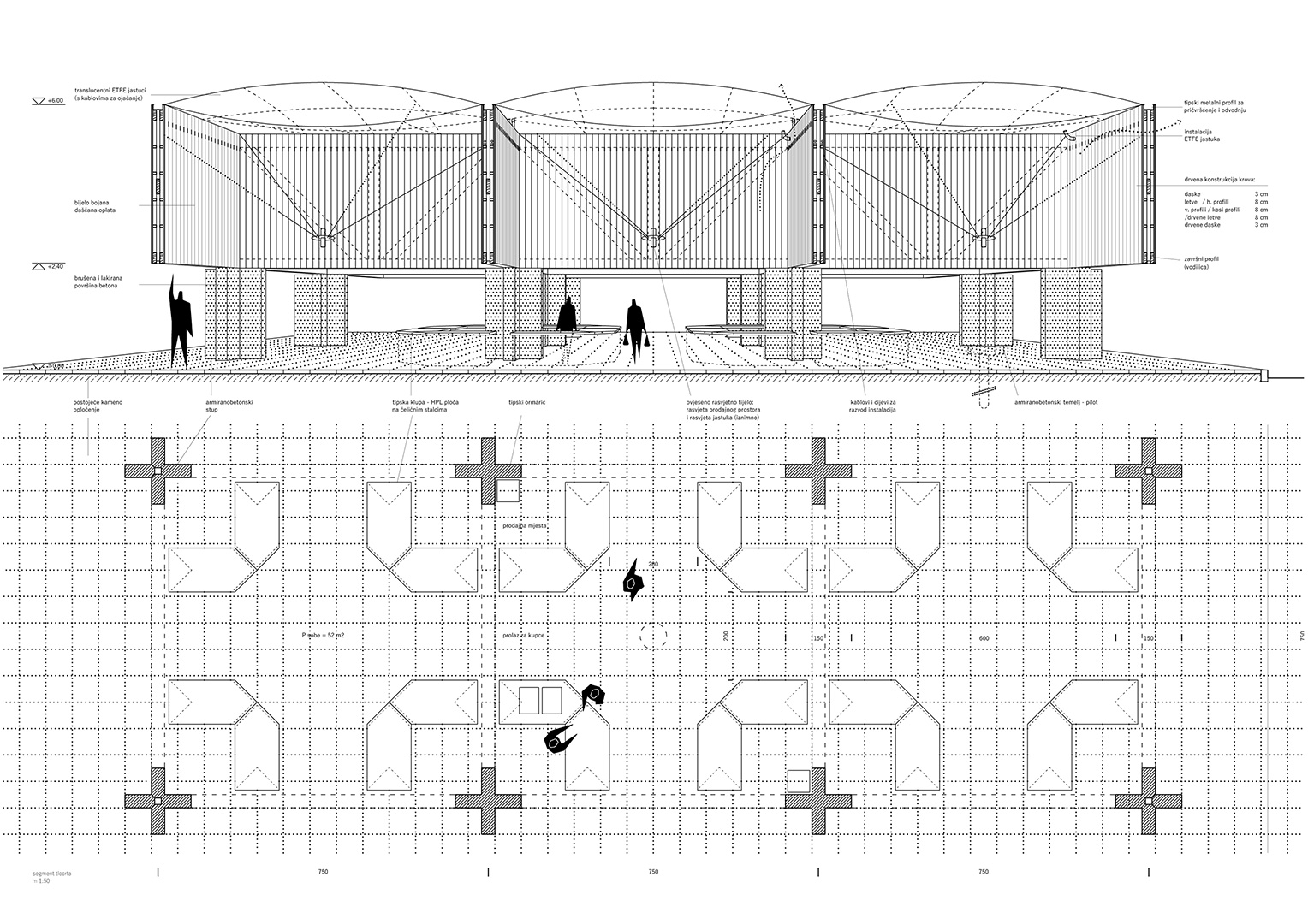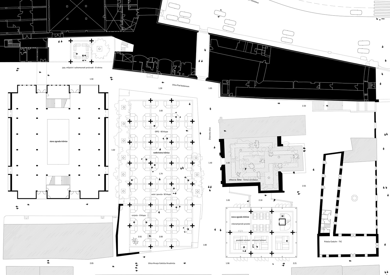 Prostor nove gradske tržnice nastaje u odnosu (dijalogu) postojeće topografije i kamenog opločenja platoa i ogradnog zida palače Pasini prema novoj konstrukciji kojom se tržnica natkriva. Niski križni stupovi u pravilnom rasteru i visoka kasetirana konstrukcija krova dijele prostor tržnice na manje dijelove. Donji je rub konstrukcije razmjerno nizak – u tržnicu se ulazi. Kroz nju se prolazi kao kroz kuću s mnogo jednakih soba. Sobe su razmjerno visoke, nadsvođene translucentnim jastucima.
