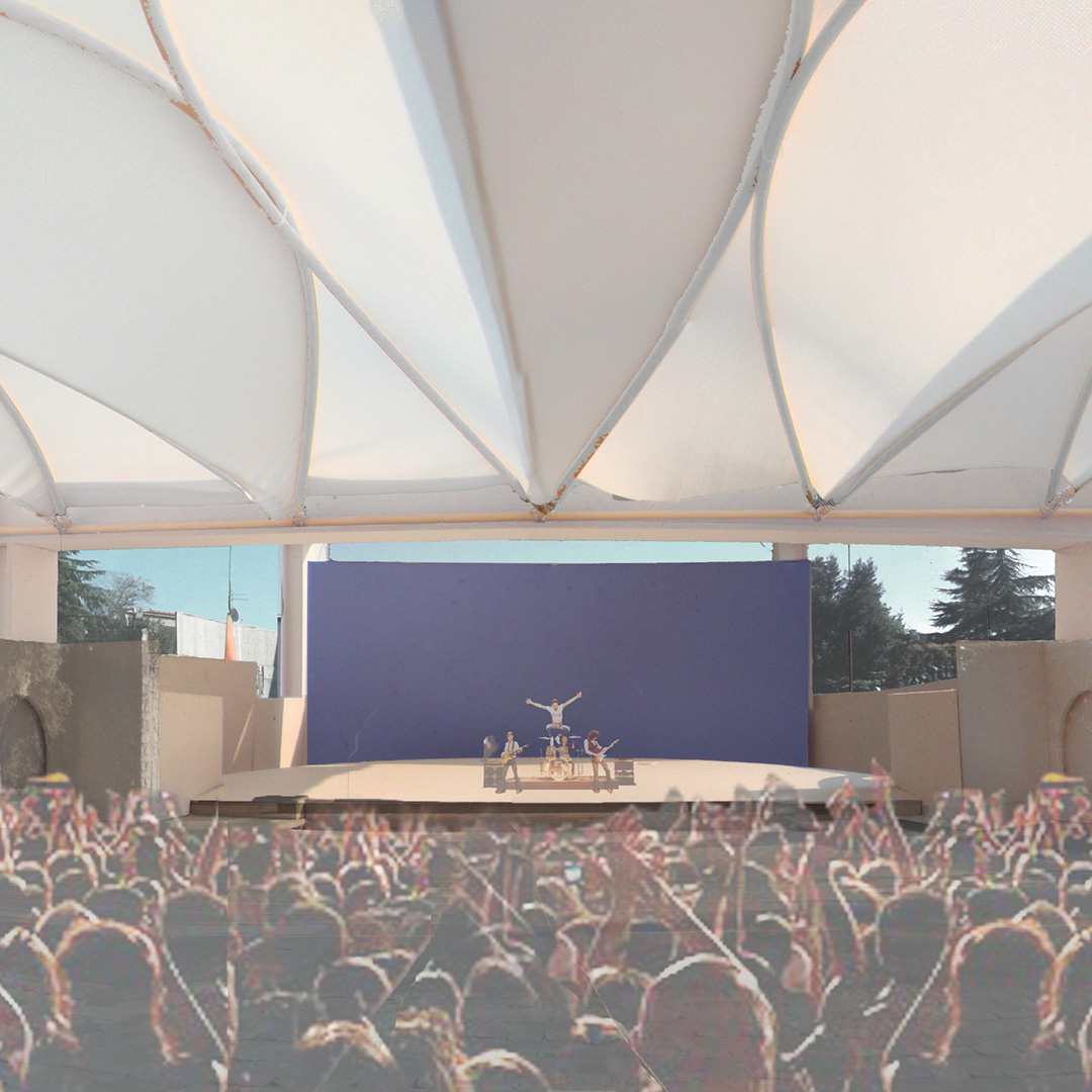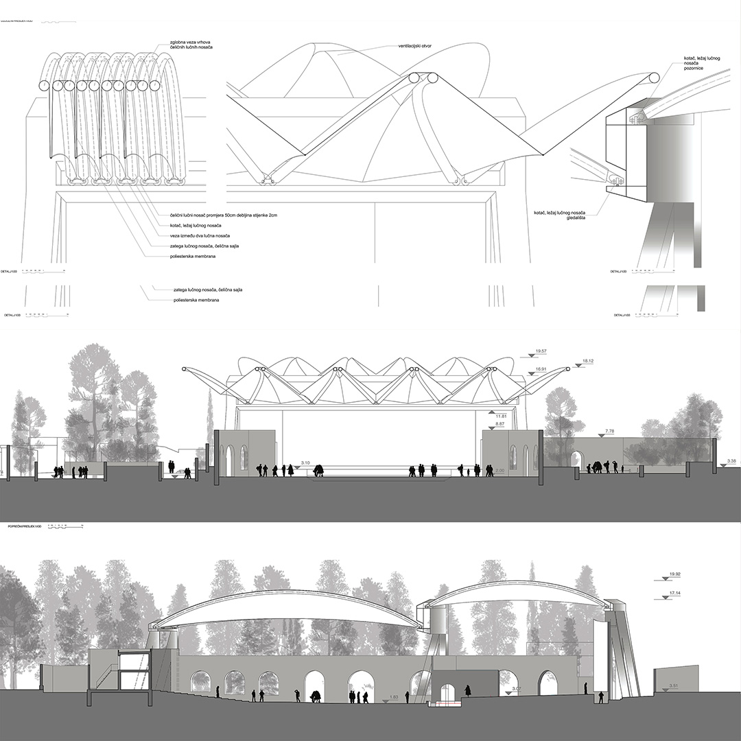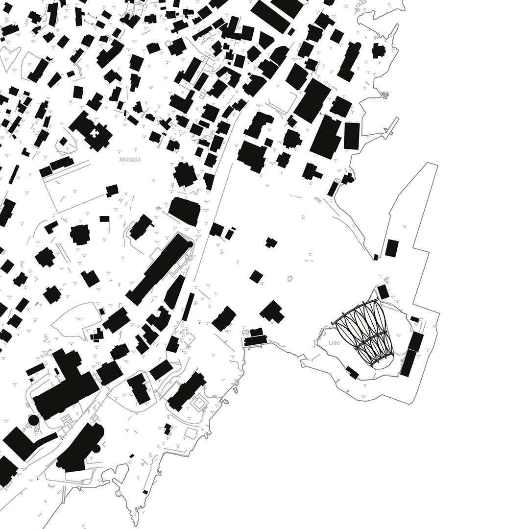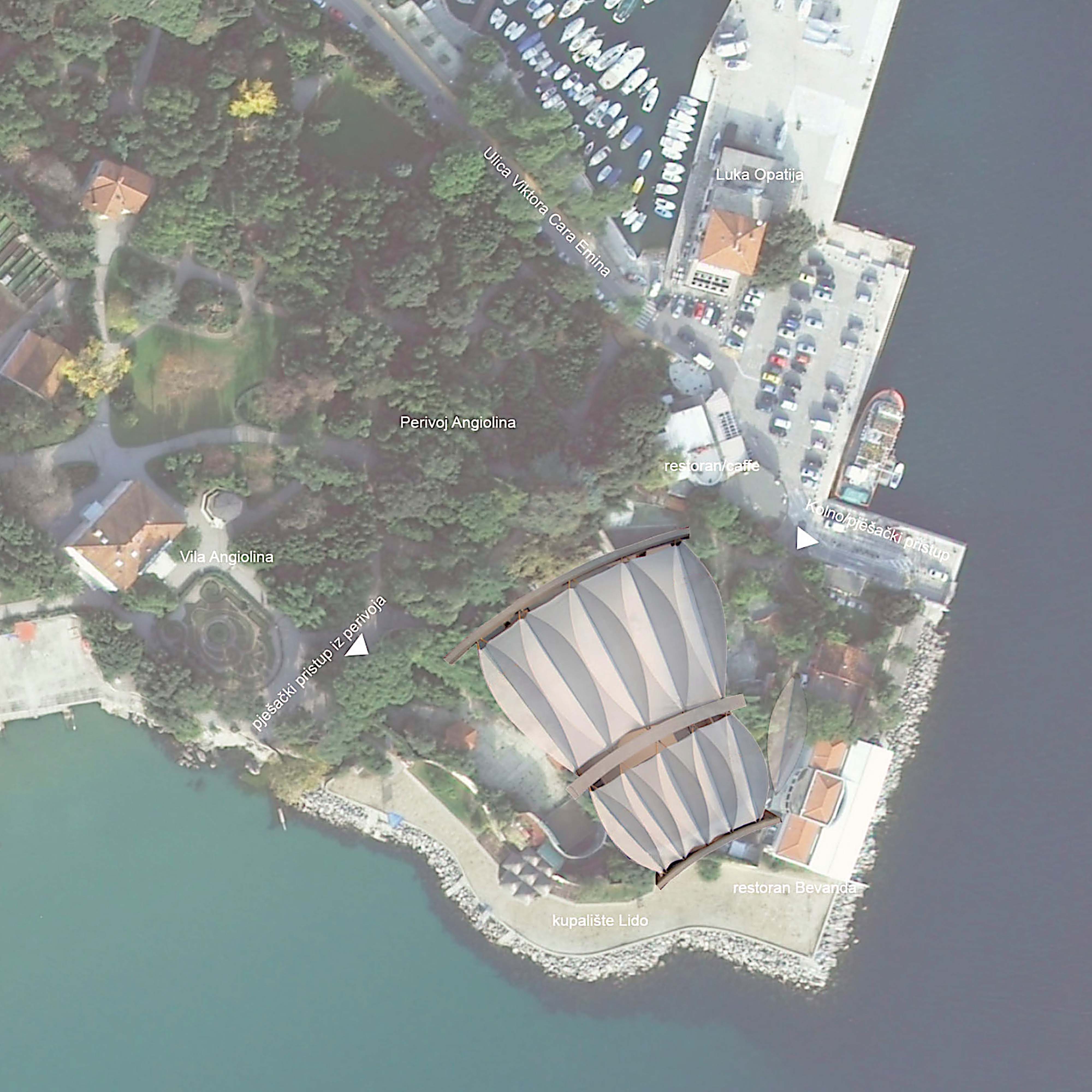 U kontaktnoj zoni opatijskog perivoja Angiolina i mora nalazi se ljetna pozornica, izgrađena 1957. prema projektu Nevena Šegvića. Njezini kameni zidovi ograđuju prostor pozornice i gledališta stvarajući jedinstveni scenski ambijent pod vedrim nebom. Kako bi se tradicija održavanja muzičkih festivala nastavila i održavala neovisno o vremenskim prilikama, gledalište i pozornica natkrivaju se pomičnim krovovima klizne i sklopive lučne čelične konstrukcije s napetom tekstilnom membranom. Lakoća fizičke pojavnosti novih krovova u kontrastu je s masivnošću postojećih zidova.