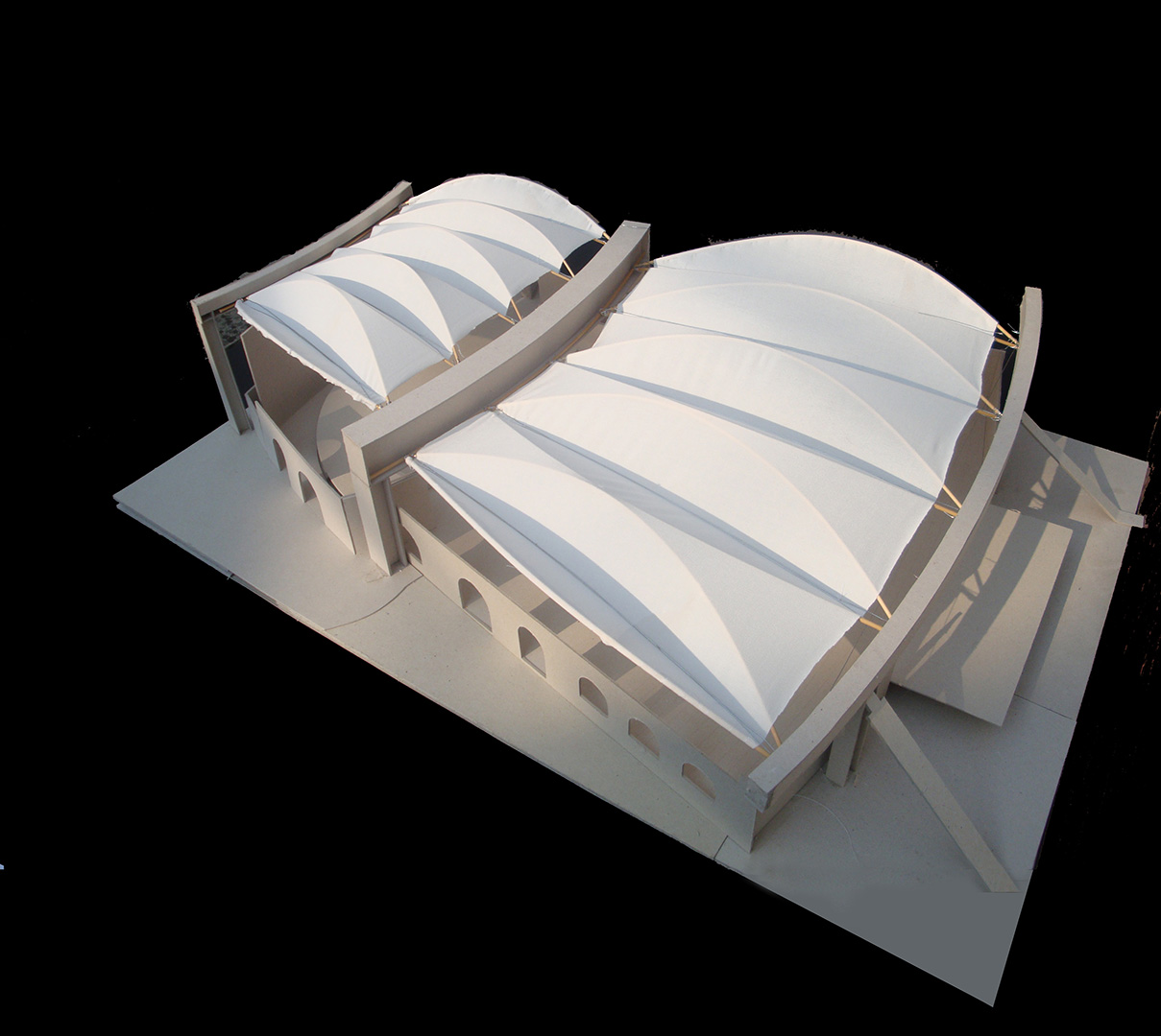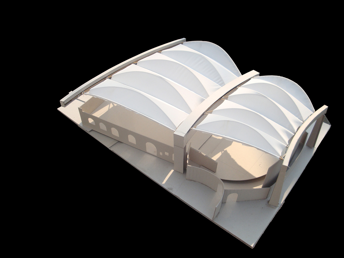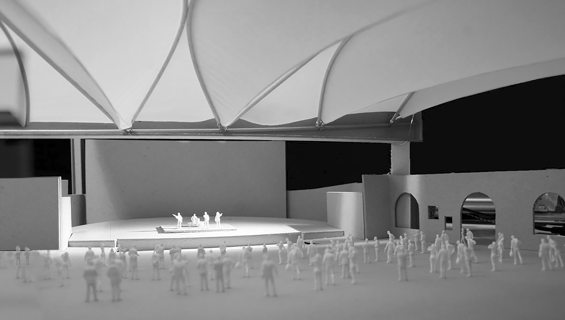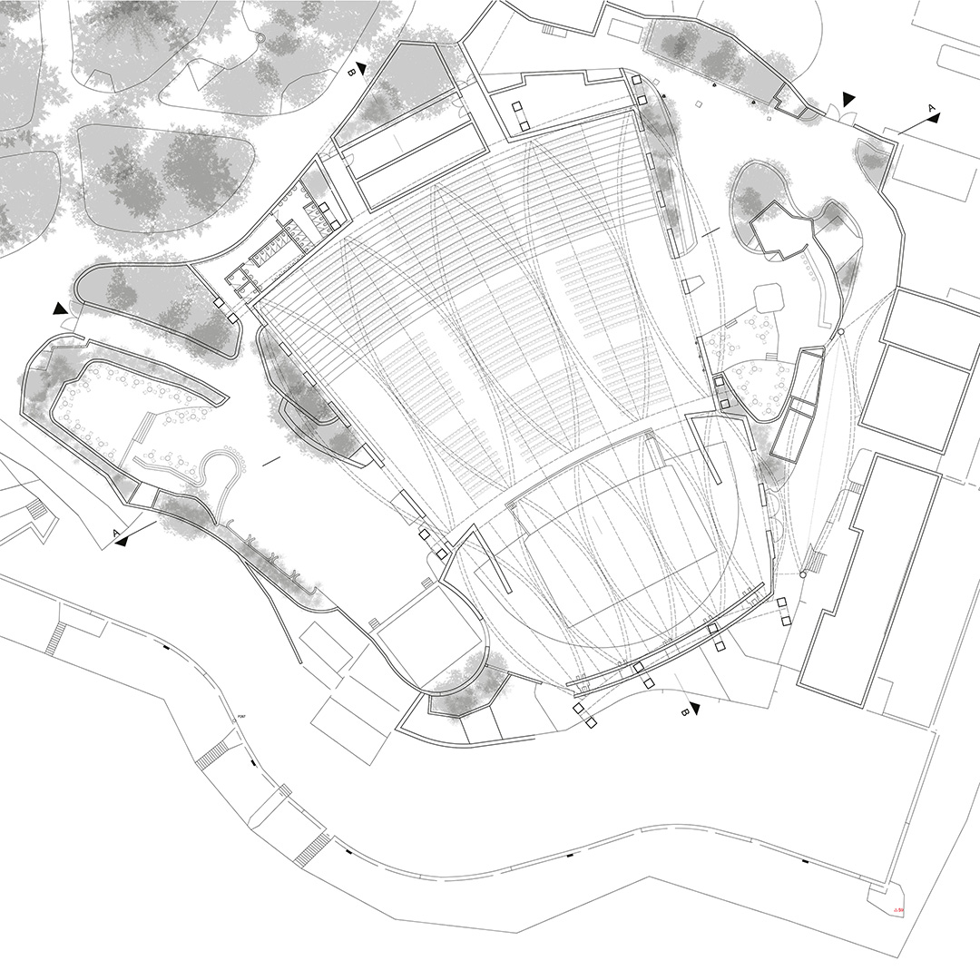 U kontaktnoj zoni opatijskog perivoja Angiolina i mora nalazi se ljetna pozornica, izgrađena 1957. prema projektu Nevena Šegvića. Njezini kameni zidovi ograđuju prostor pozornice i gledališta stvarajući jedinstveni scenski ambijent pod vedrim nebom. Kako bi se tradicija održavanja muzičkih festivala nastavila i održavala neovisno o vremenskim prilikama, gledalište i pozornica natkrivaju se pomičnim krovovima klizne i sklopive lučne čelične konstrukcije s napetom tekstilnom membranom. Lakoća fizičke pojavnosti novih krovova u kontrastu je s masivnošću postojećih zidova.