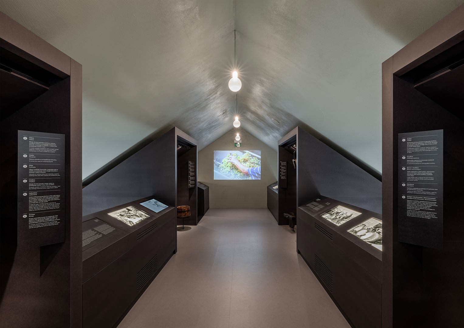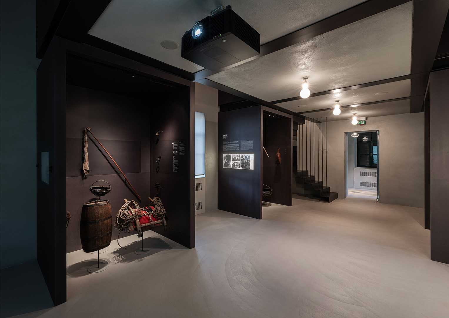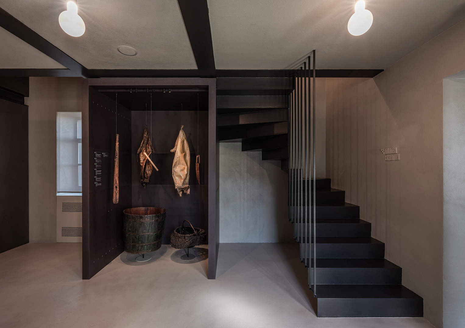 Prostorna koncepcija stalnog postava bazira se na integriranju suvremenih interijerskih elemenata od čelika i strukturno koloriranog mdf-a tako da se ne mijenja izvorno oblikovanje građevine. Stalni izložbeni postav i popratne namjene integriraju se unutar postojećega građevnog tkiva kao „uneseni“, neovisni prostorni element čelične konstrukcije koji stvara na prostoru kata dodatnu galeriju u potkrovlju, a ujedno i konstrukcijski učvršćuje građevinu. Kuća-škola u svojem volumenu istovremeno ostaje intaktna.