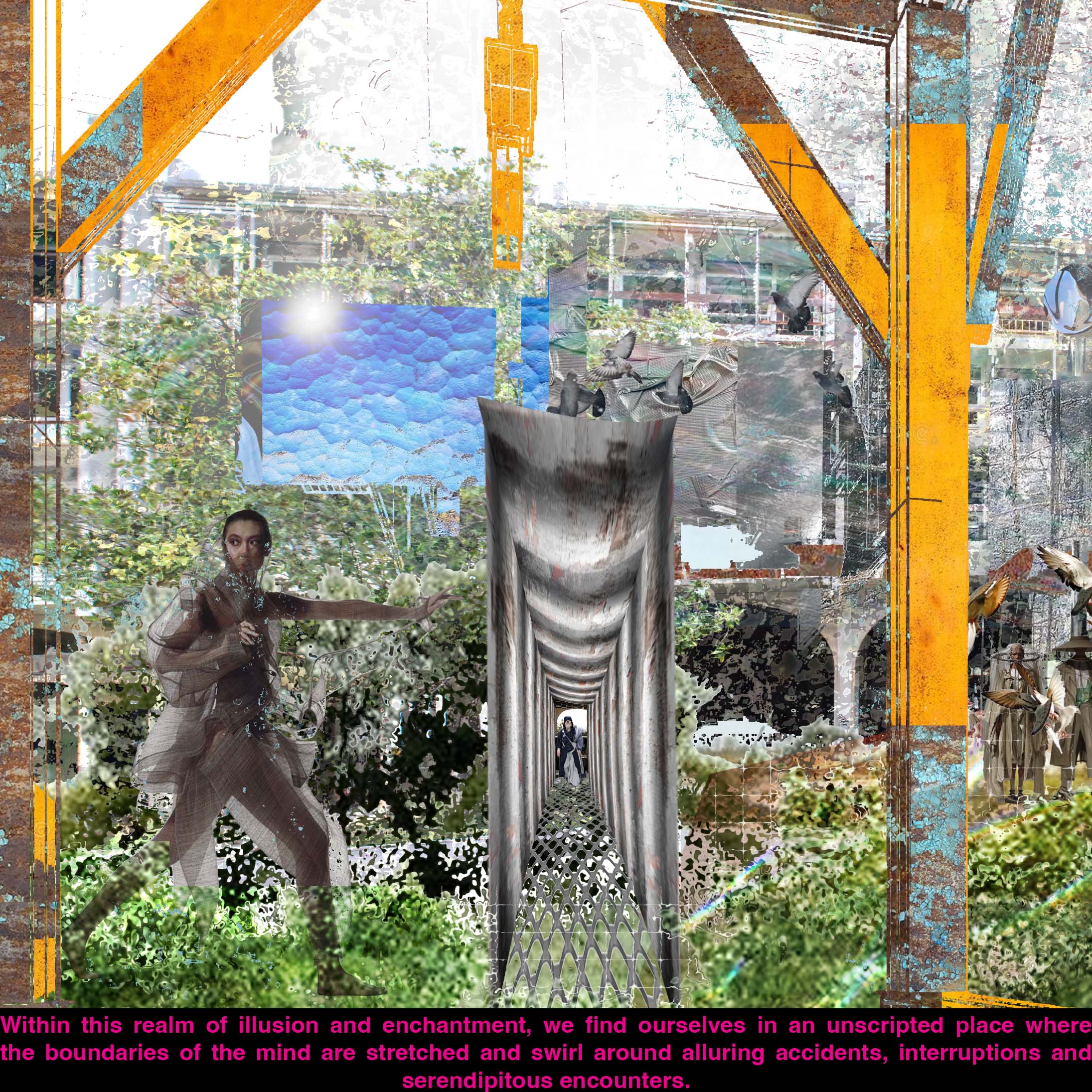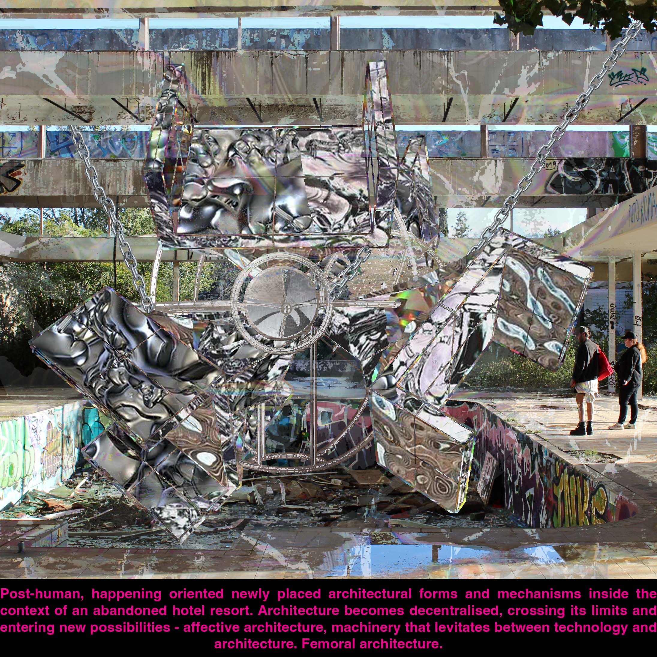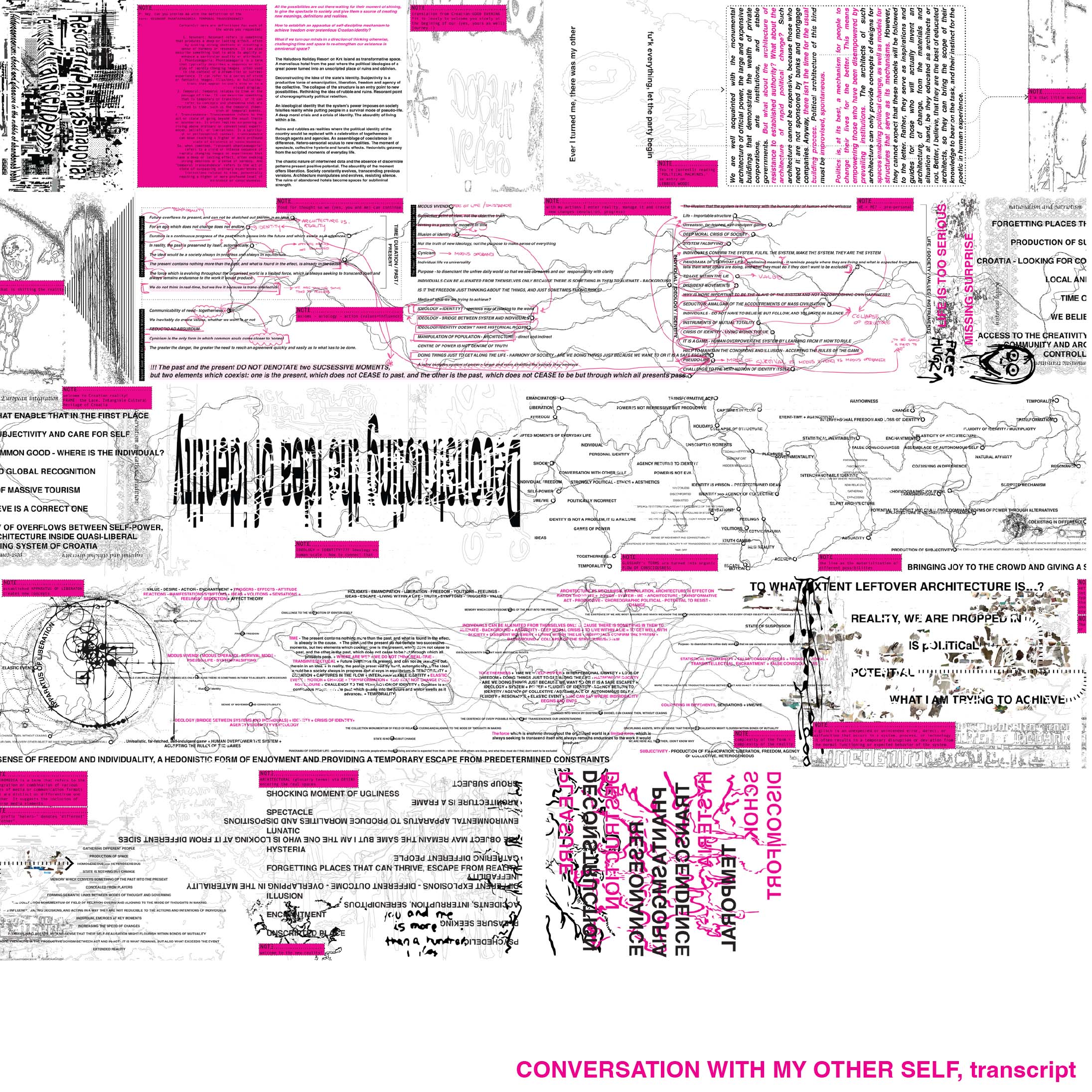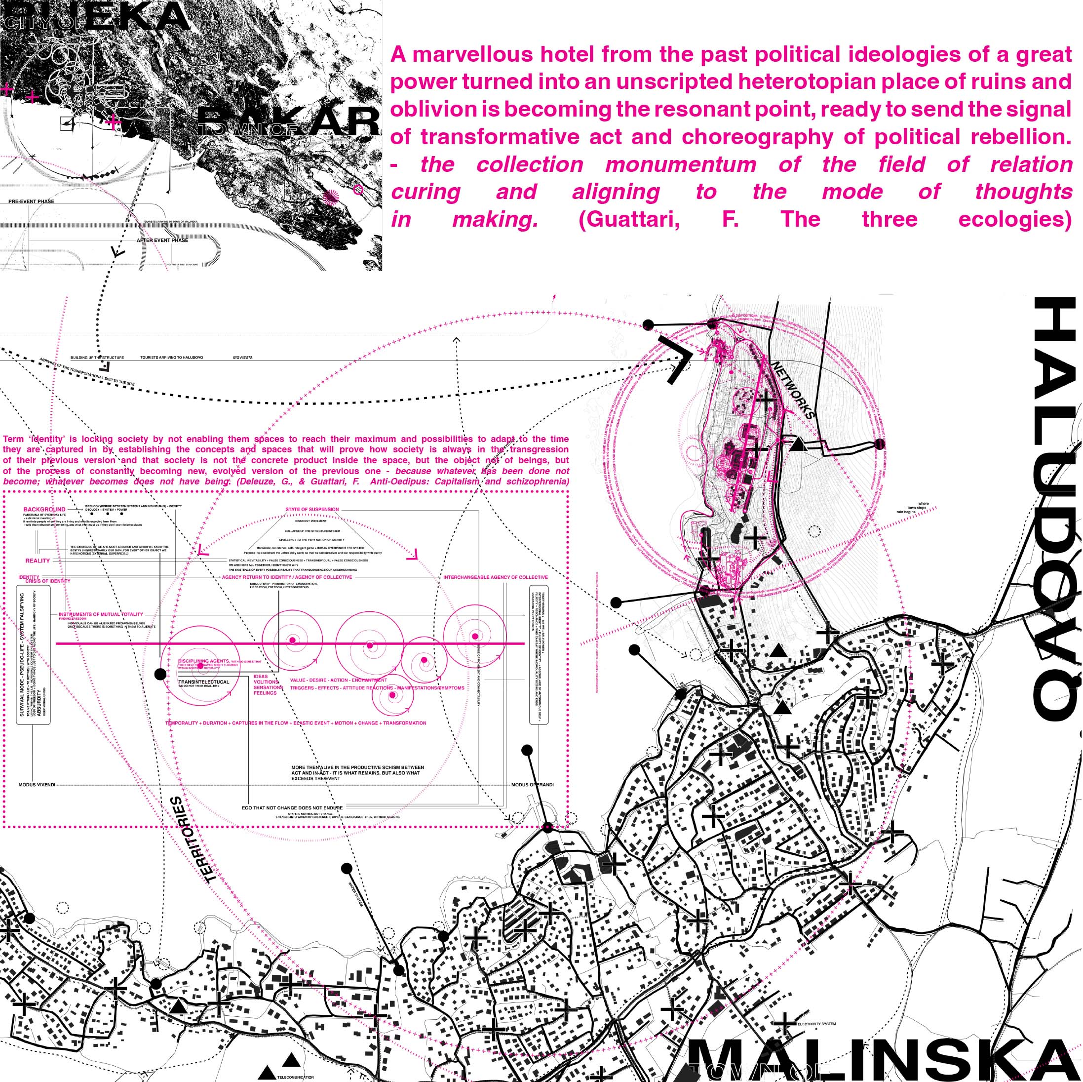 Haludovo kao transformativni prostor. Čudesan hotel iz prošlosti gdje su političke ideologije postale ruševine i zaborav. Dekonstrukcija identiteta države. Subjektivnost je snaga emancipacije i agencije kolektiva. Kolaps strukture otvara nove mogućnosti. Apsurdnost života unutar laži. Ruševine postaju stvarnosti gdje se politički identitet zamjenjuje slavljenjem zajedništva. Ovdje abnormalne funkcije arhitekture pozivaju tijelo da istražuje, gubeći orijentaciju i oslobađajući maštu da stvara nove stvarnosti.