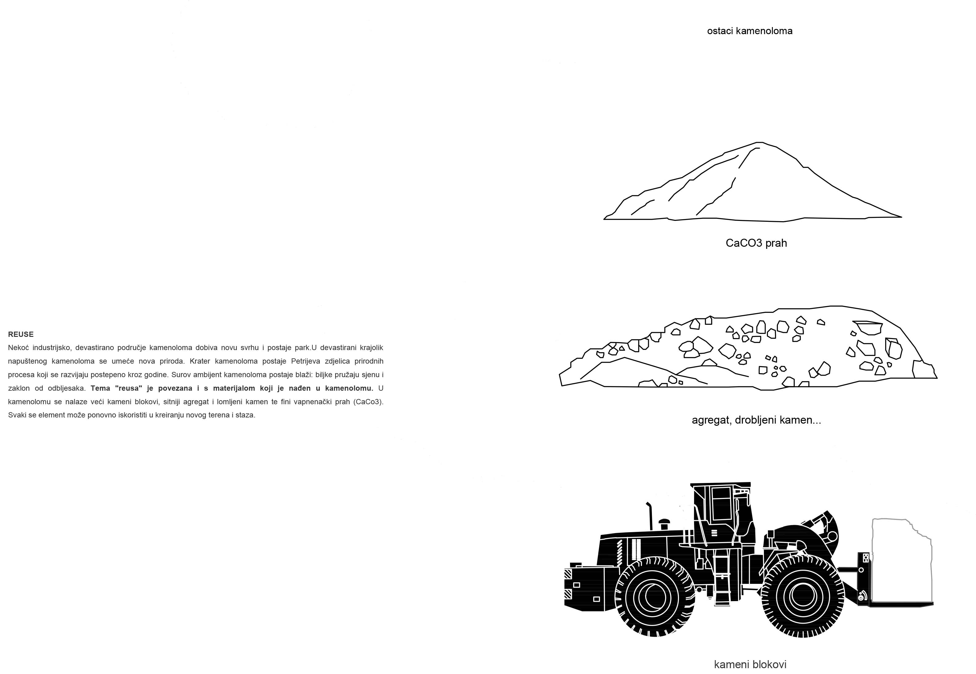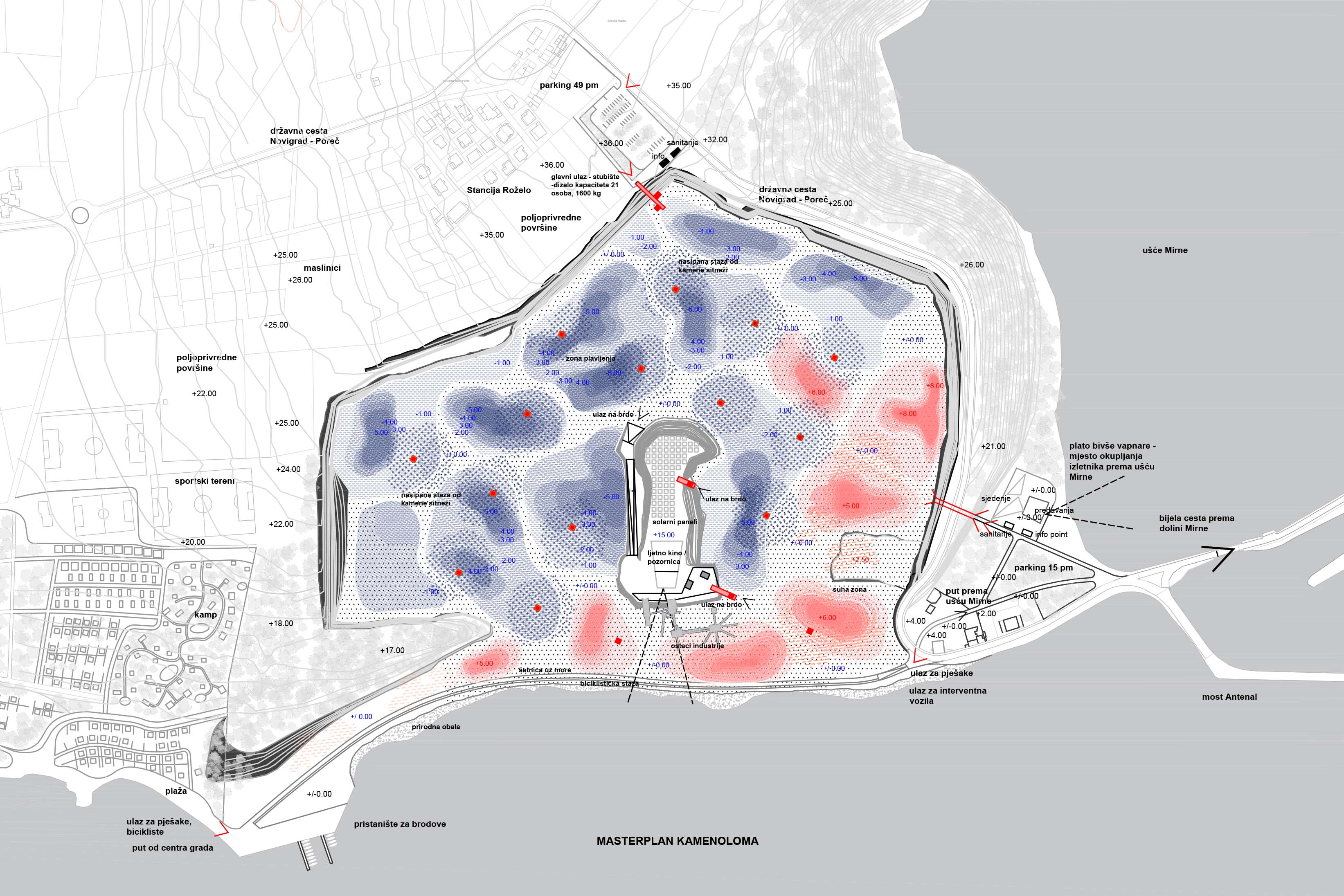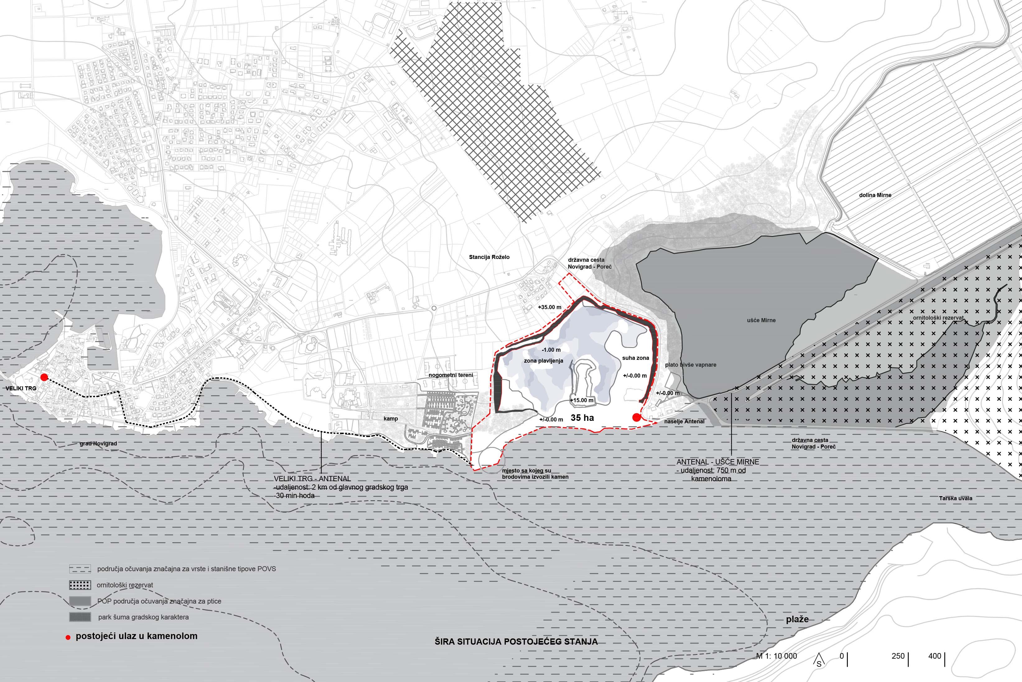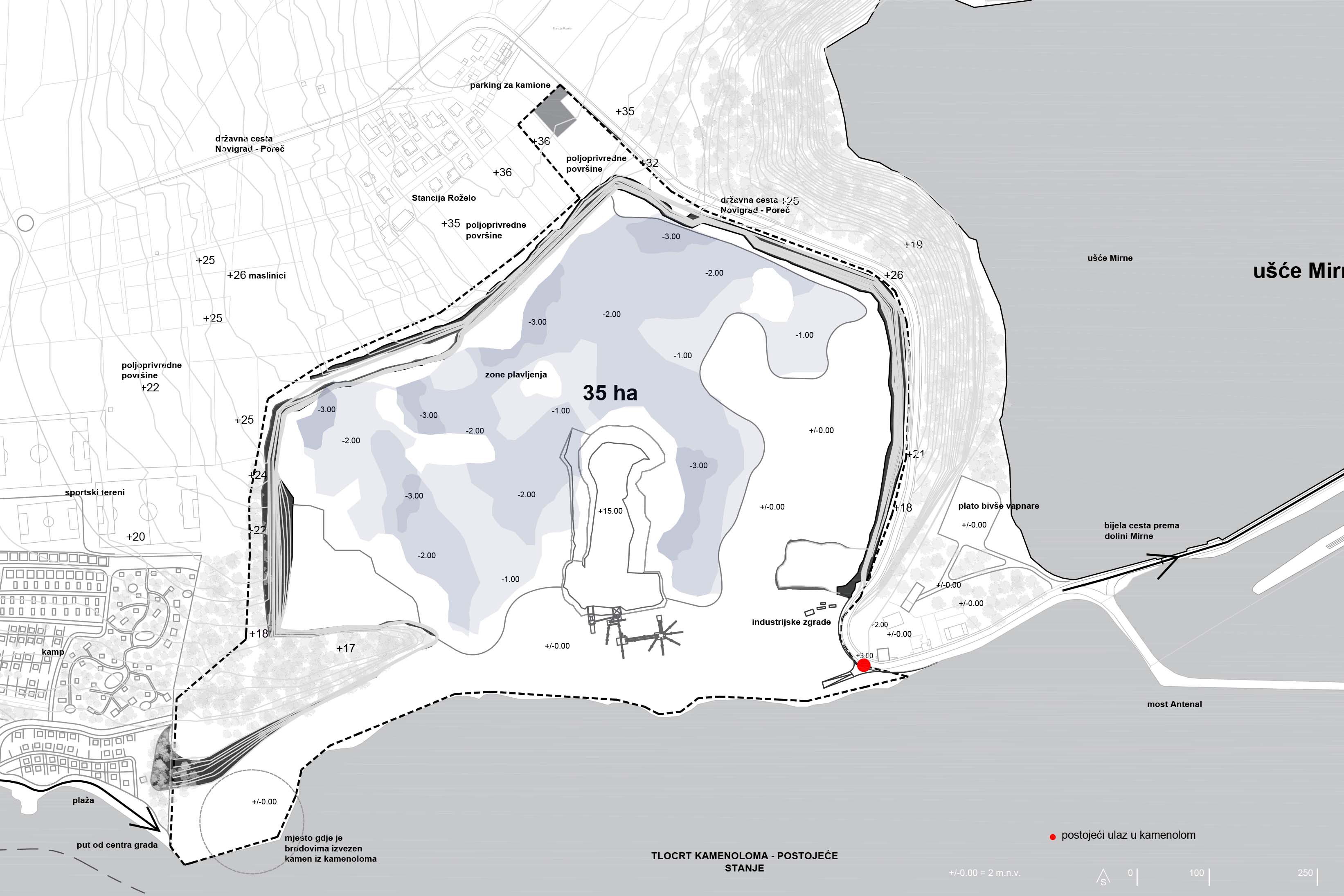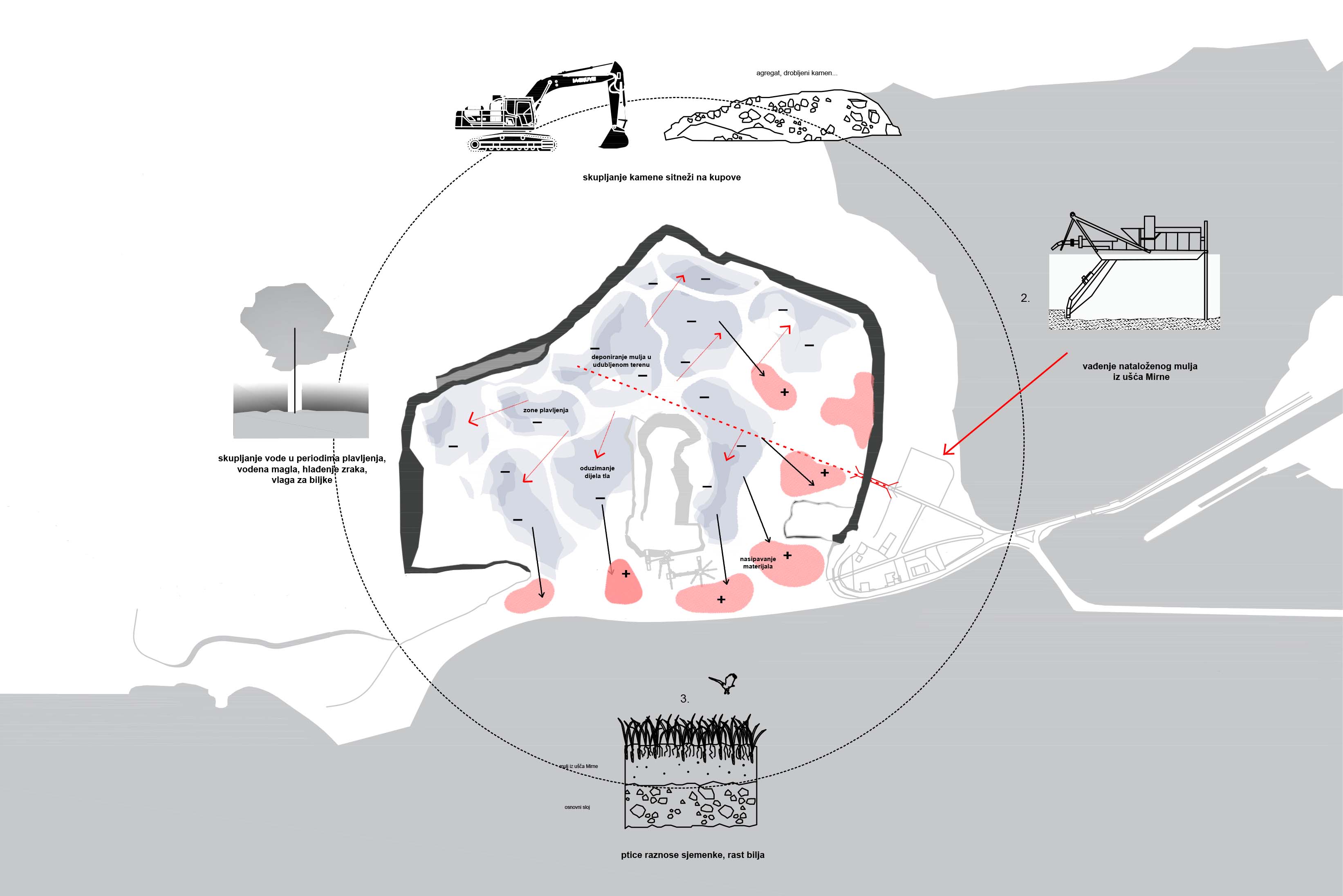 Konceptom se u nekoć industrijsko područje kamenoloma umeće nova priroda, a surov kontekst postaje park. Krater kamenoloma prepreka je u povezivanju dviju cjelina: grada Novigrada i ušća Mirne – ornitološkog rezervata, a povezivanjem tih dviju cjelina omogućilo bi se upoznavanje lokalnog stanovništva s vrijednim ušćem rijeke Mirne. Projektom se ostvaruju nove pješačke veze kroz kamenolom. On se postupno renaturira, klima u njemu postaje blaža, biljke pružaju sjenu i zaklon od odbljesaka, stvara se nova topografija. Nađeni materijal se ponovno koristi u kreiranju terena i staza.
