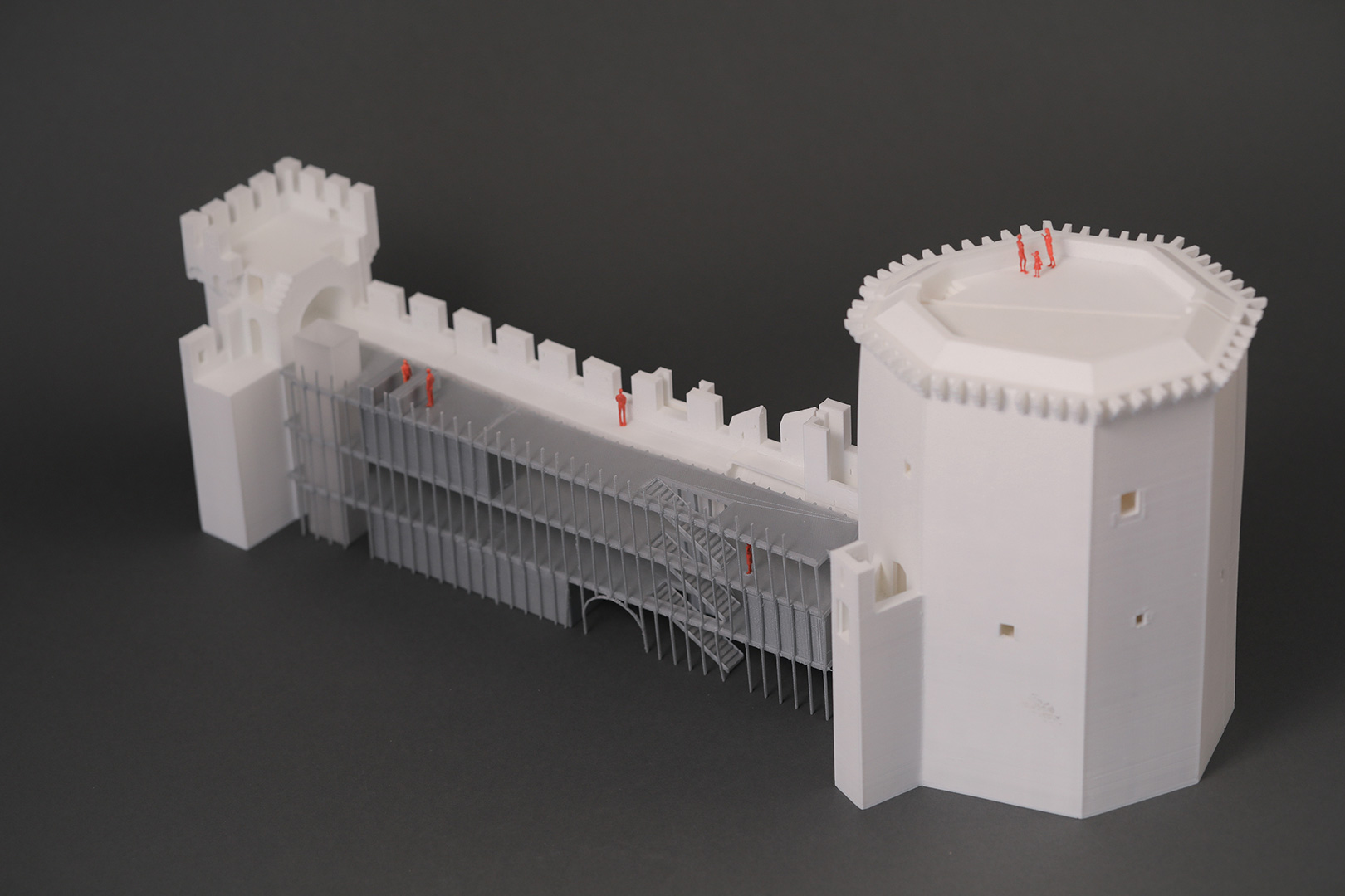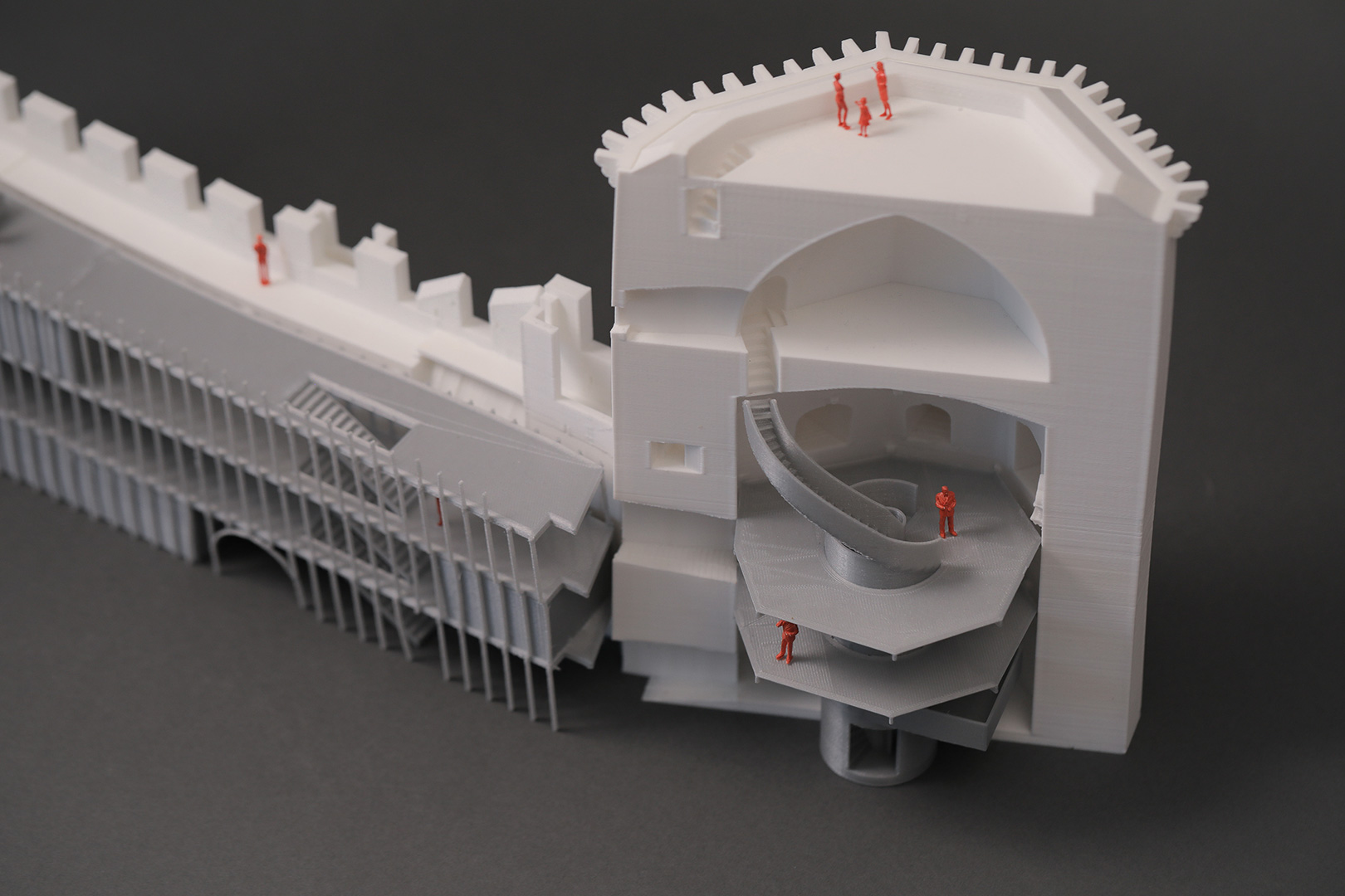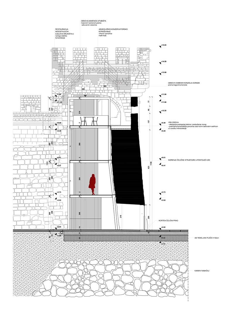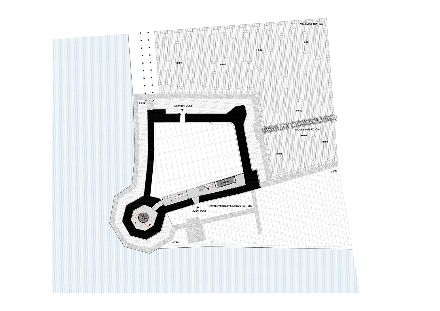 Precizan urbanistički rez, velik infrastrukturni zahvat s novom gradskom arkadom, ponovno ocrtava povijesnu konturu grada Trogira i formira novi javni prostor – park/otok. Niz manjih intervencija, laganih čeličnih struktura, osigurava infrastrukturu za ponovnu upotrebu ostataka srednjovjekovnog obrambenog sustava – kule sv. Marka i kaštela Kamerlengo. Najveća od njih, struktura u dvorištu kaštela, prislanja se uz južni dvorišni kameni zid pridržavajući pritom njegovu narušenu stabilnost.