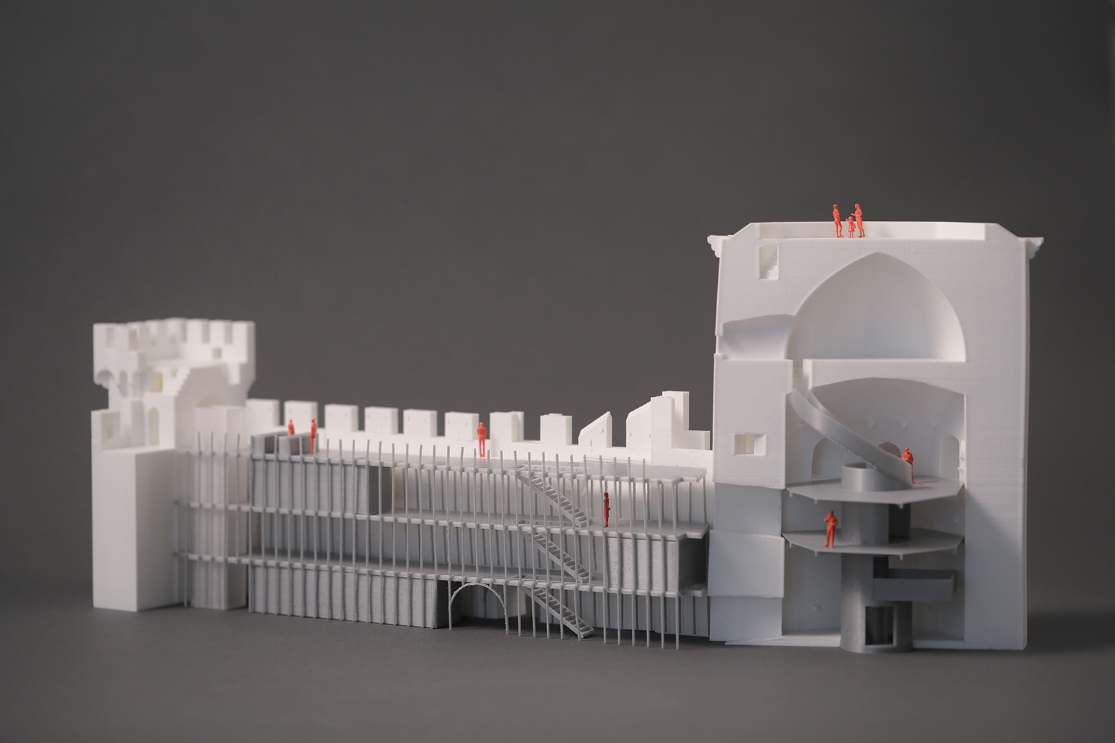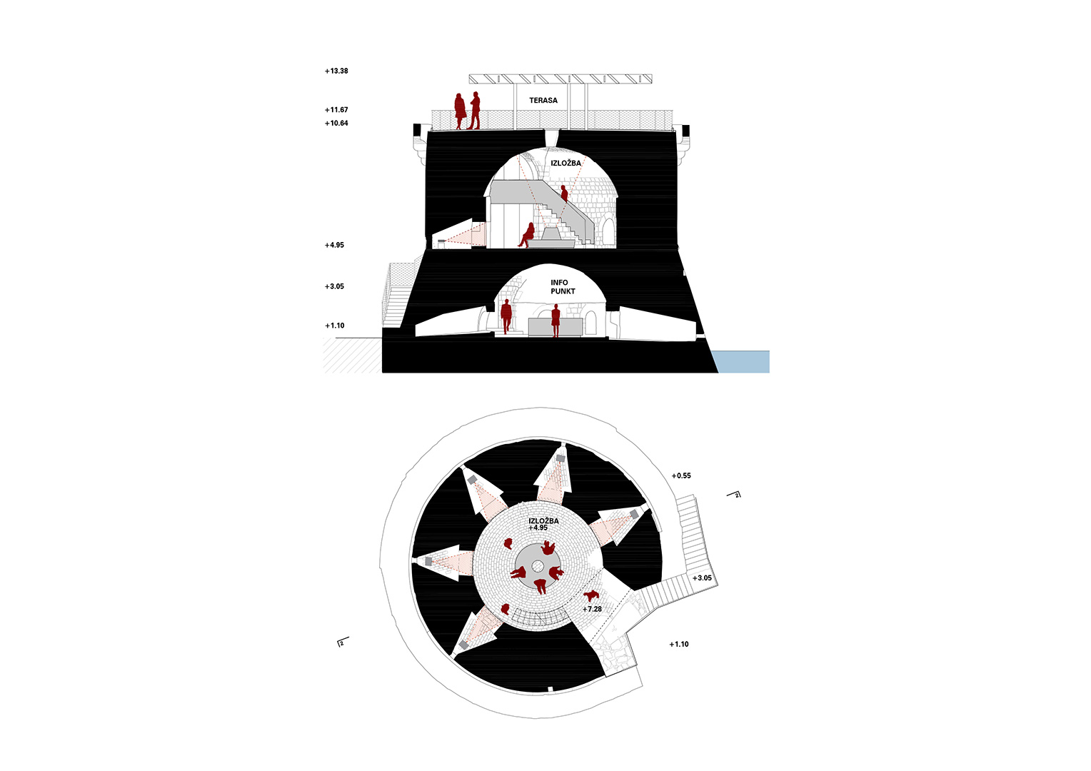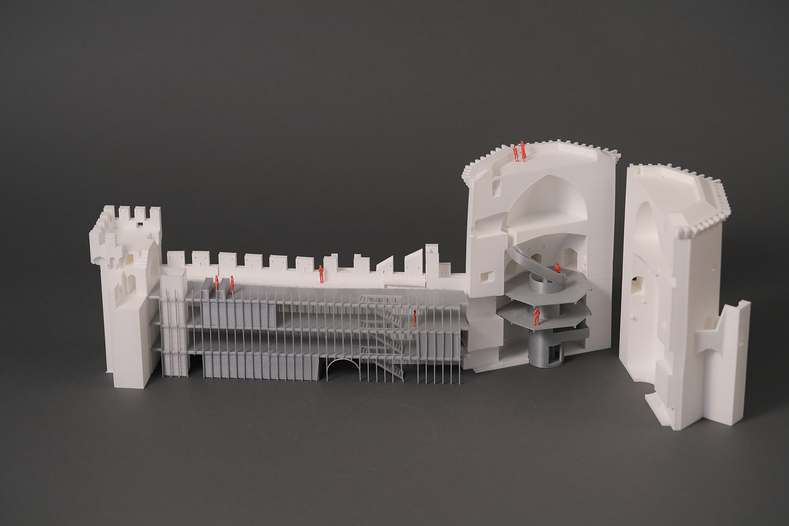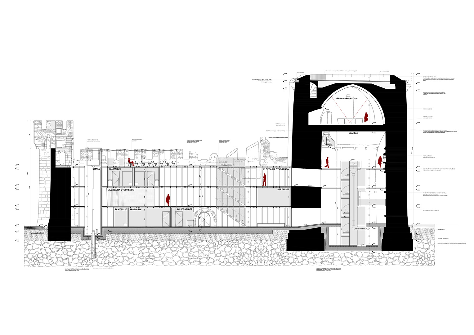 Precizan urbanistički rez, velik infrastrukturni zahvat s novom gradskom arkadom, ponovno ocrtava povijesnu konturu grada Trogira i formira novi javni prostor – park/otok. Niz manjih intervencija, laganih čeličnih struktura, osigurava infrastrukturu za ponovnu upotrebu ostataka srednjovjekovnog obrambenog sustava – kule sv. Marka i kaštela Kamerlengo. Najveća od njih, struktura u dvorištu kaštela, prislanja se uz južni dvorišni kameni zid pridržavajući pritom njegovu narušenu stabilnost.
