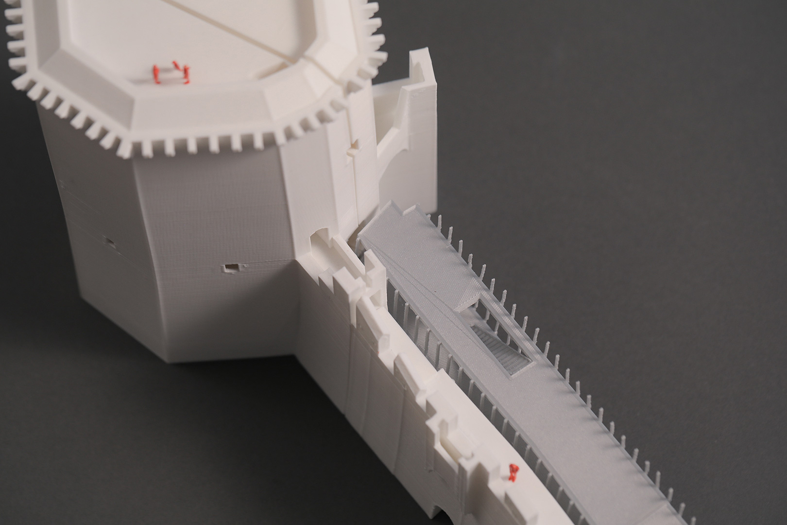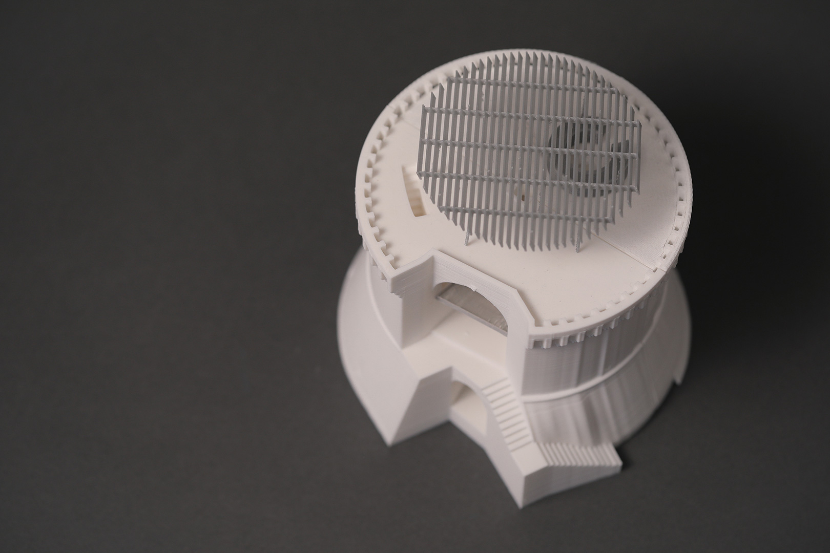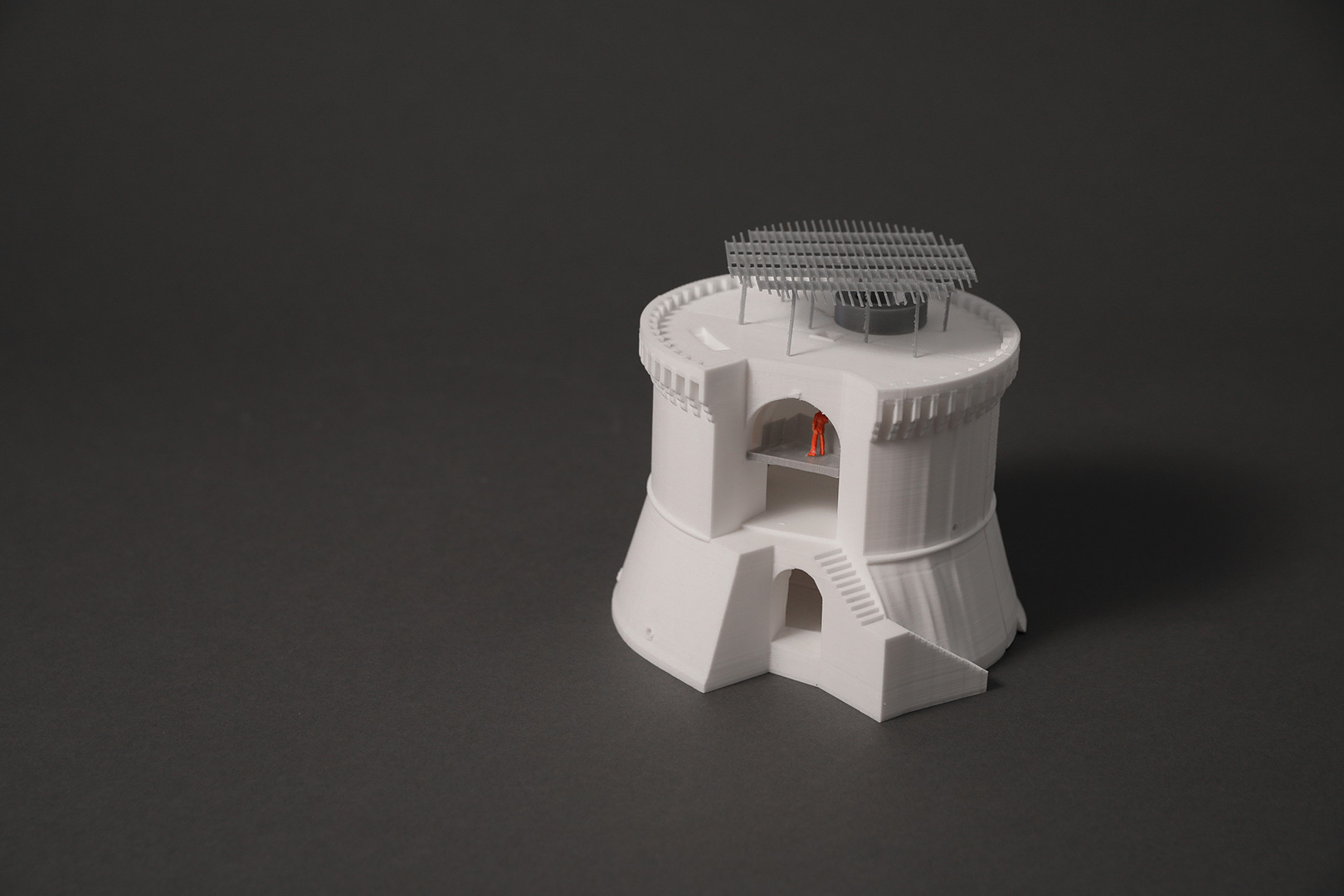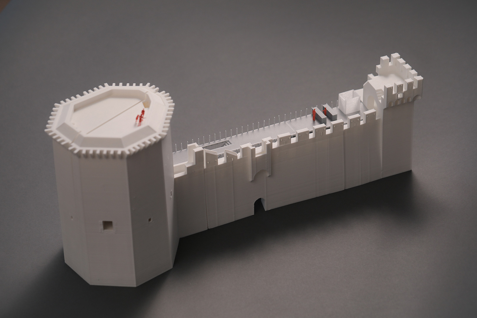Precizan urbanistički rez, velik infrastrukturni zahvat s novom gradskom arkadom, ponovno ocrtava povijesnu konturu grada Trogira i formira novi javni prostor – park/otok. Niz manjih intervencija, laganih čeličnih struktura, osigurava infrastrukturu za ponovnu upotrebu ostataka srednjovjekovnog obrambenog sustava – kule sv. Marka i kaštela Kamerlengo. Najveća od njih, struktura u dvorištu kaštela, prislanja se uz južni dvorišni kameni zid pridržavajući pritom njegovu narušenu stabilnost.