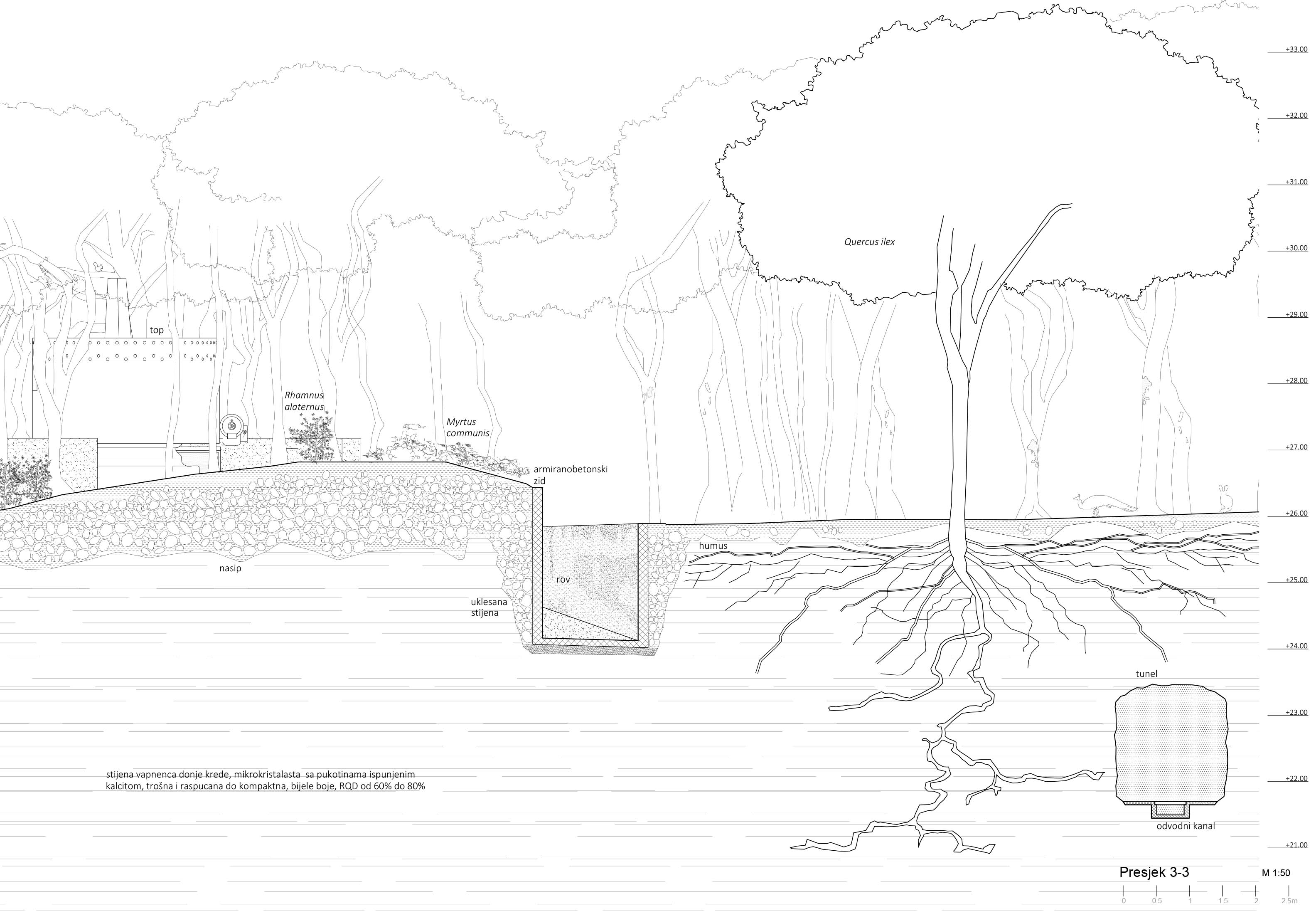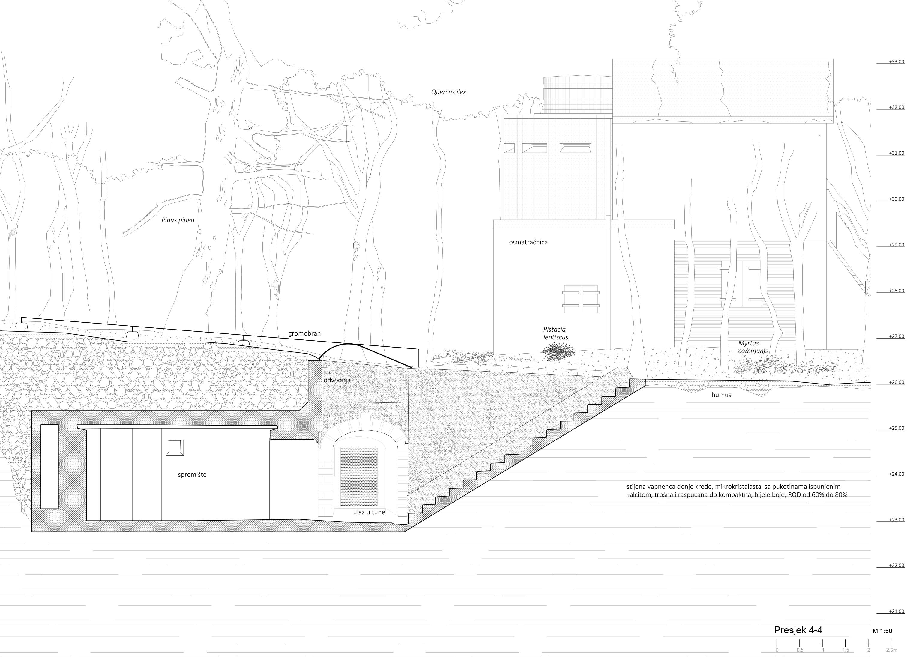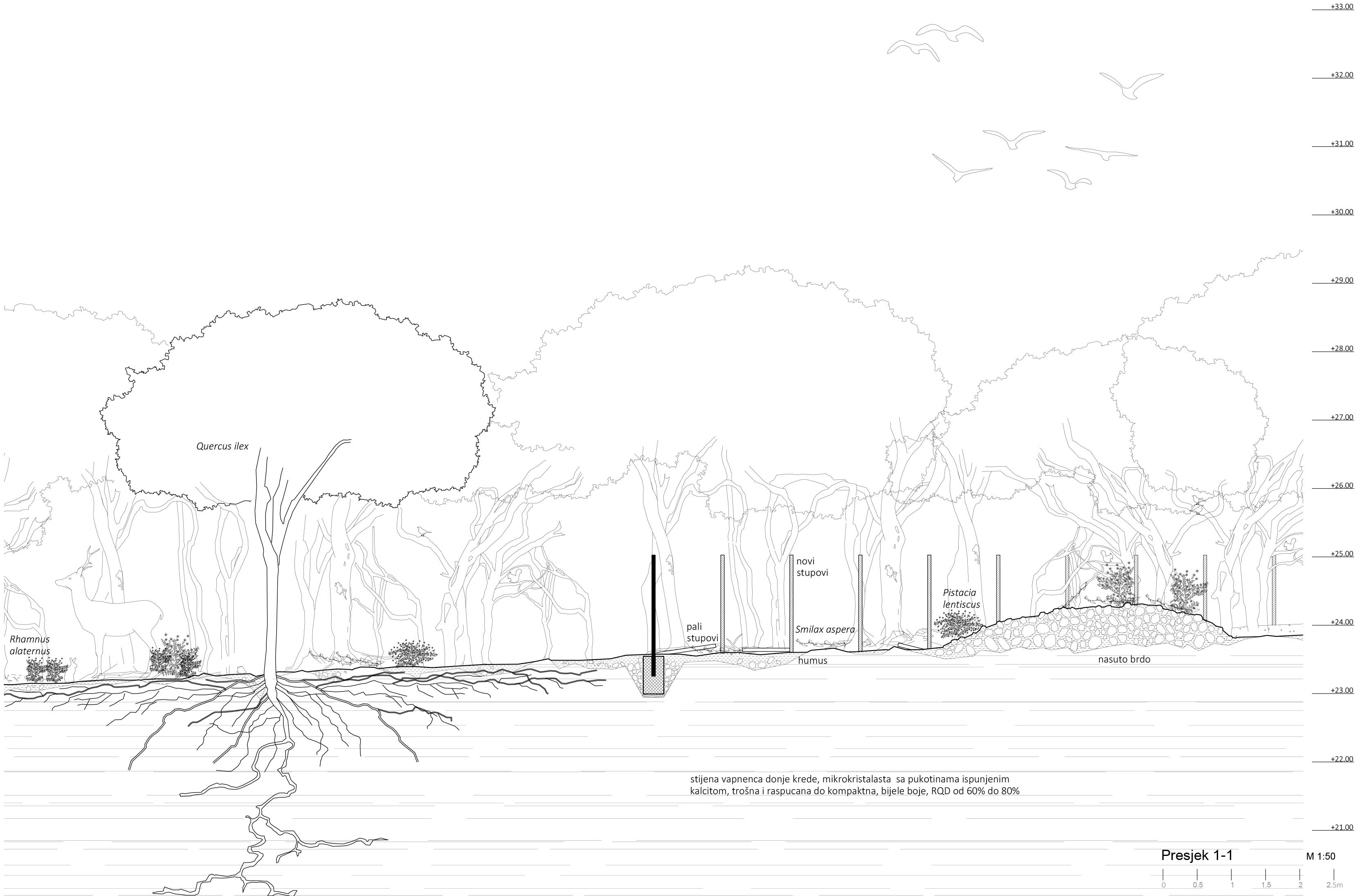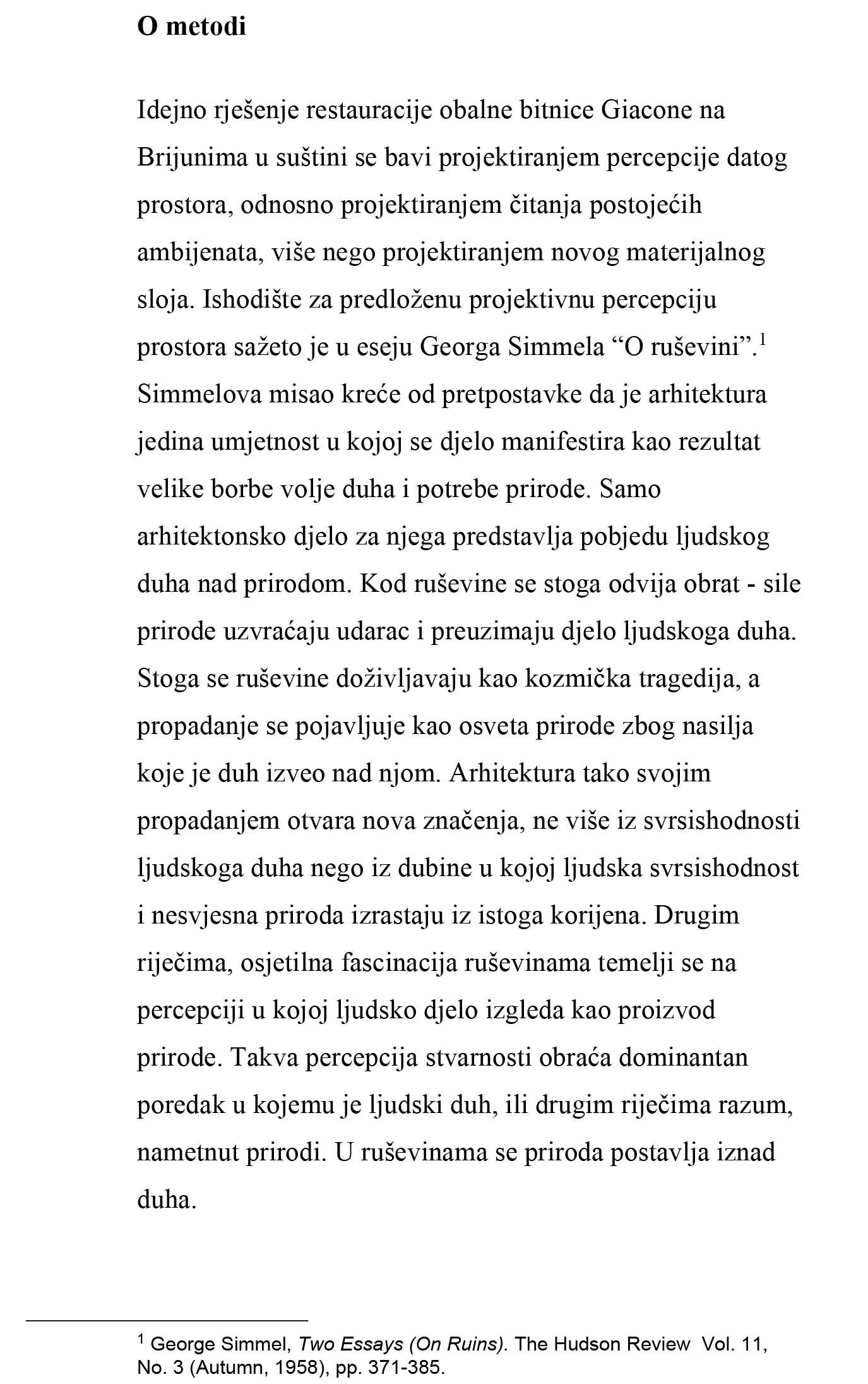 Idejno rješenje restauracije austrougarske topničke obalne bitnice Giacone na otoku Veliki Brijun u suštini se bavi projektiranjem percepcije datog prostora, odnosno projektiranjem čitanja postojećih ambijenata, više nego projektiranjem novog materijalnog sloja koji bi se dodao u vidu građenja. Vođen pretpostavkom da se u ruševinama odvija obrat ljudskog duha i prirode, projekt sagledava prostor prvenstveno kroz dijalektički odnos prirode i prisutnosti ljudskih tragova – onoga što je preostalo.