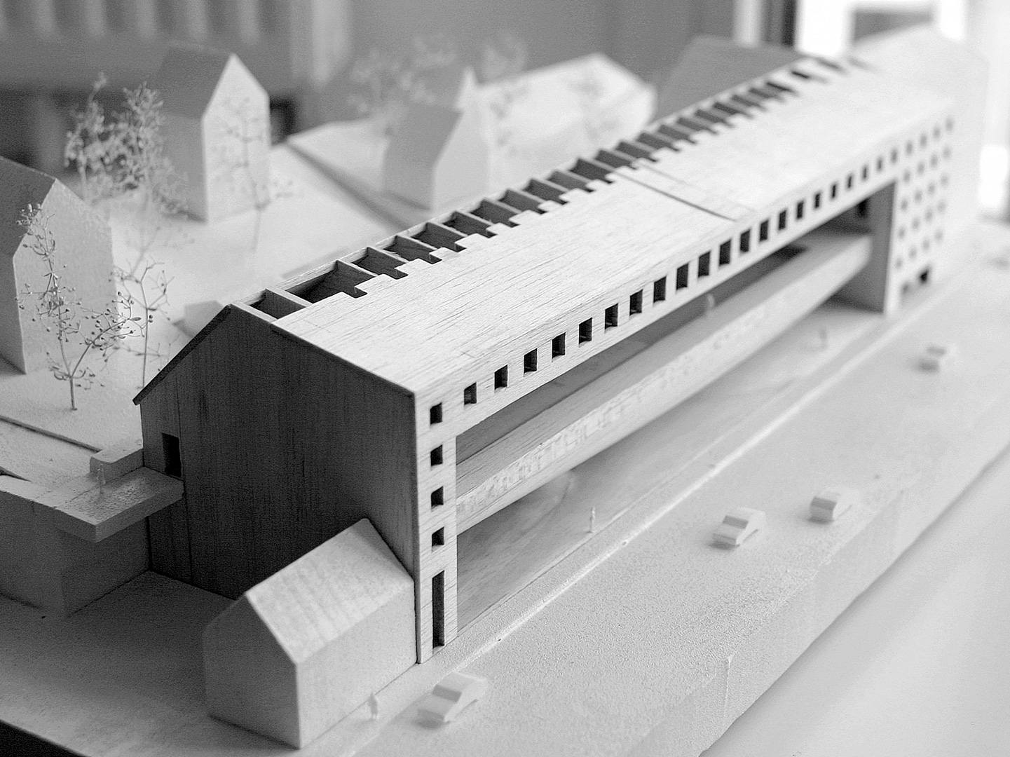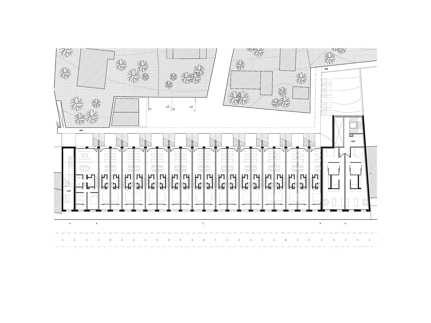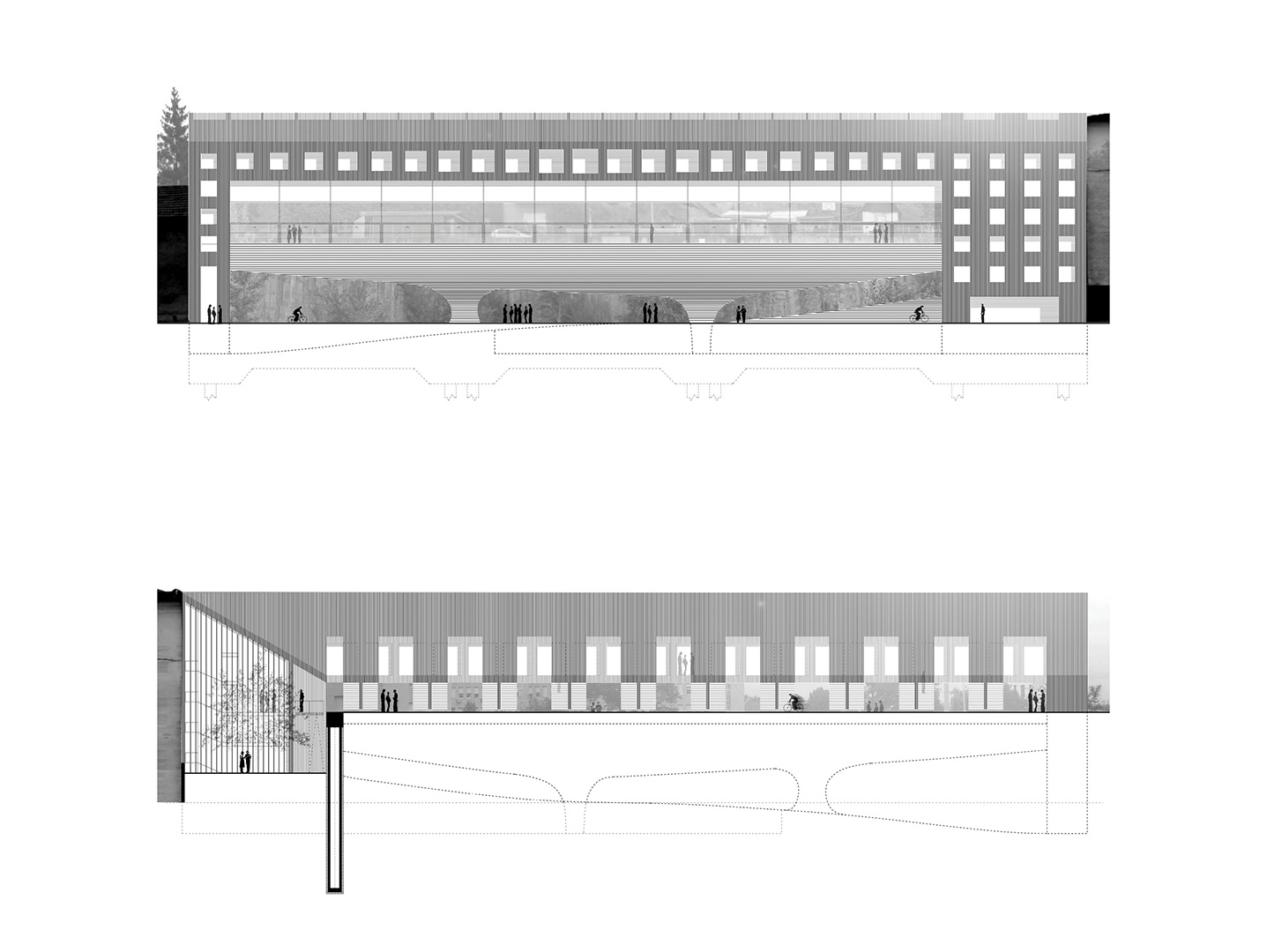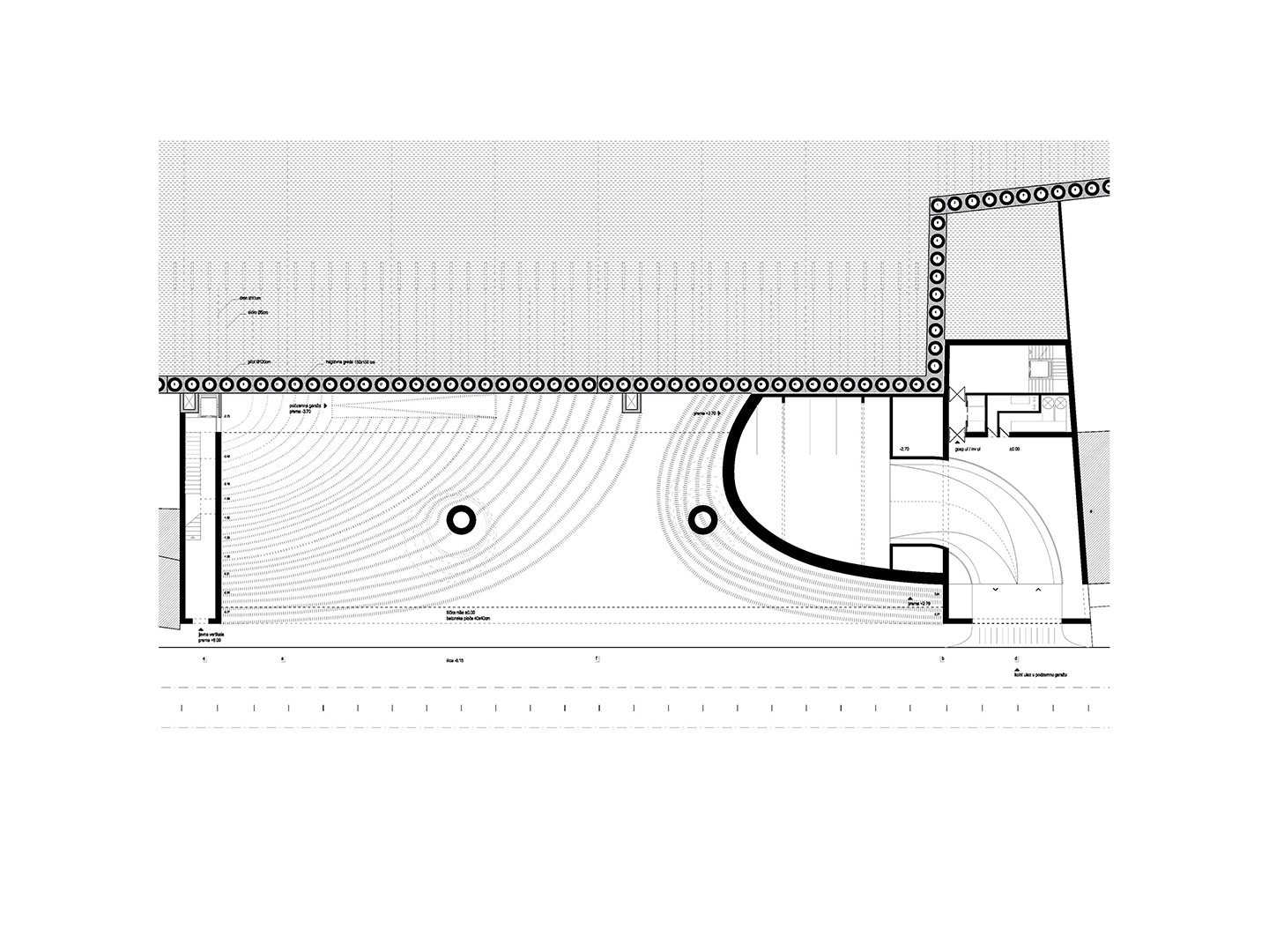 Interpolacija nije samo medij / patch / adapter između onog što je lijevo (malena obiteljska kuća) i onog što je desno (višestambena zgrada); već i onog što je straga (mirno susjedstvo obiteljskih kuća na obroncima) i onog što je sprijeda (prometna gradska ulica); između onog što je ispod (ilička niša) i onog što je iznad (veliki potporni zid); onog što je bilo (obraslo parkiralište podno klizišta Grmoščica) i onog što će tek biti (bazenska dvorana suburbanoga zagrebačkog naselja). Novi bazen interpoliran je između sadržajnih zabata te ulične špilje ispod i stambenog niza iznad.