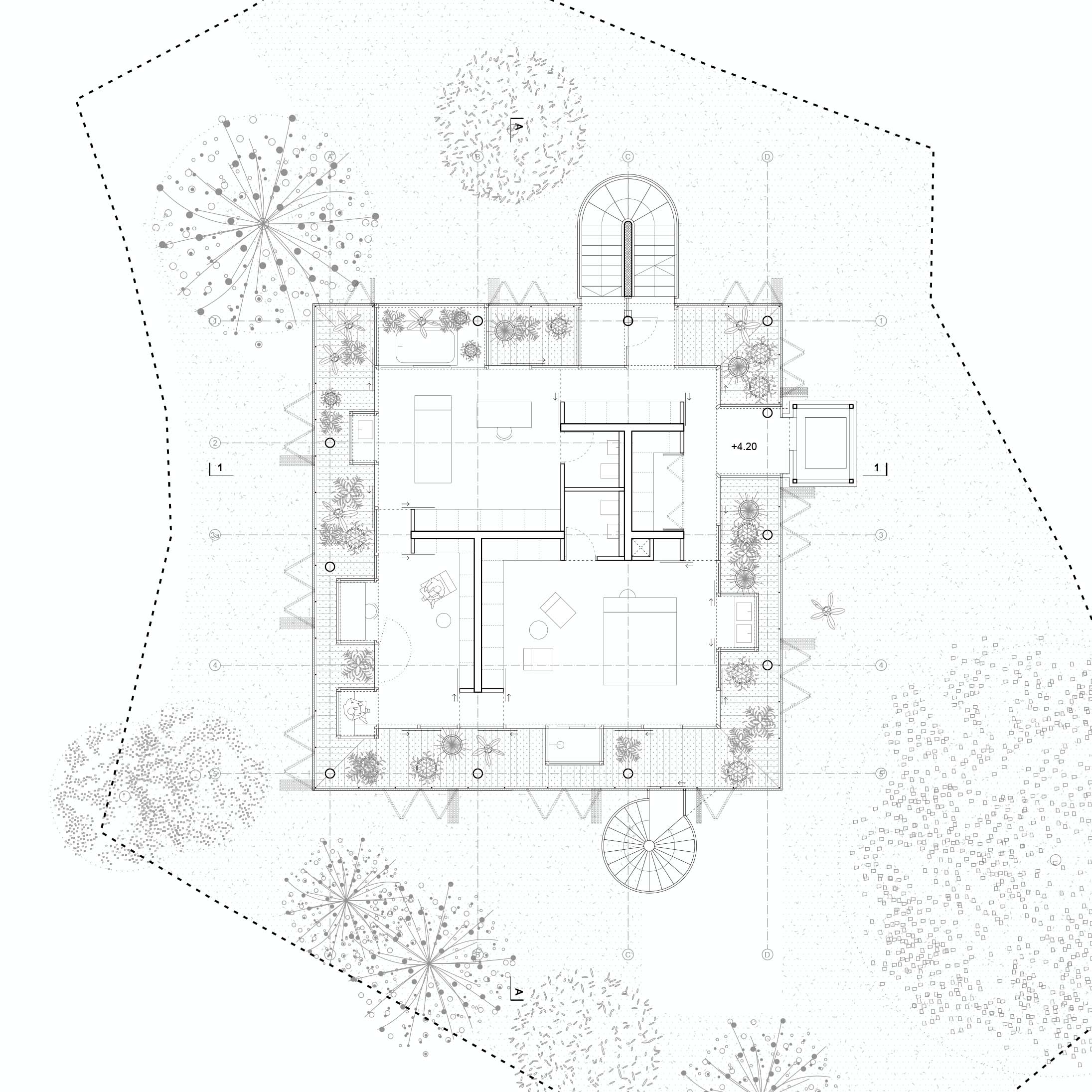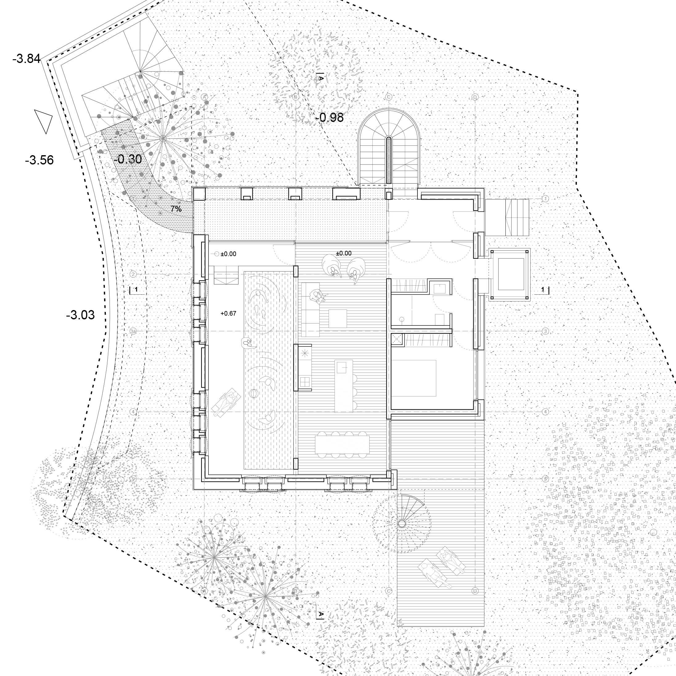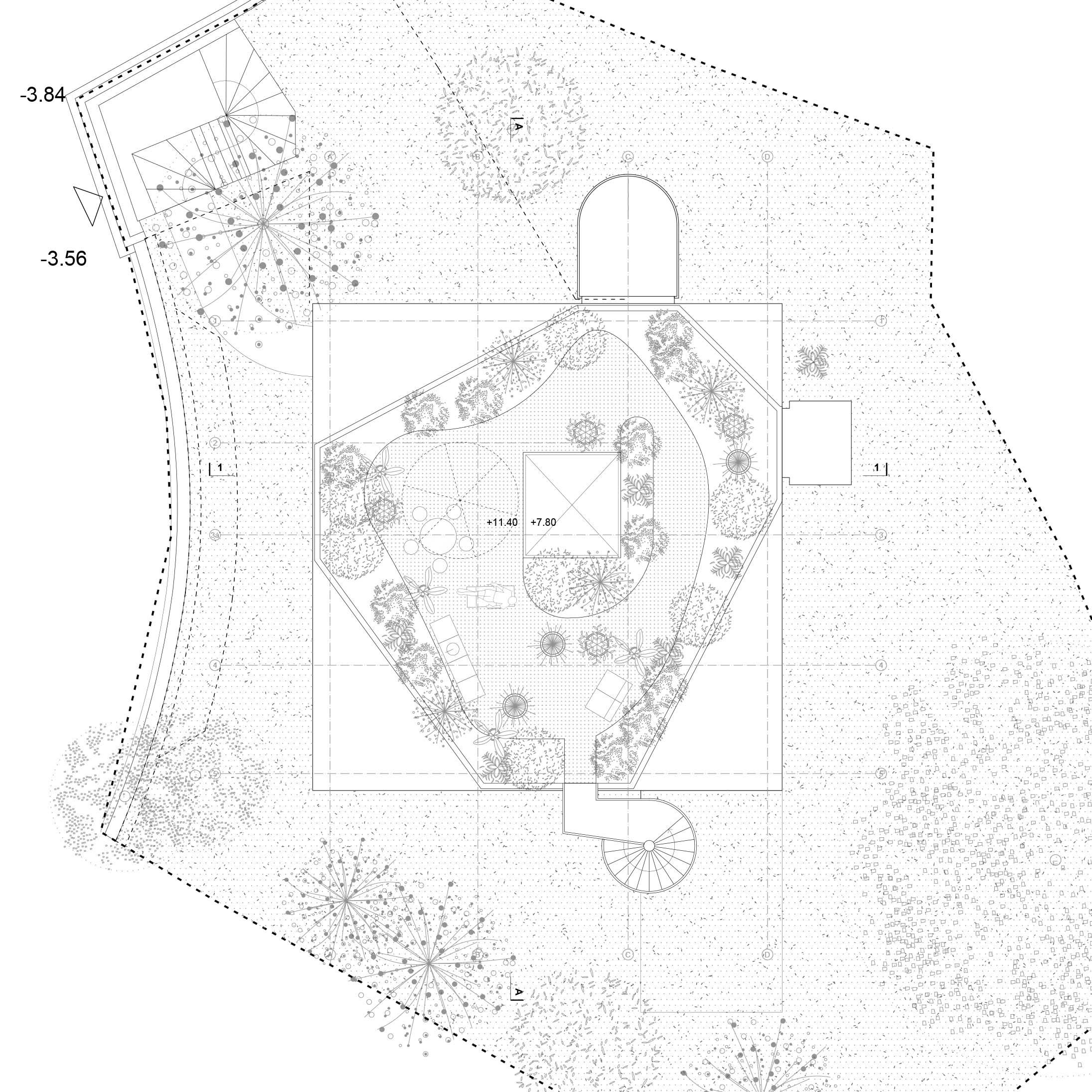 Trokatna zatečena struktura na gradskim padinama, koja je u više etapa nadograđivana, resetirana je nanovo u ladanjski kompleks. Izvorna ladanjska prizemnica podgrađuje se servisnim sadržajima garaže i kinodvorane, a nadograđuje katom centrifugalne enfilade smještajnih prostora obitelji nad kojim je smješten krovni paviljon s četiri perimetralne terase i skrivenim centralnim dvorištem za čitanje.
