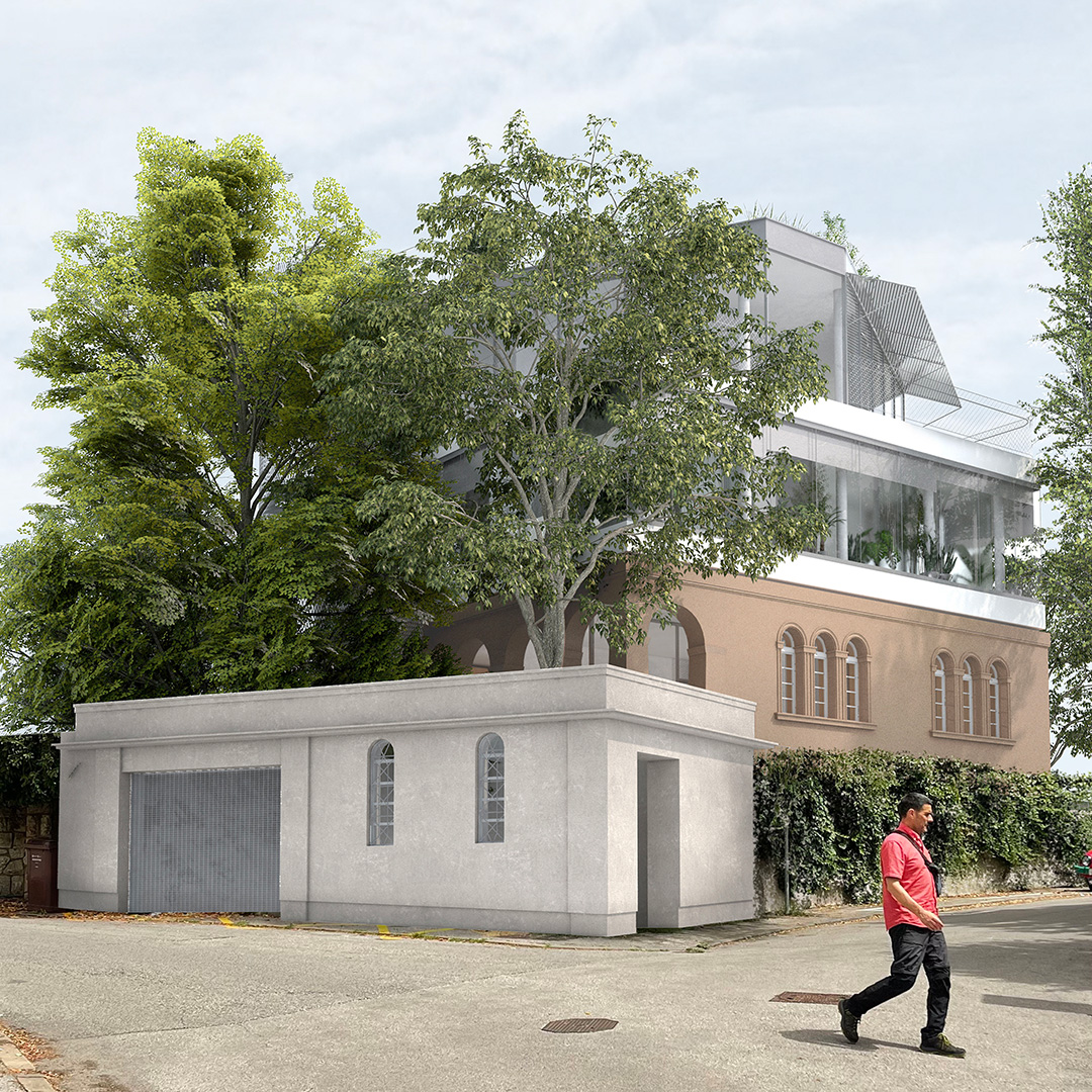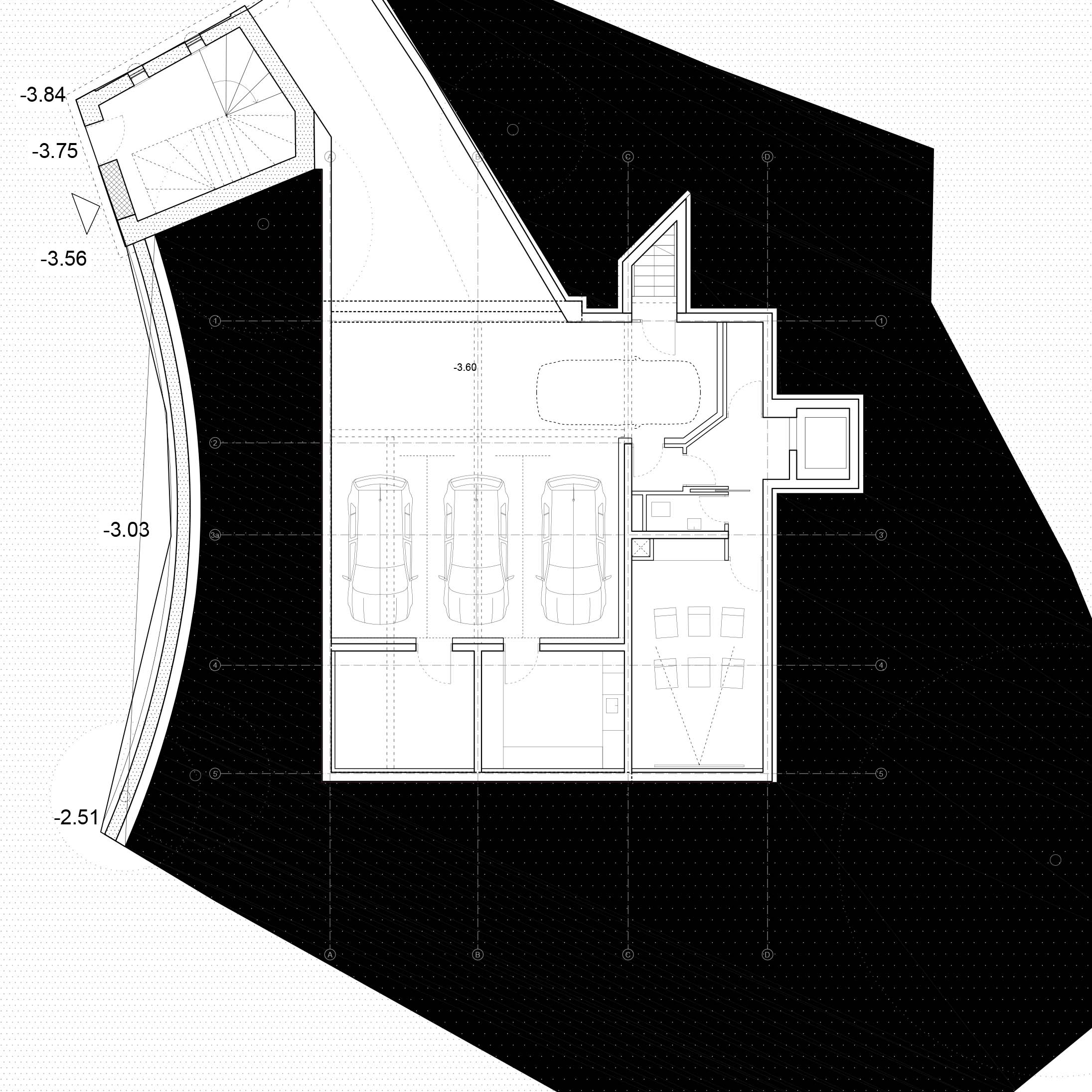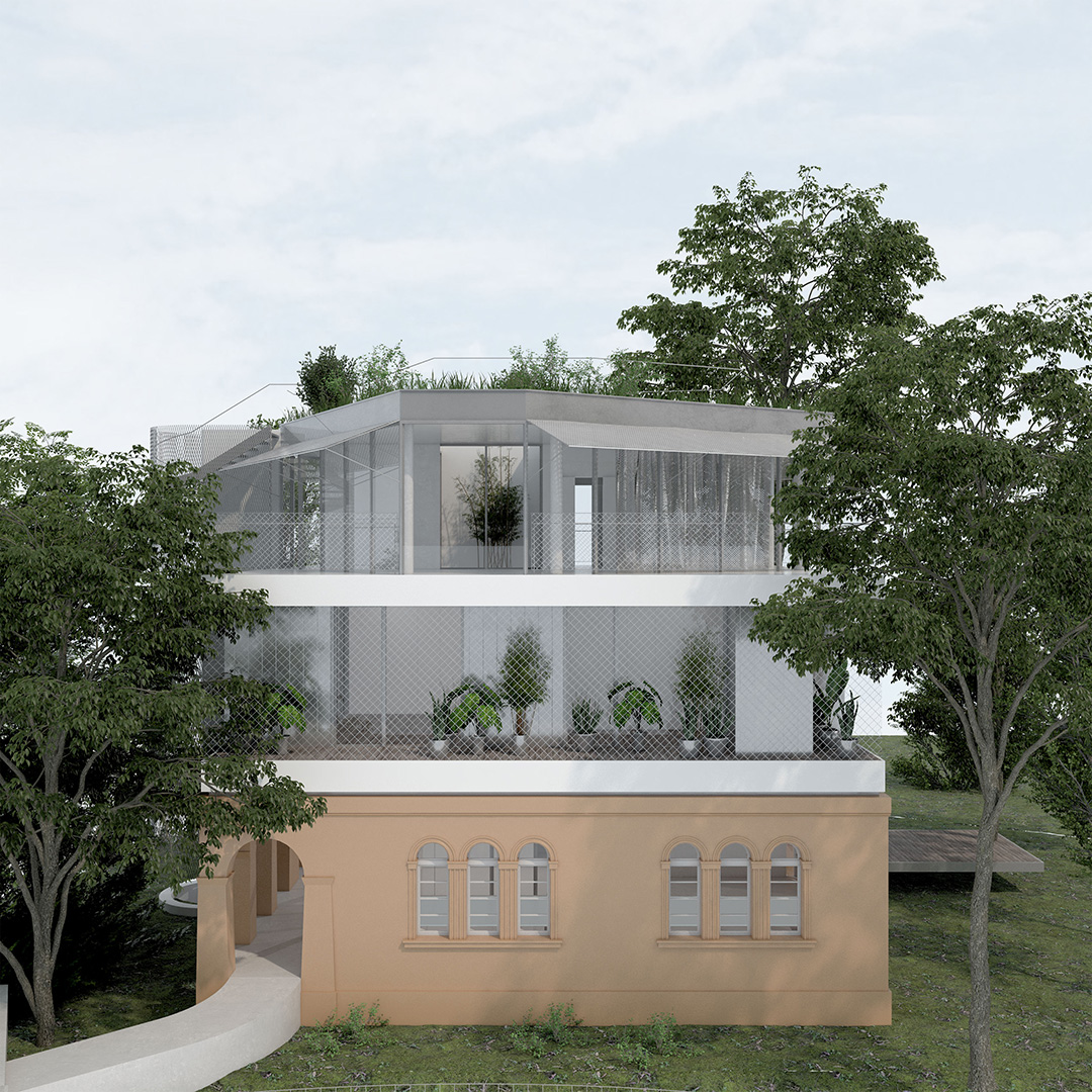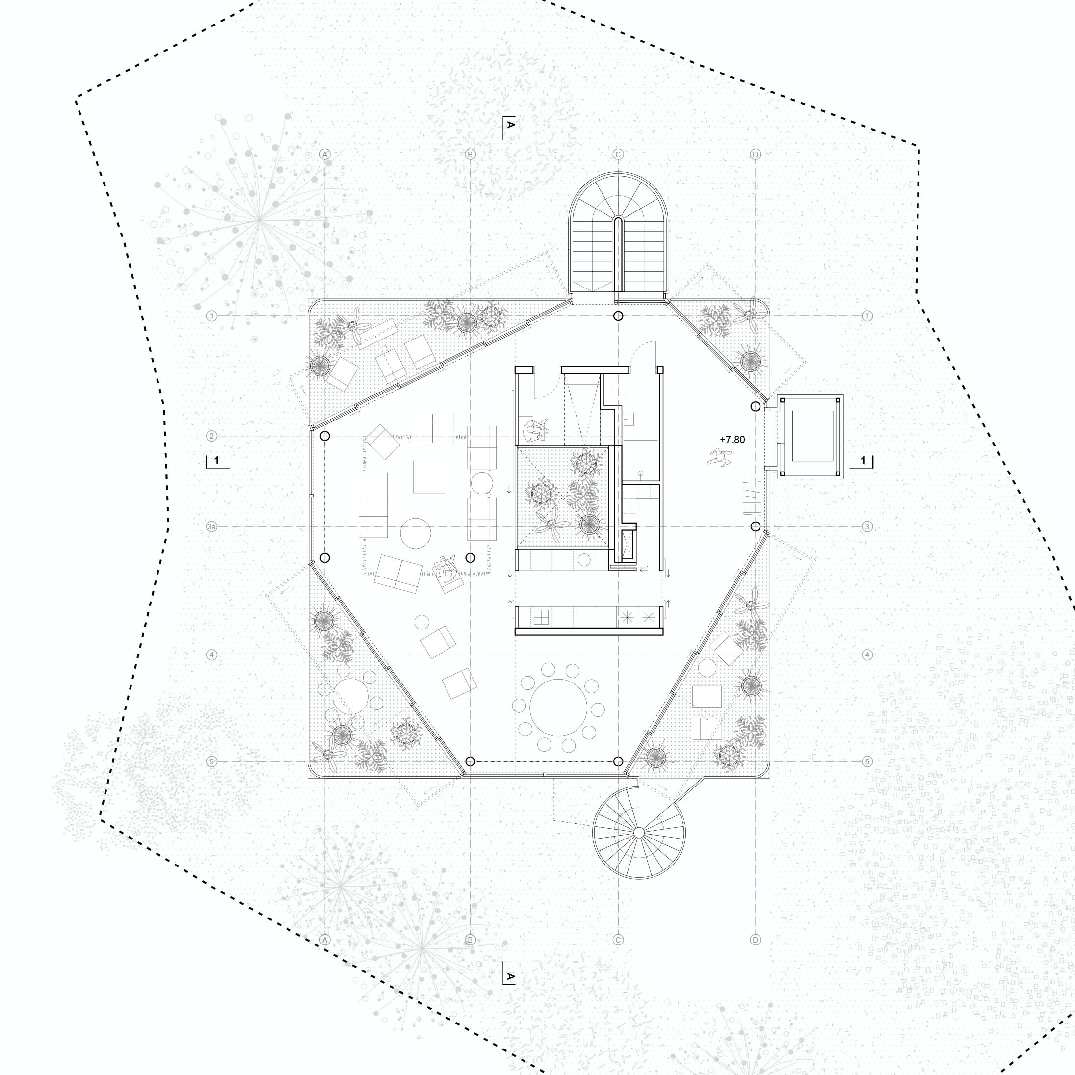 Trokatna zatečena struktura na gradskim padinama, koja je u više etapa nadograđivana, resetirana je nanovo u ladanjski kompleks. Izvorna ladanjska prizemnica podgrađuje se servisnim sadržajima garaže i kinodvorane, a nadograđuje katom centrifugalne enfilade smještajnih prostora obitelji nad kojim je smješten krovni paviljon s četiri perimetralne terase i skrivenim centralnim dvorištem za čitanje.