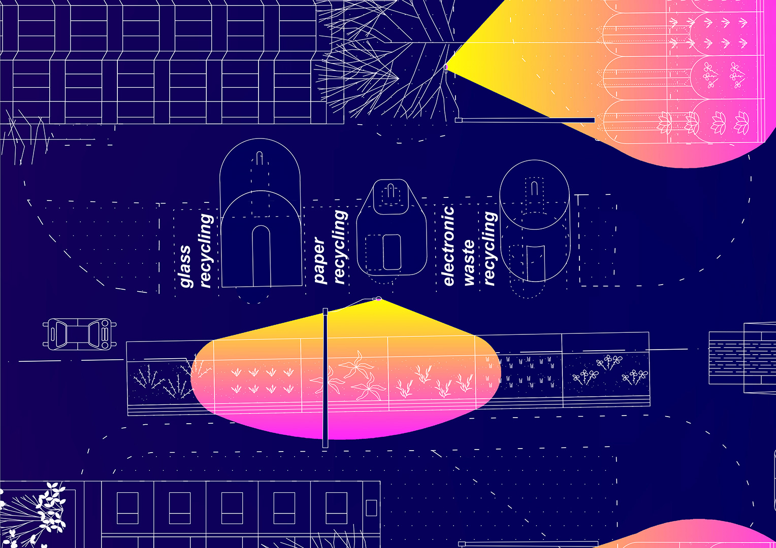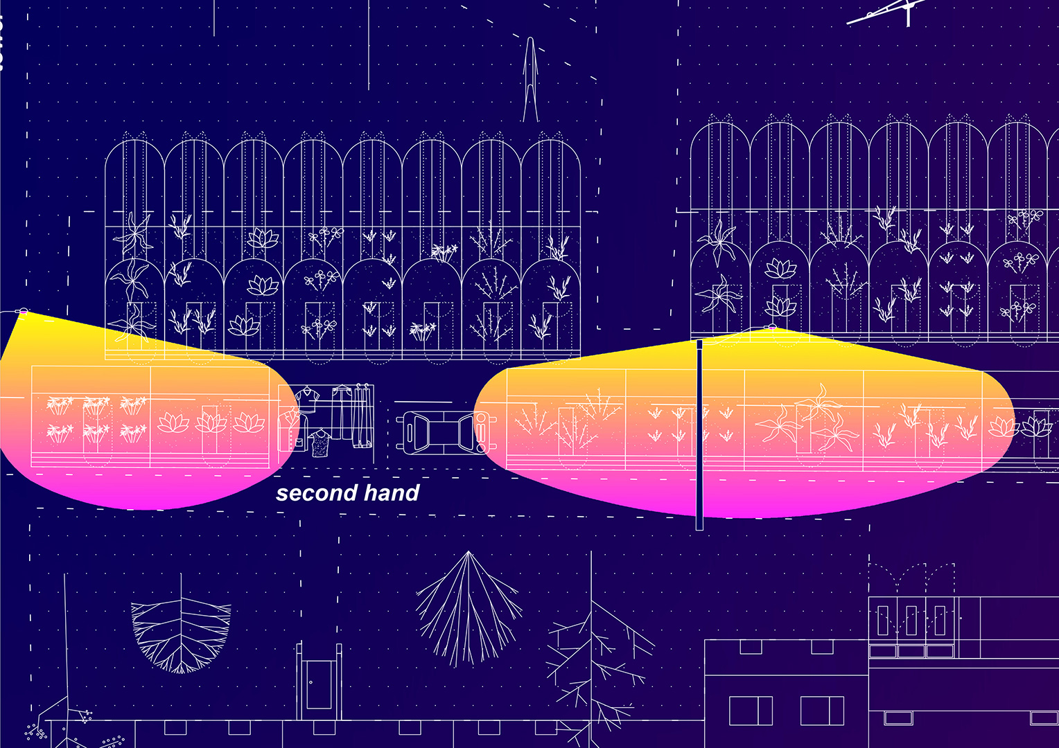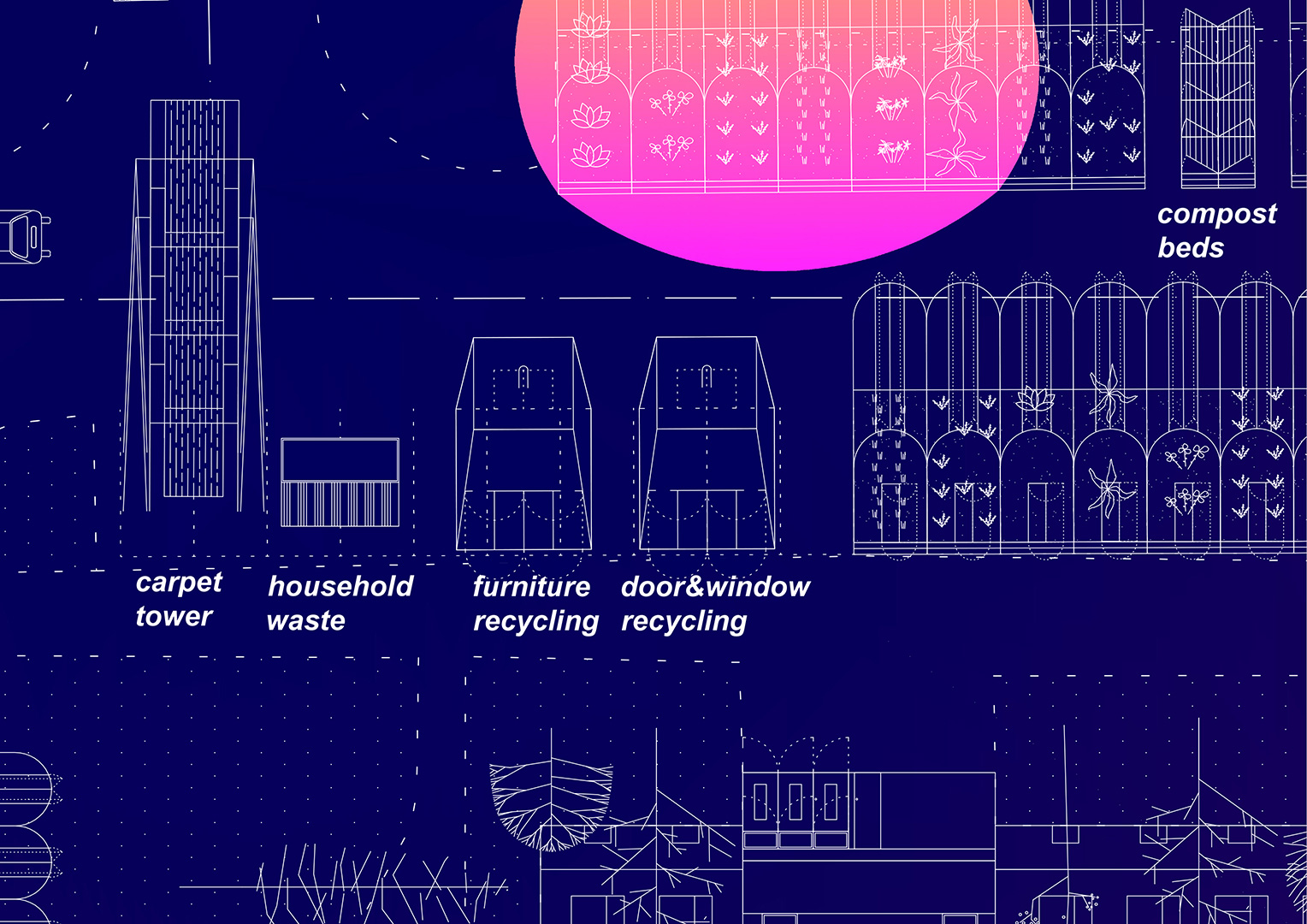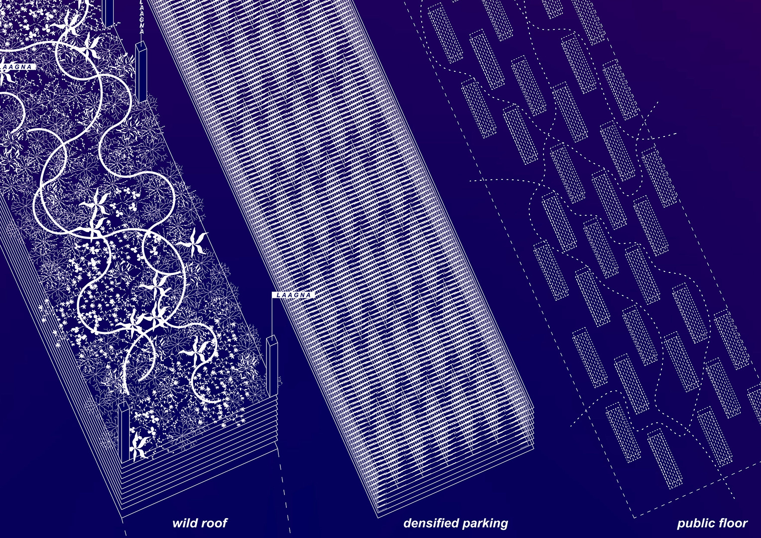 Projektno područje uspavano je predgrađe Laagna. Dominiraju zgrade hruščovke. Strogo kontroliranom okolišu suprotstavljaju se divlji vrtovi za oprašivače na krovovima zgrada. Parkirna mjesta s ulica premještena su u novi centar – megastrukturu koja povezuje cestom odsječene polutke naselja. Oslobođeni teritorij ulice dobiva metabolizam i identitet: služi razmjeni, proizvodnji hrane i mjesto je druženja. Stvari se recikliraju u šaljivim paviljonima. Staklenici su posvuda, a ulična rasvjeta, sada hakirana za rast biljaka, postaje novo gnojivo ovoga jestivog urbanizma.
