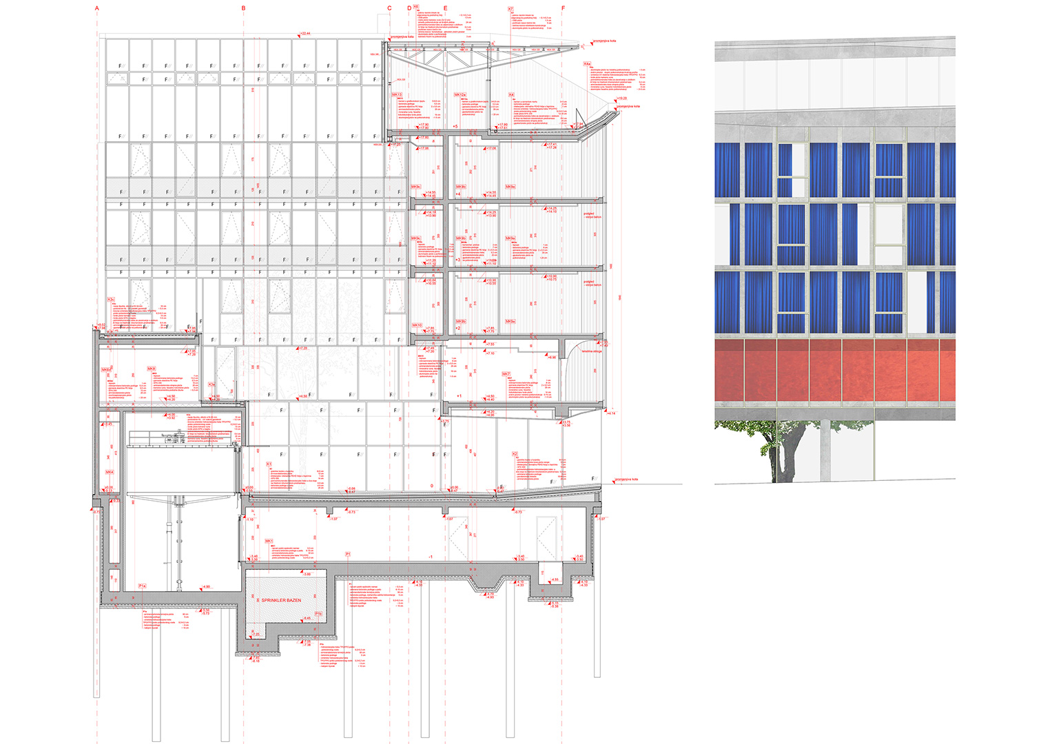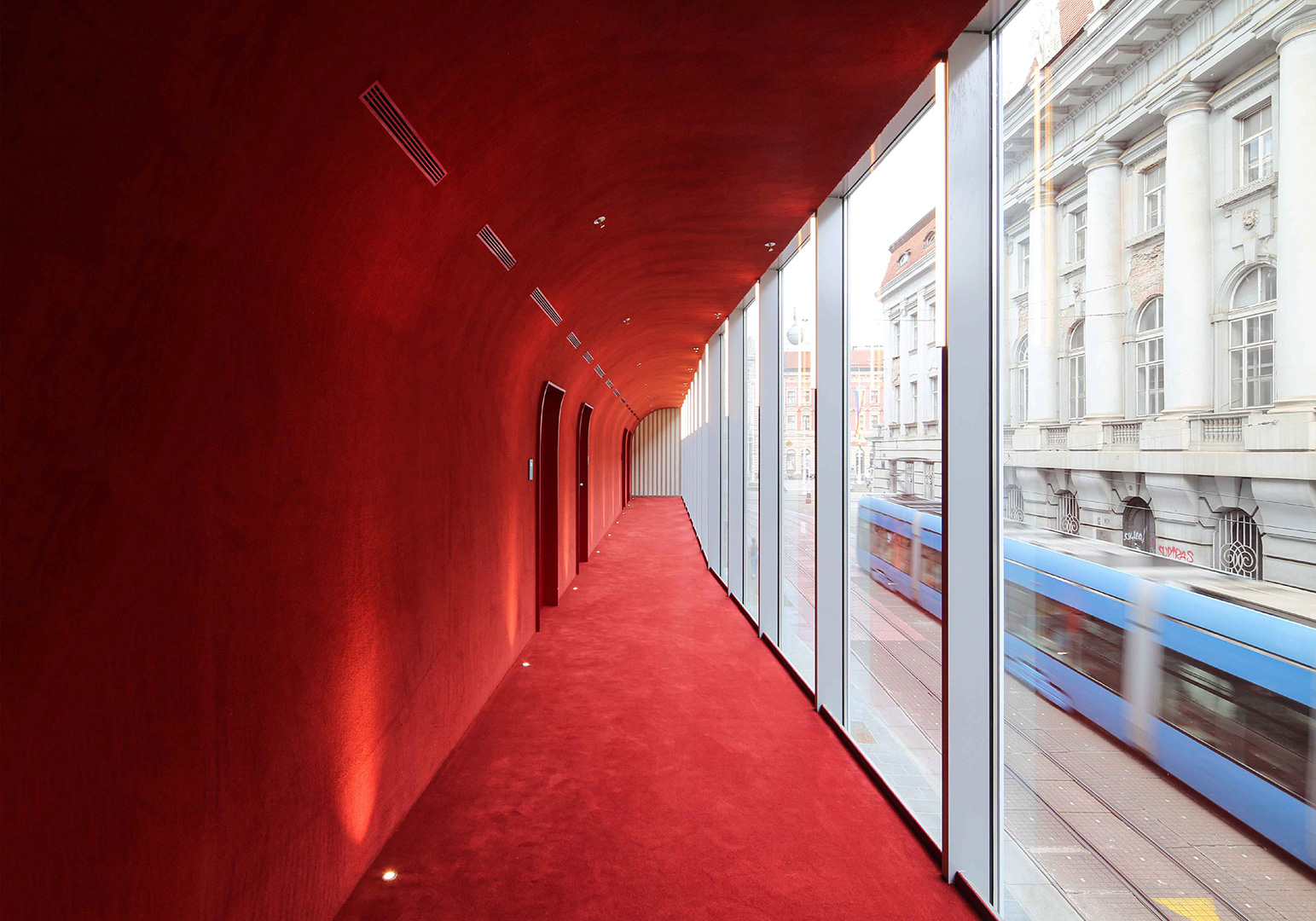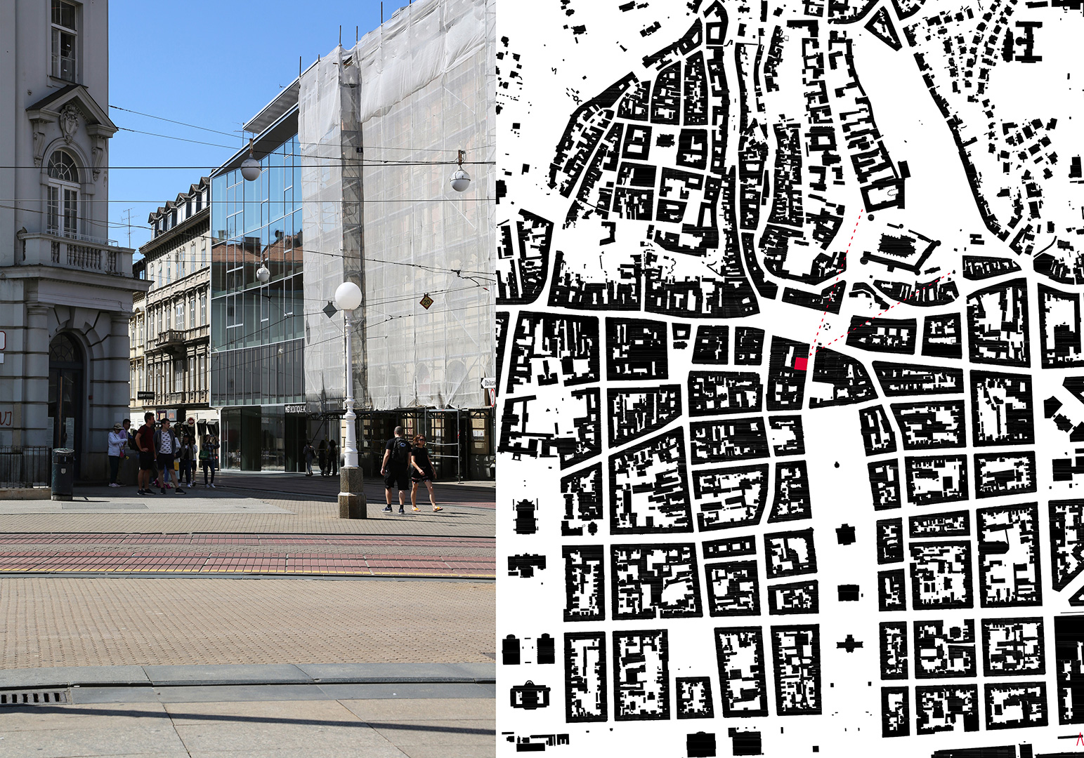 Široki se trg pod nagibom ulijeva u usku ulicu u smjeru velikog parka. Nad ojačanim temljima i rubnim zidovima zatečene zgrade, interpolacija vijencem slijedi nagib kontrolirajući ulijevanje ulice u dubinu bloka. Slaganjem slojeva kostiju i kože poništava se granica unutrašnjeg prostora i grada. Iz krova susjedne uglovnice isječene su trake svjetla. Prazno - puno -prazno, dan - noć - dan; pročelje iza pročelja, britva reže oko u zoni žica i ovjesa.