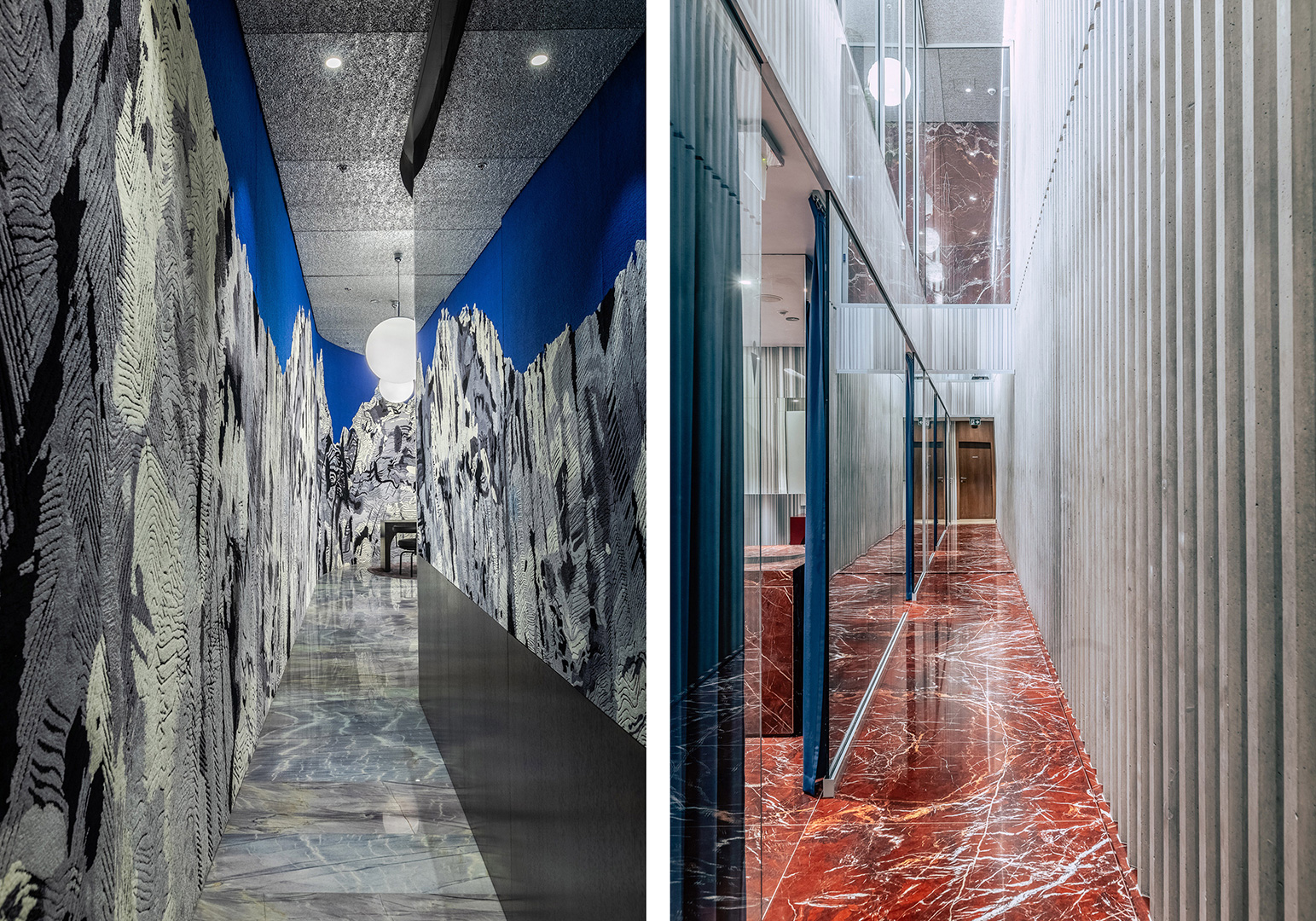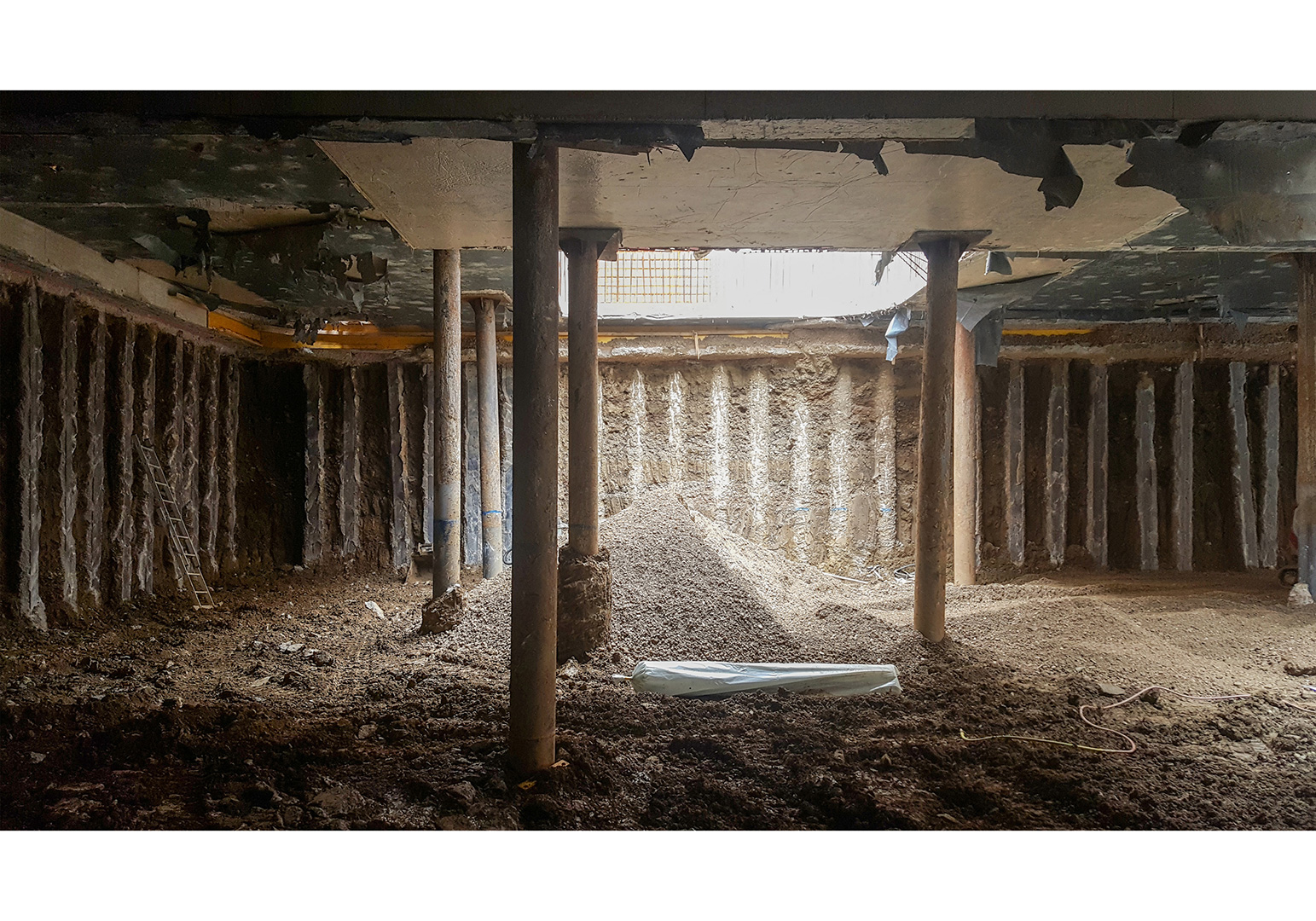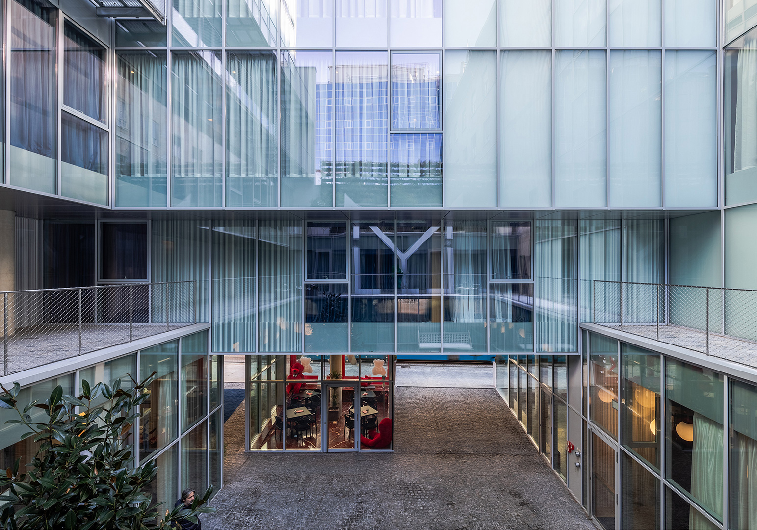 Široki se trg pod nagibom ulijeva u usku ulicu u smjeru velikog parka. Nad ojačanim temljima i rubnim zidovima zatečene zgrade, interpolacija vijencem slijedi nagib kontrolirajući ulijevanje ulice u dubinu bloka. Slaganjem slojeva kostiju i kože poništava se granica unutrašnjeg prostora i grada. Iz krova susjedne uglovnice isječene su trake svjetla. Prazno - puno -prazno, dan - noć - dan; pročelje iza pročelja, britva reže oko u zoni žica i ovjesa.