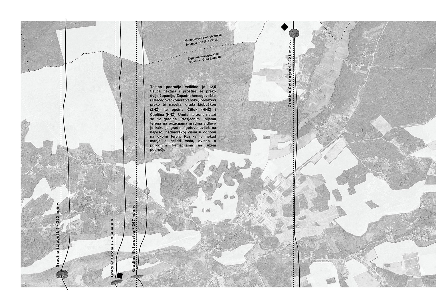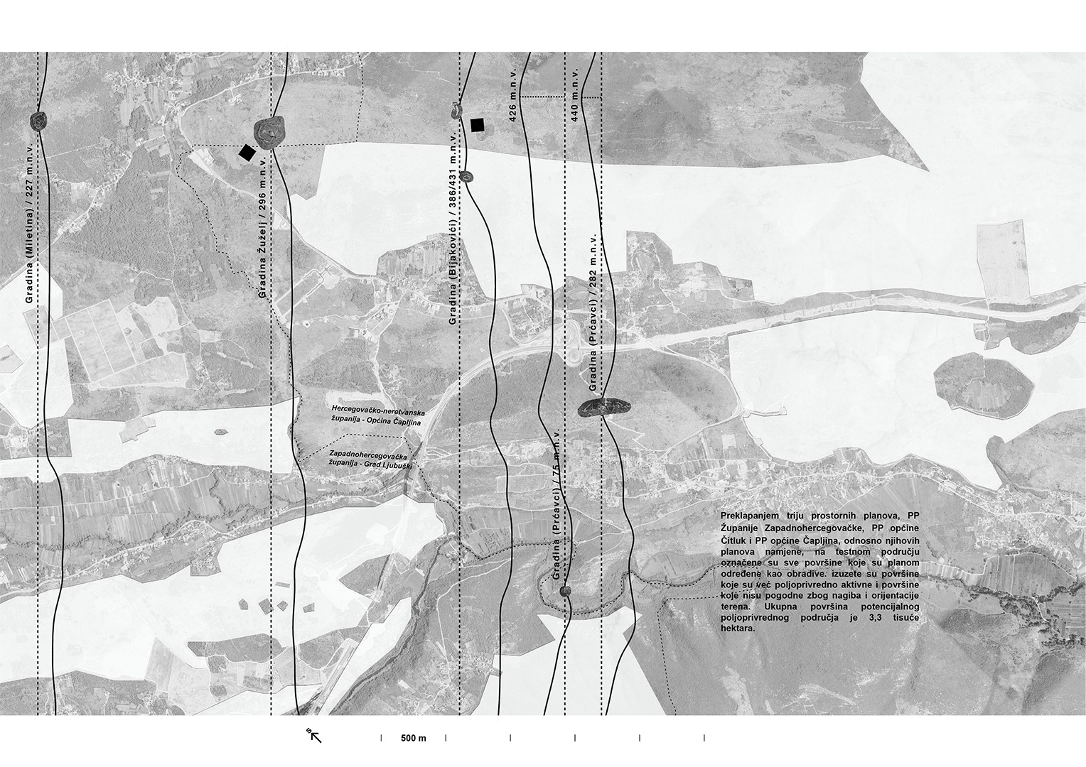 Prvi, zaboravljeni sloj hercegovačkoga antropogenog palimpsesta izronio je u novi čudnovati život: raštrkane ilirske gradine i gomile najednom su arhipelazi u moru nepreglednih plantaža. U zakonskom vakuumu krške pustoši stvoren je fantastično delikatan sudar; stoga, projekt suživota autor ni ne gradi na pravnom, nego okviru uzajamnih odnosa. Plantaže se osiguravaju robusnom i nježnom infrastrukturom, kojom se hrane i gradine; onda, lokaliteti nabijeni mitološkim, tretiraju se fantazmagoričnim.