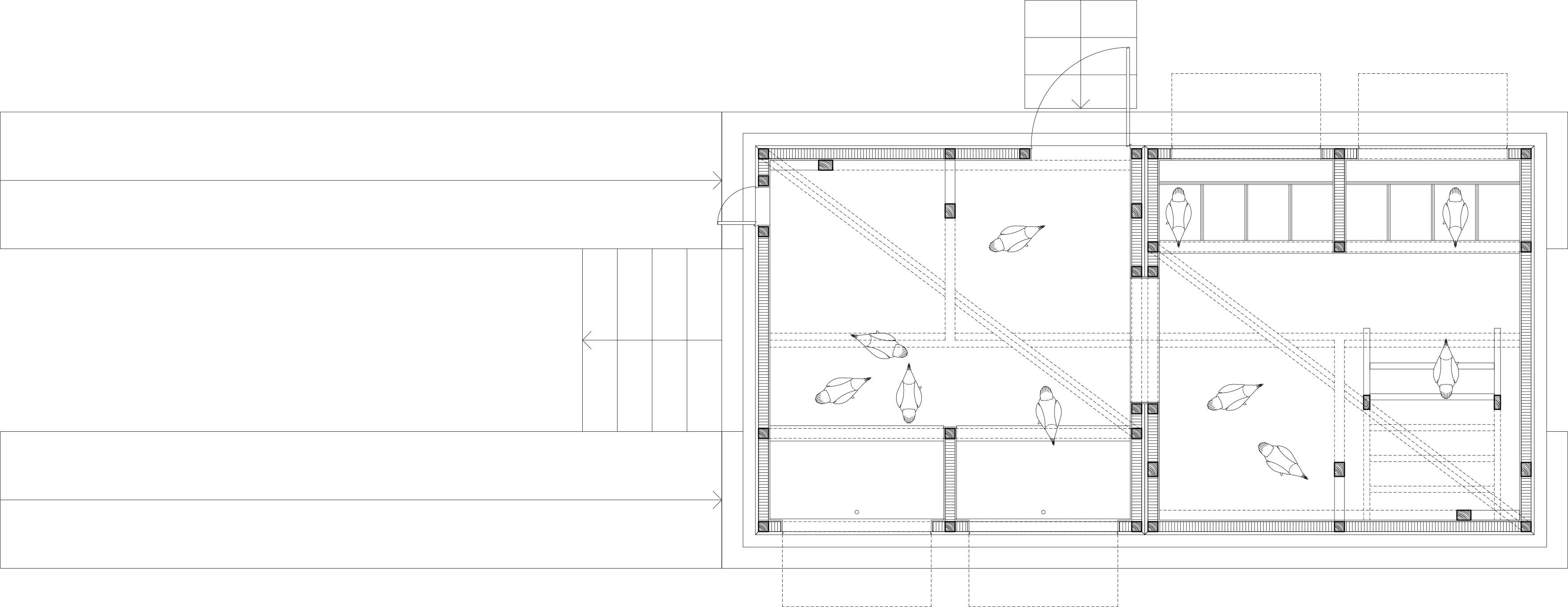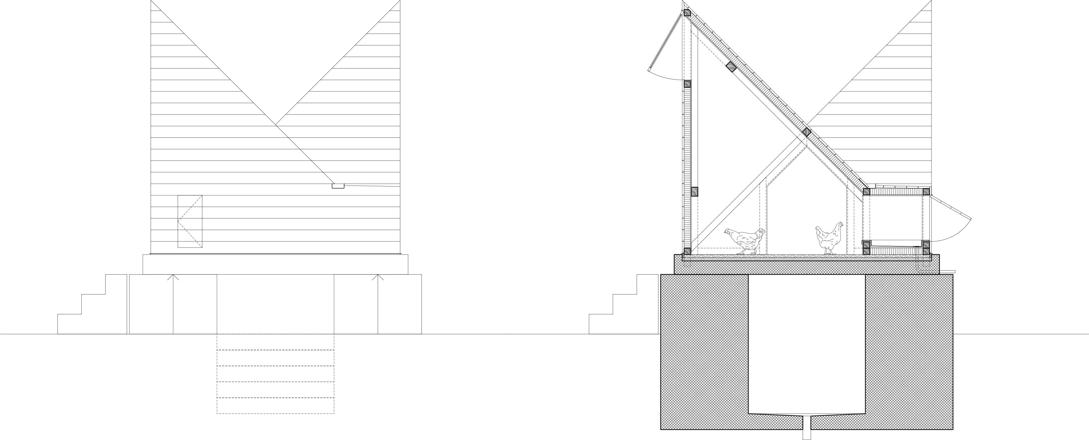 Nakon što je prošli kokošinjac, sagrađen od odbačenih građevinskih materijala, neslavno propao pod najezdom tekuta javila se potreba za premještanjem i smislenijim rješenjem koje će rezultirati poboljšanjem životnih uvjeta. Predloženi kokošinjac gradi se od paljenih dasaka (shou sugi ban), podignut od razine tla na betonsku platformu zbog sprječavanja napada divljih životinja. Zbog racionalizacije projekta i ograničenih mogućnosti investitora kokošinjac je premješten na obližnji stričev auto-kanal dajući ovom čudnovatom spoju novu, nadrealnu, tako hrvatsku dimenziju.