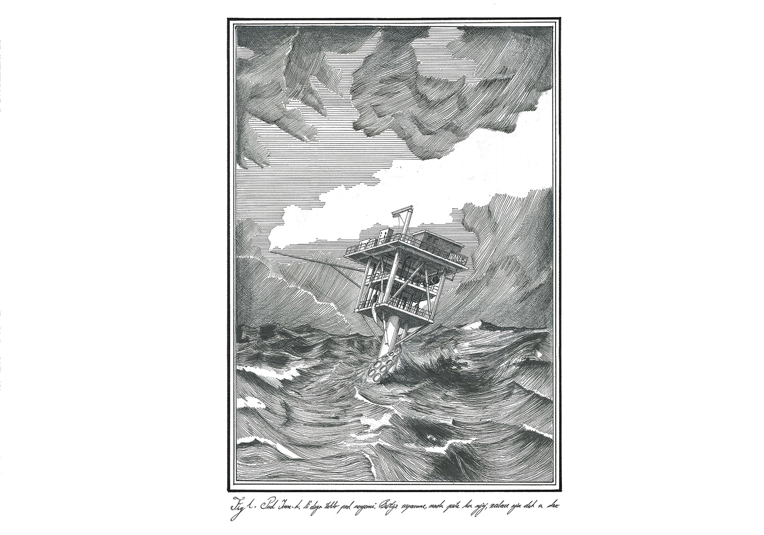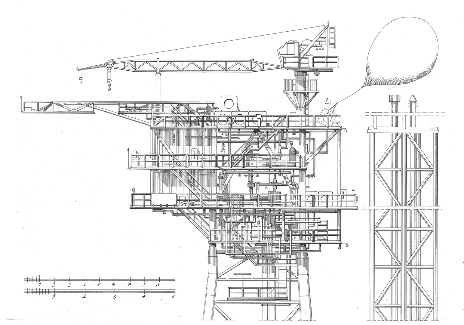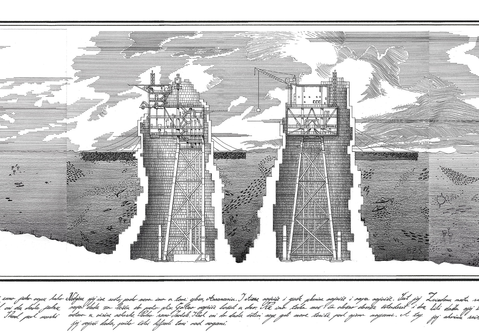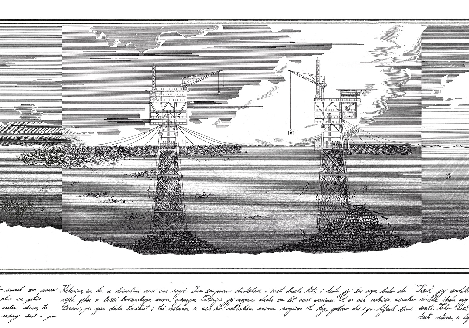 By the mid-21st century, 17 Croatian LNG platforms will lose their primary and sole function. The gas will be depleted, and the structures will be forgotten. The fate of platform Ivana D, now a coral reef on the Adriatic seabed, serves as a testament. This project seeks to propose new ideas and futures for these platforms: as waste collectors, watchtowers, and new cities. The project consists of an 8-meter-wide frieze, a collage of original hand-drawn diagrams, blueprints, and illustrations.