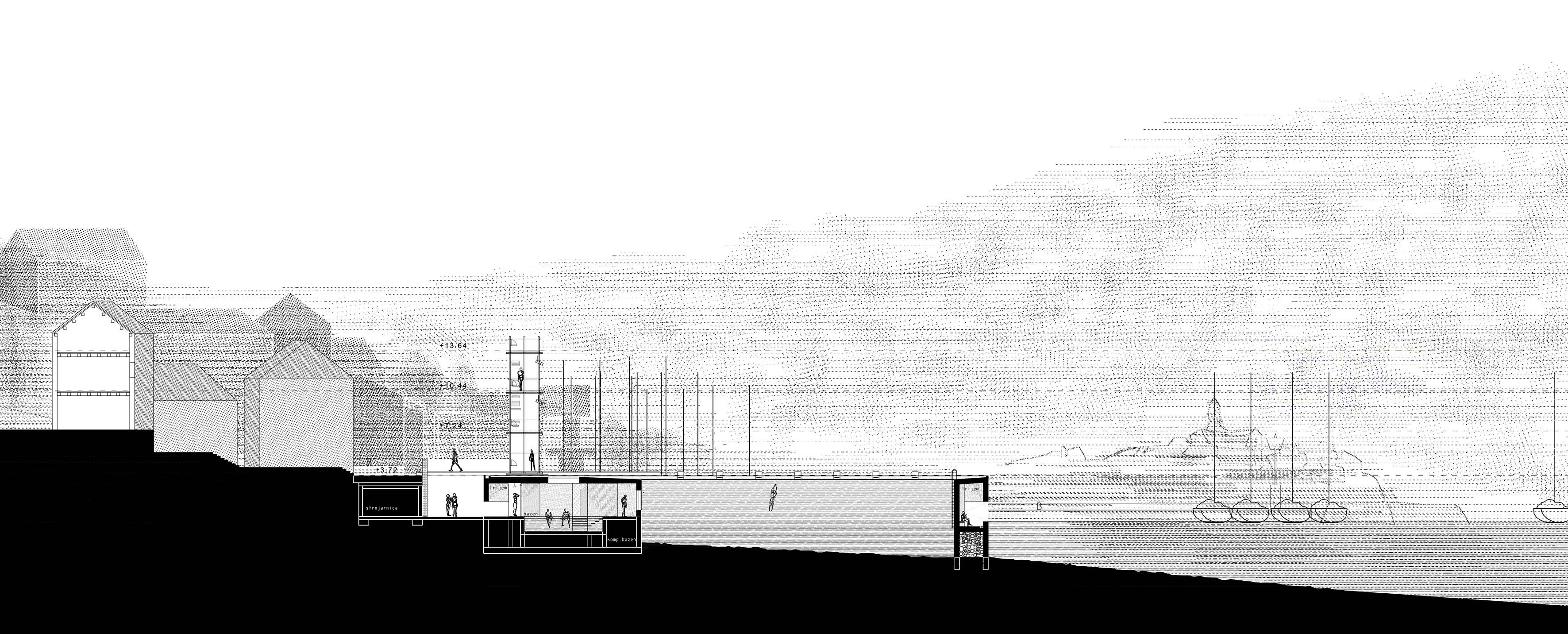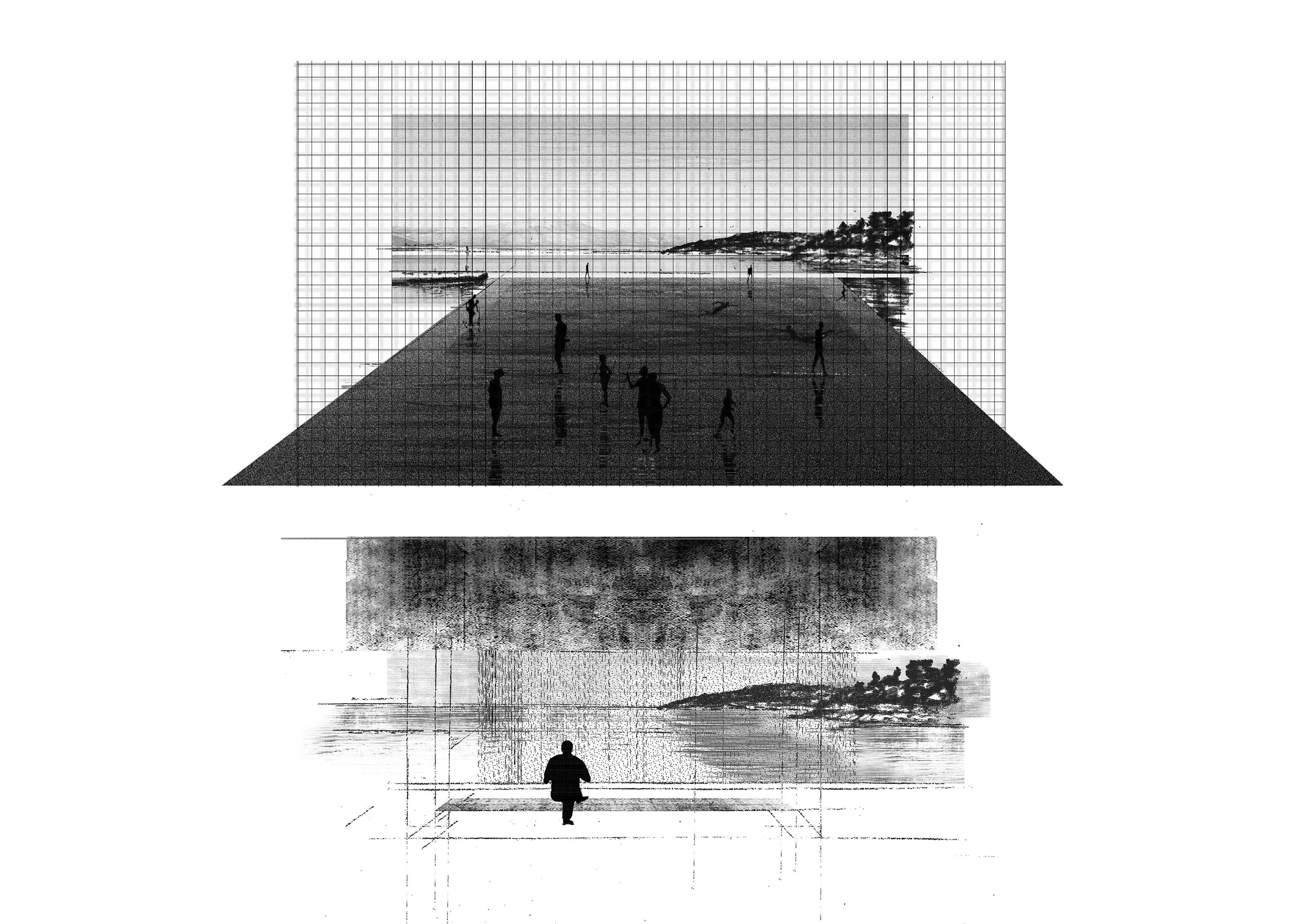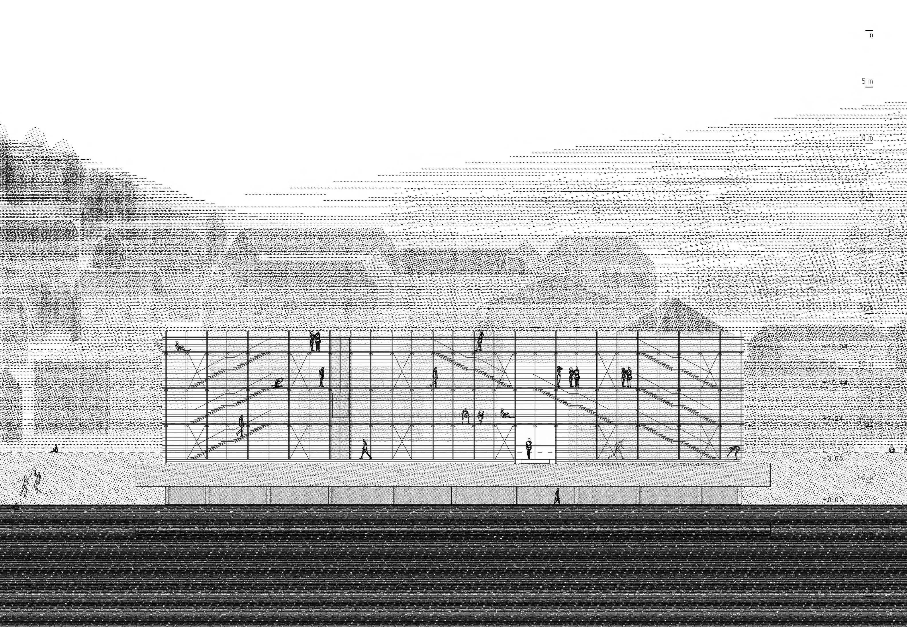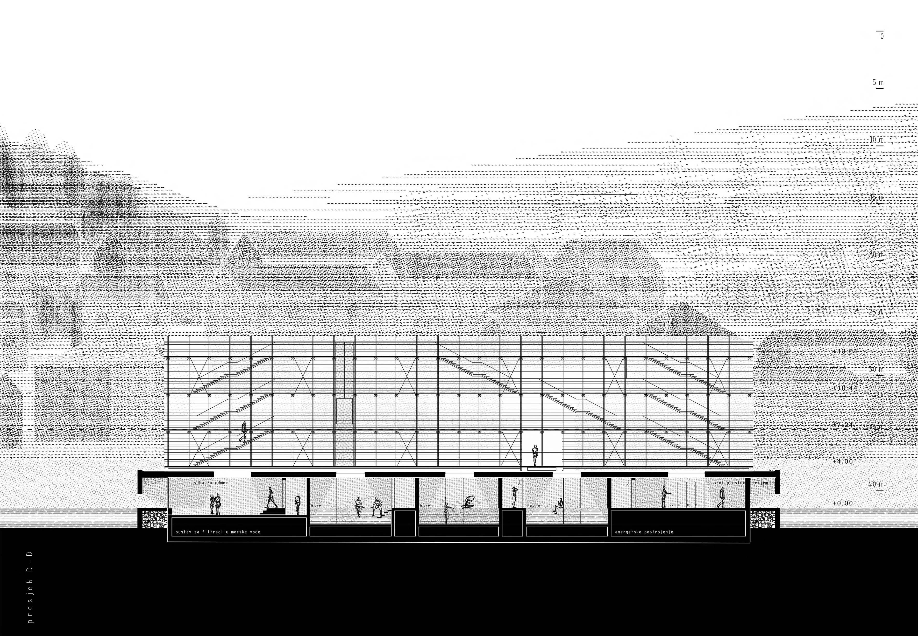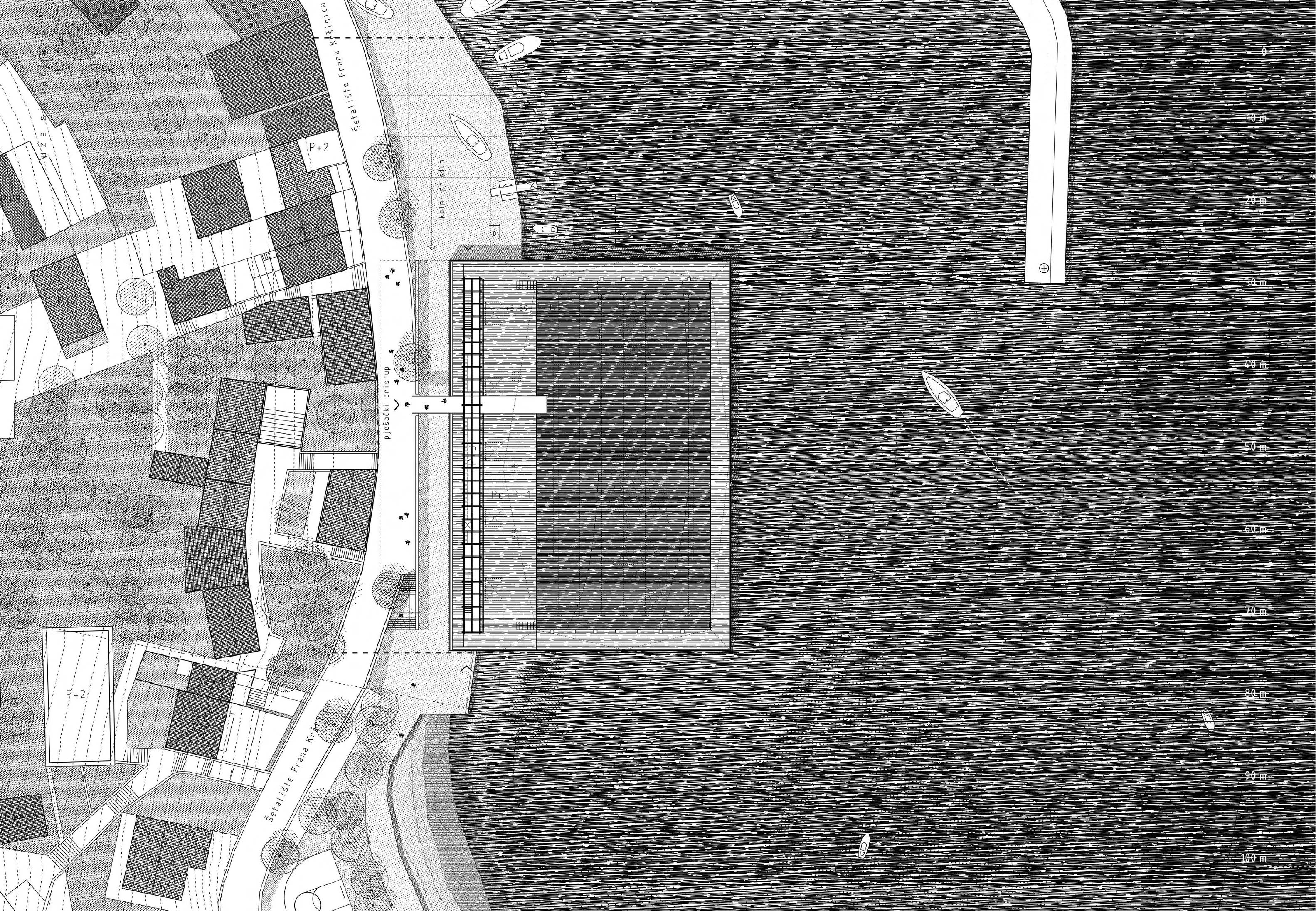 Since 1945, the outdoor KPK swimming pool has symbolized gathering and community. The concrete breakwater structure lost its function with the construction of a new indoor swimming pool. The intervention affirms the existing facility in order to create new regimes of use. The summer-winter cycle composes natural and social dynamics. At street level, the space opens up as a water square with a vertical sunbathing terrace, beneath which lies a dense network of thermal baths. The atmosphere is defined by the symbiosis of the environment and built framework. As time changes, so does space.