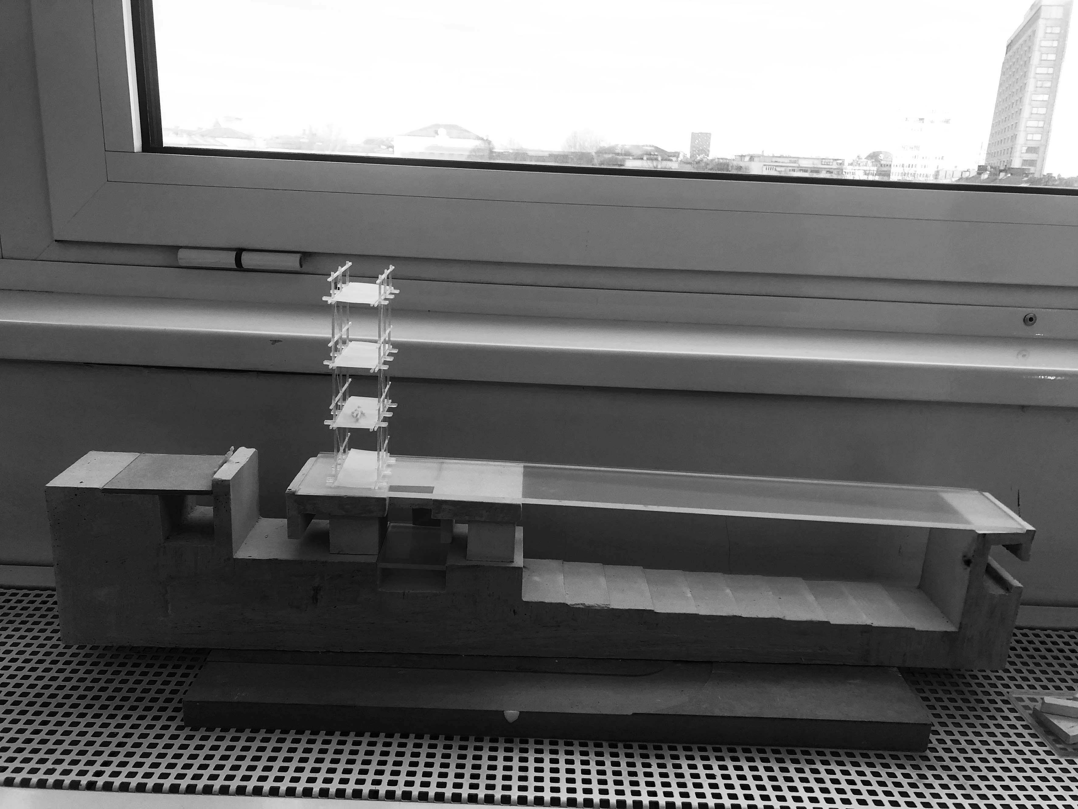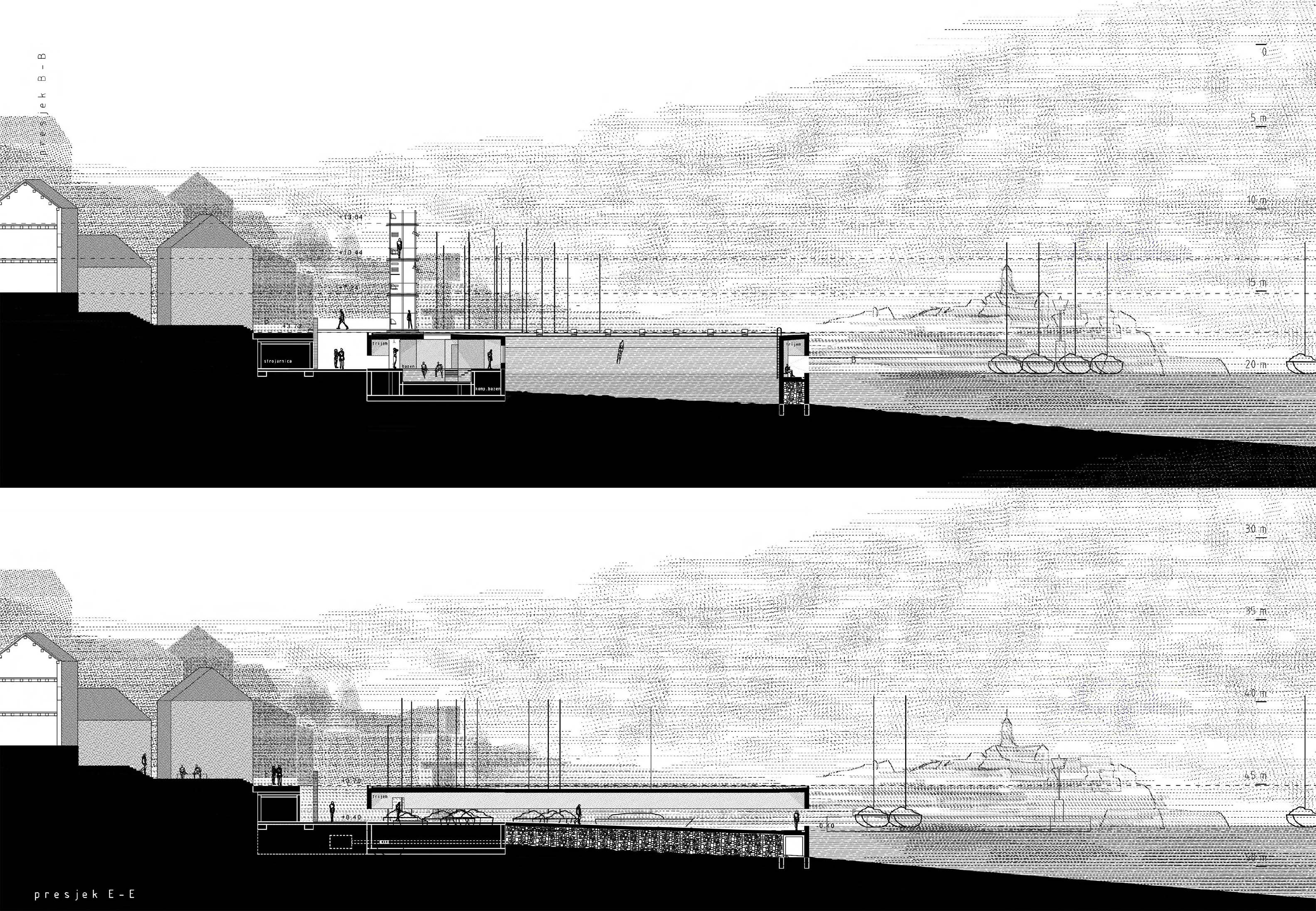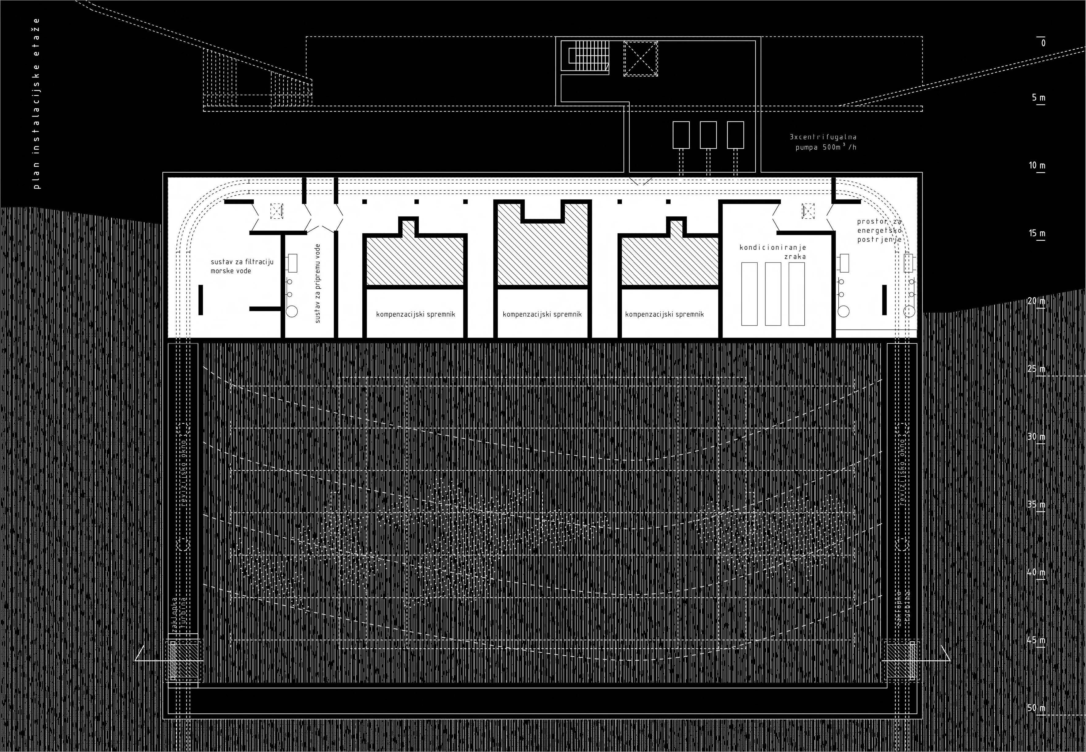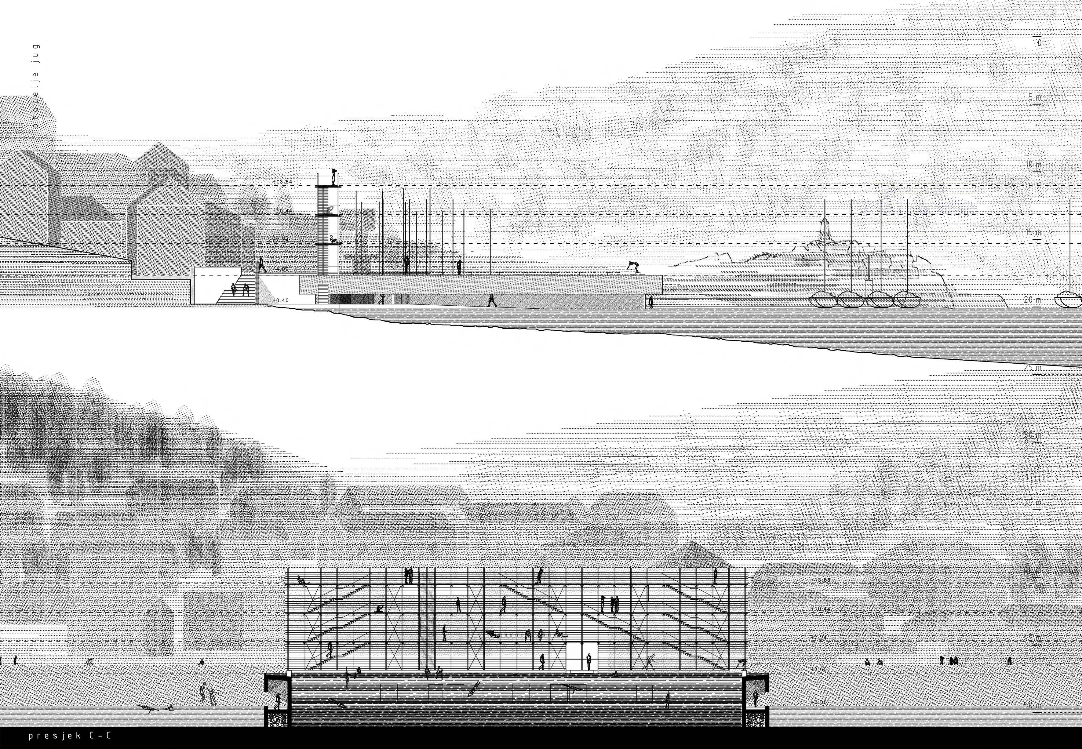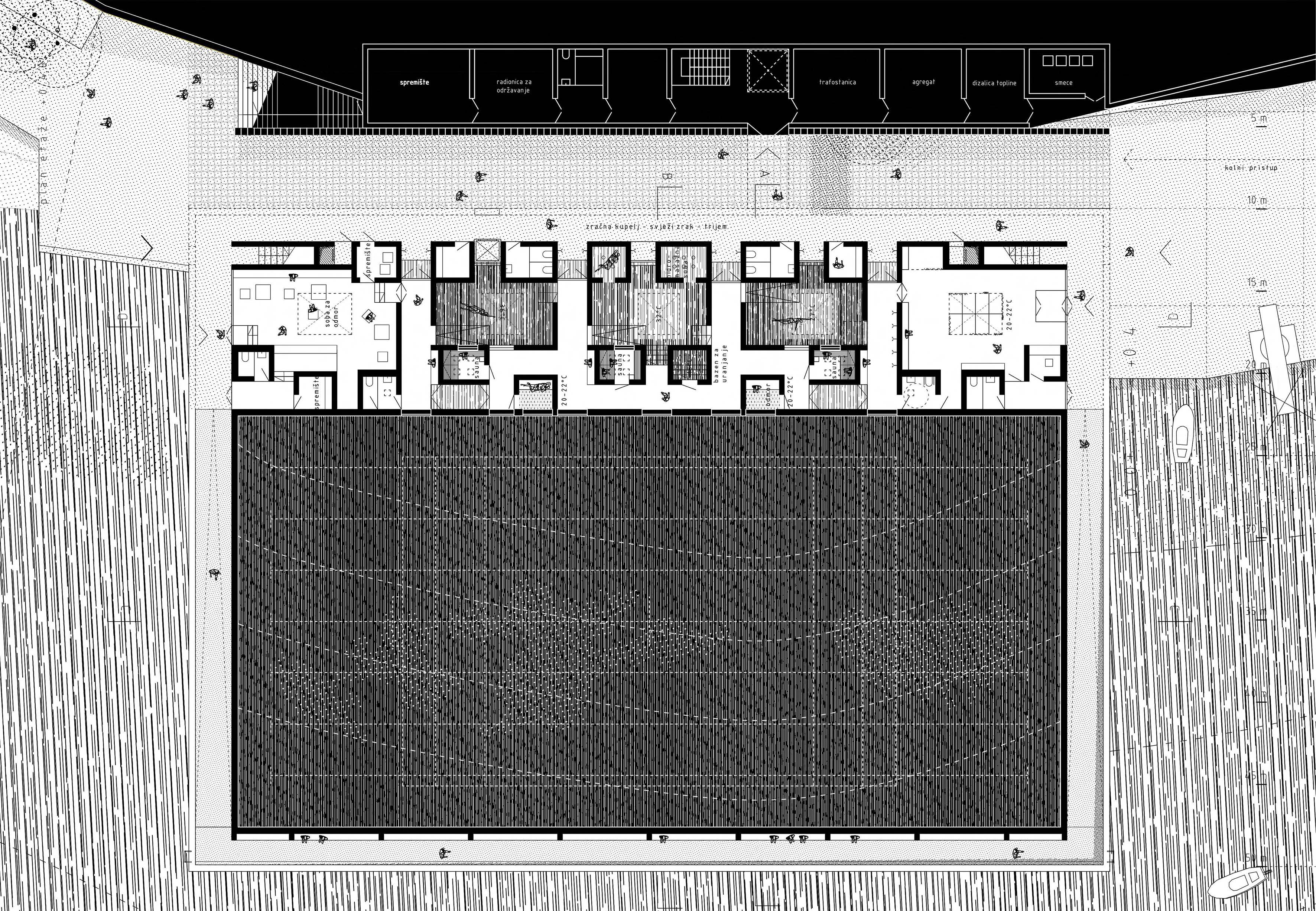 Since 1945, the outdoor KPK swimming pool has symbolized gathering and community. The concrete breakwater structure lost its function with the construction of a new indoor swimming pool. The intervention affirms the existing facility in order to create new regimes of use. The summer-winter cycle composes natural and social dynamics. At street level, the space opens up as a water square with a vertical sunbathing terrace, beneath which lies a dense network of thermal baths. The atmosphere is defined by the symbiosis of the environment and built framework. As time changes, so does space.