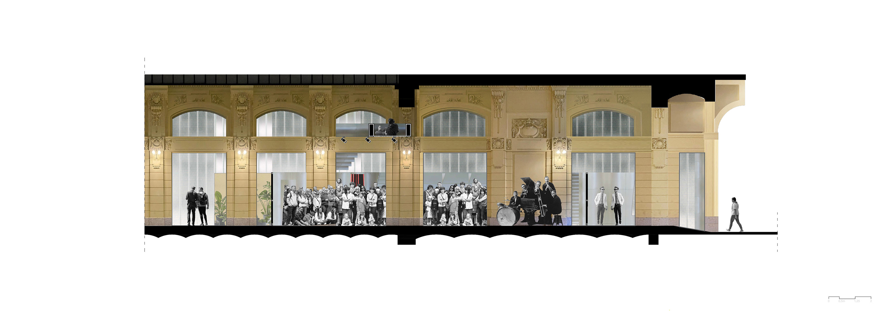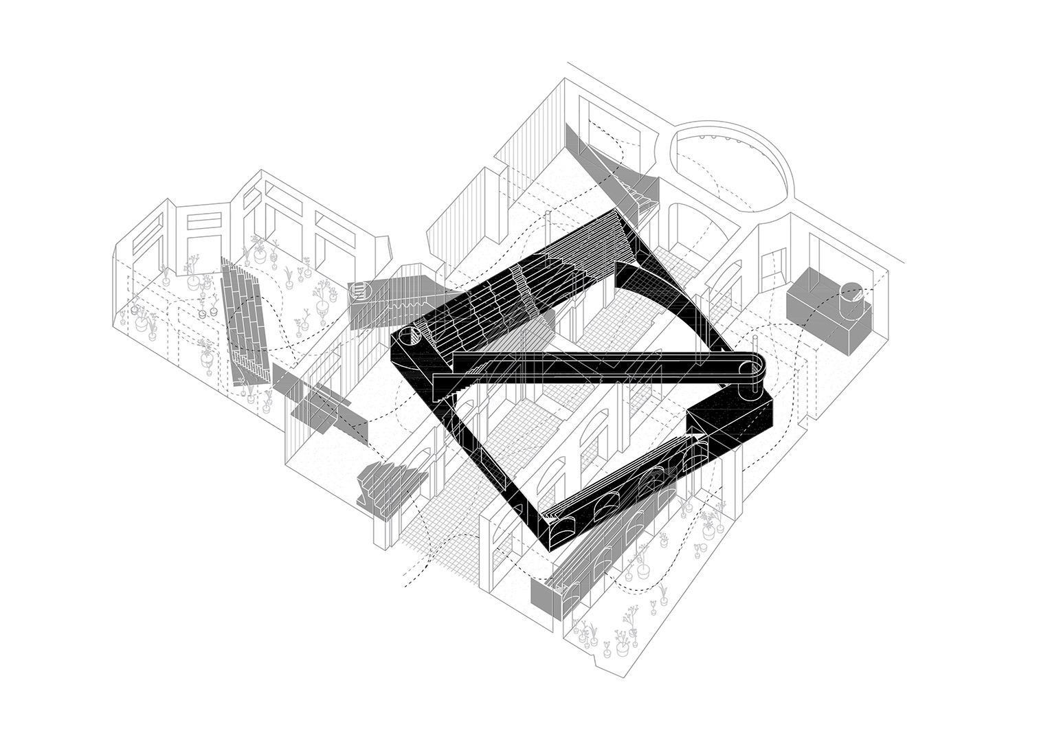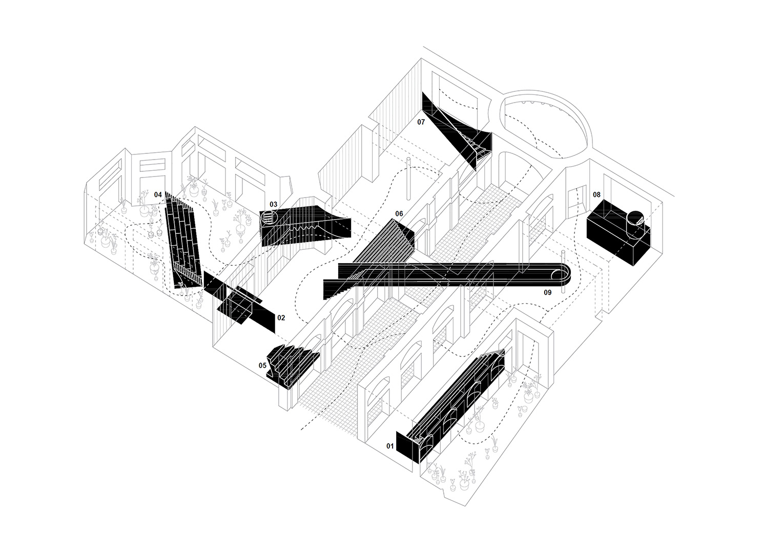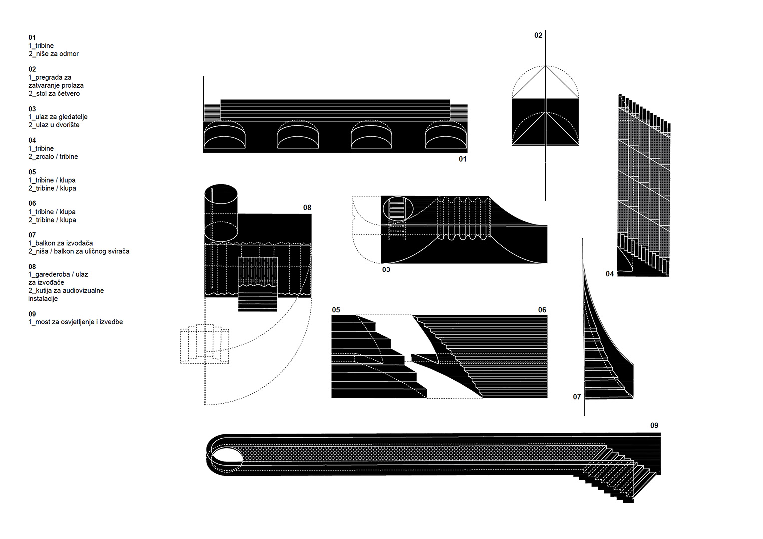 Selected venues are viewed as rooms for the public—interiors accessible to everyone—a non-commercial meeting place. They feature movable elements that anyone can reposition. Some elements serve as stages for street performers, niches for projections, bleachers, worktables, or resting spots, shifting meaning based on arrangement. When connected, they form a teatrino for performances, plays, concerts, and debates. The teatrino redirects movement through the venues and encourages active participation in shaping the space.