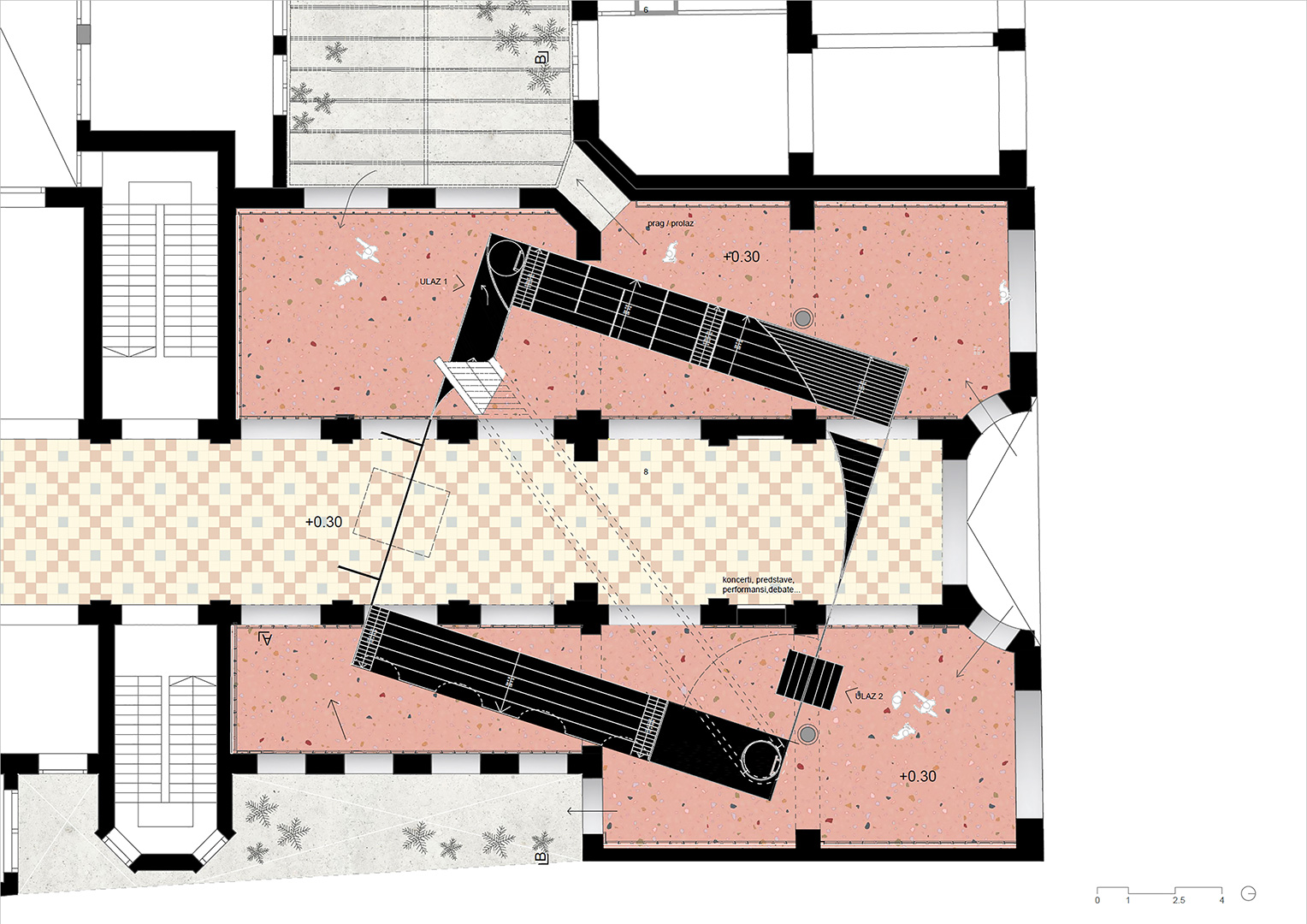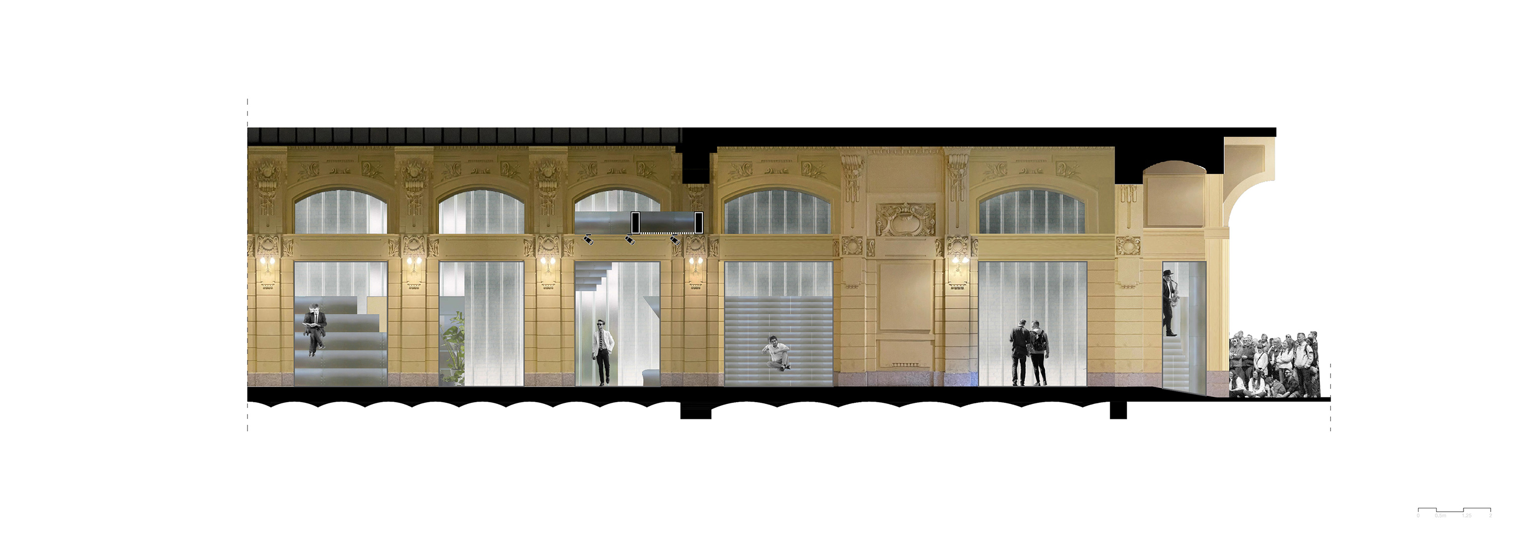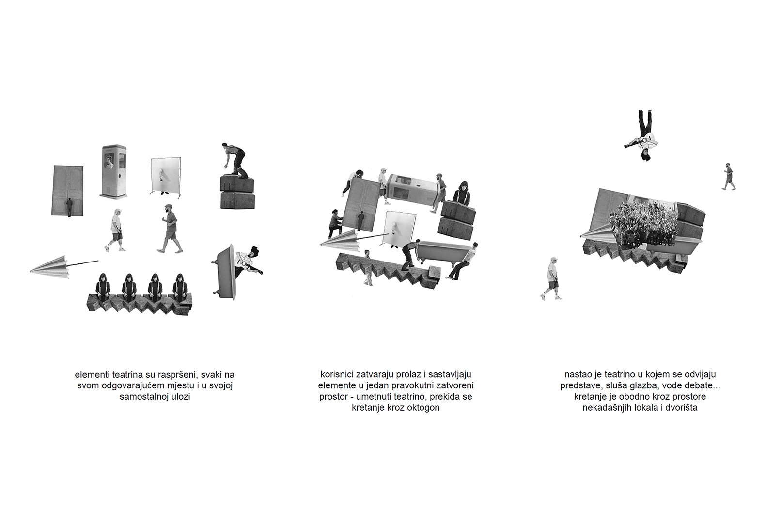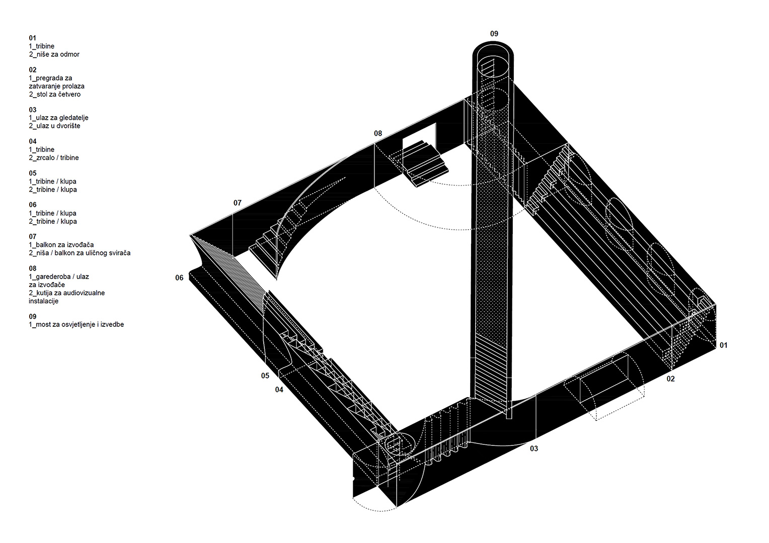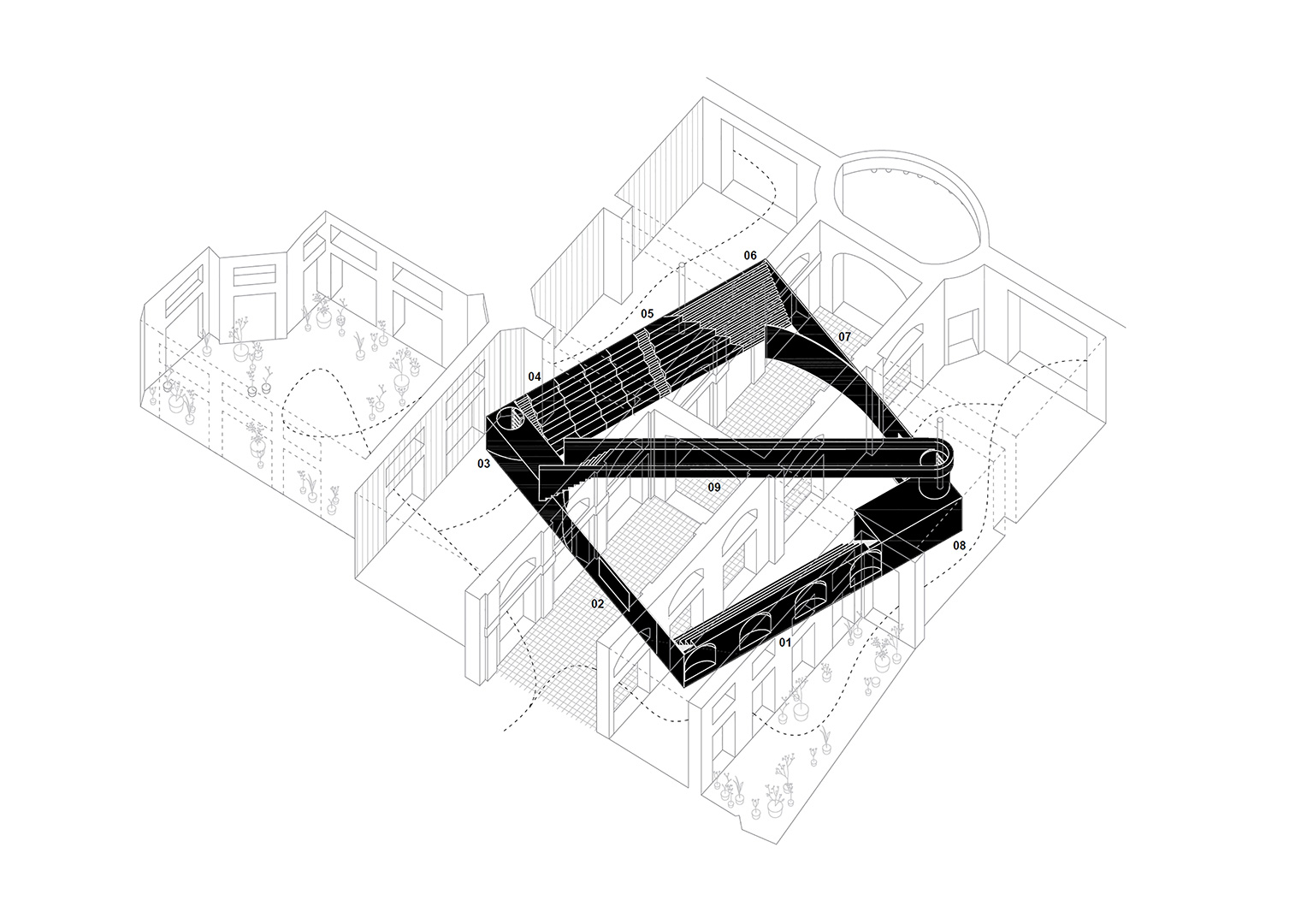 Selected venues are viewed as rooms for the public—interiors accessible to everyone—a non-commercial meeting place. They feature movable elements that anyone can reposition. Some elements serve as stages for street performers, niches for projections, bleachers, worktables, or resting spots, shifting meaning based on arrangement. When connected, they form a teatrino for performances, plays, concerts, and debates. The teatrino redirects movement through the venues and encourages active participation in shaping the space.