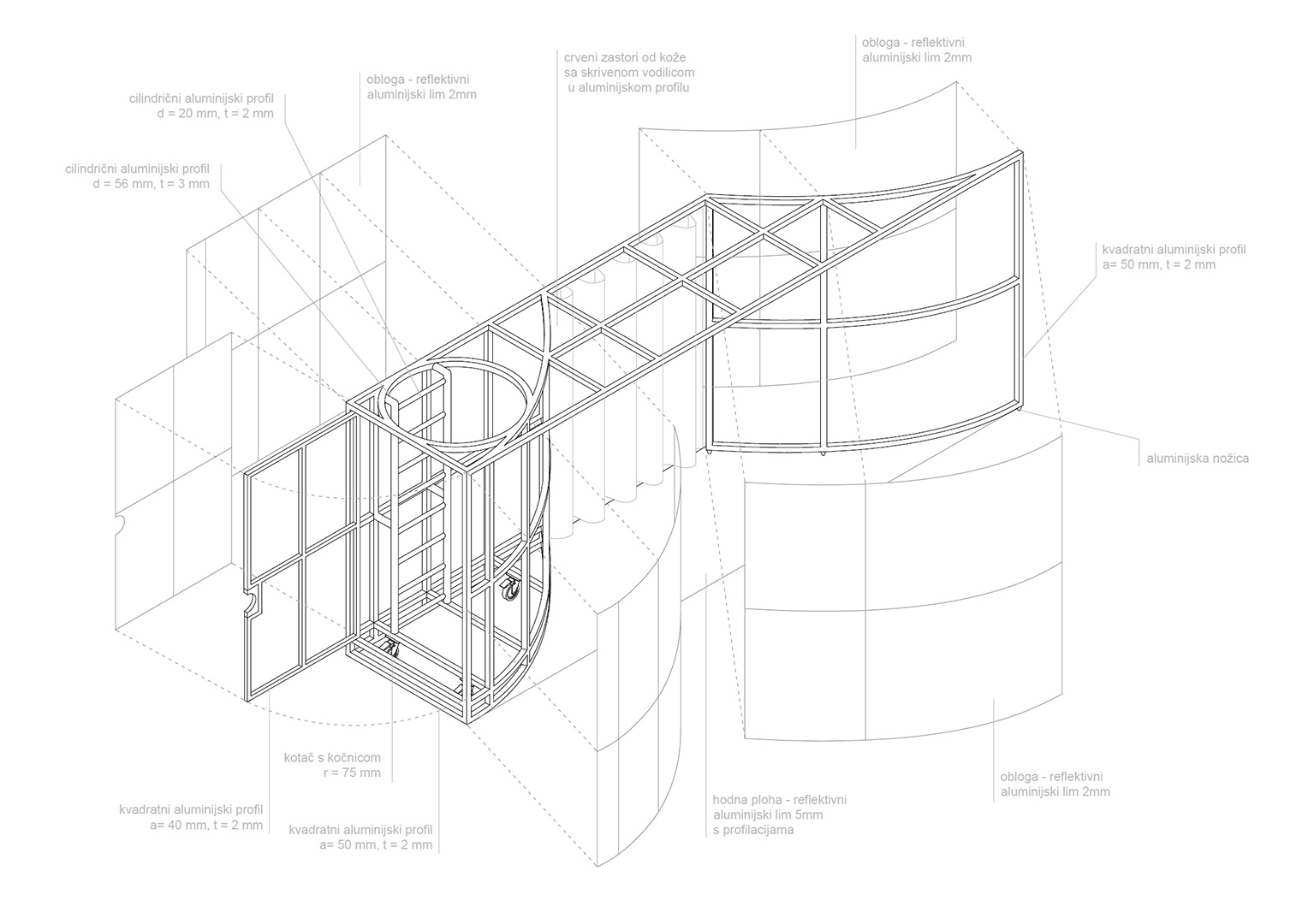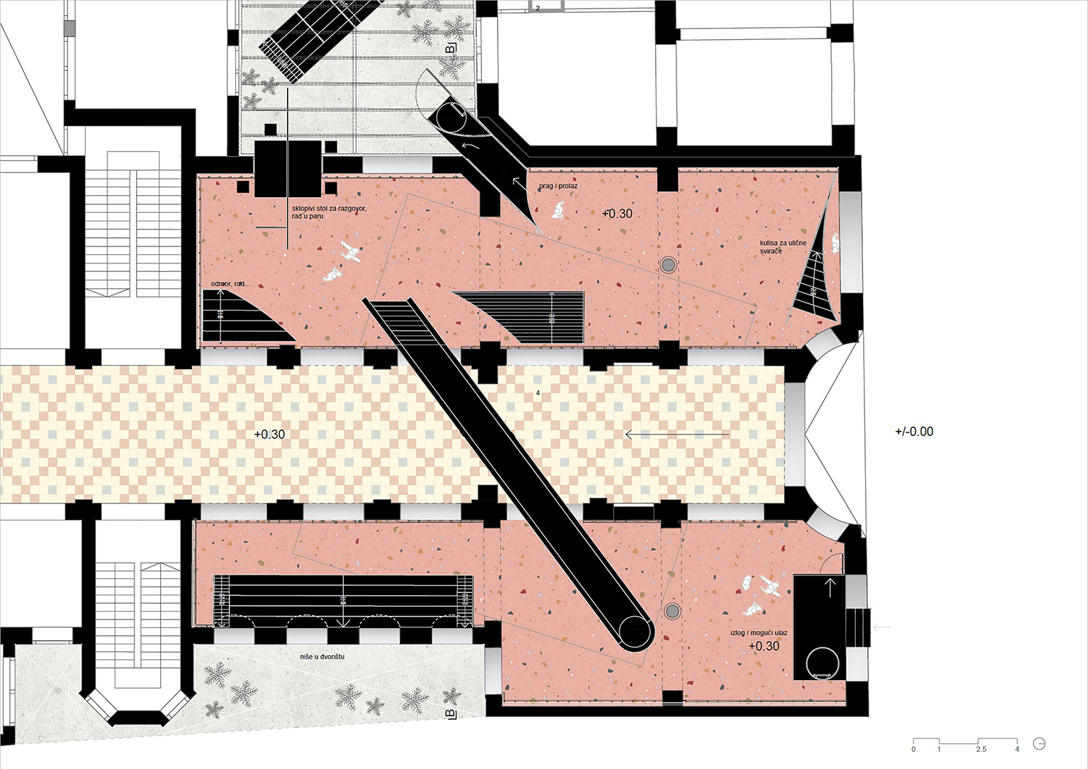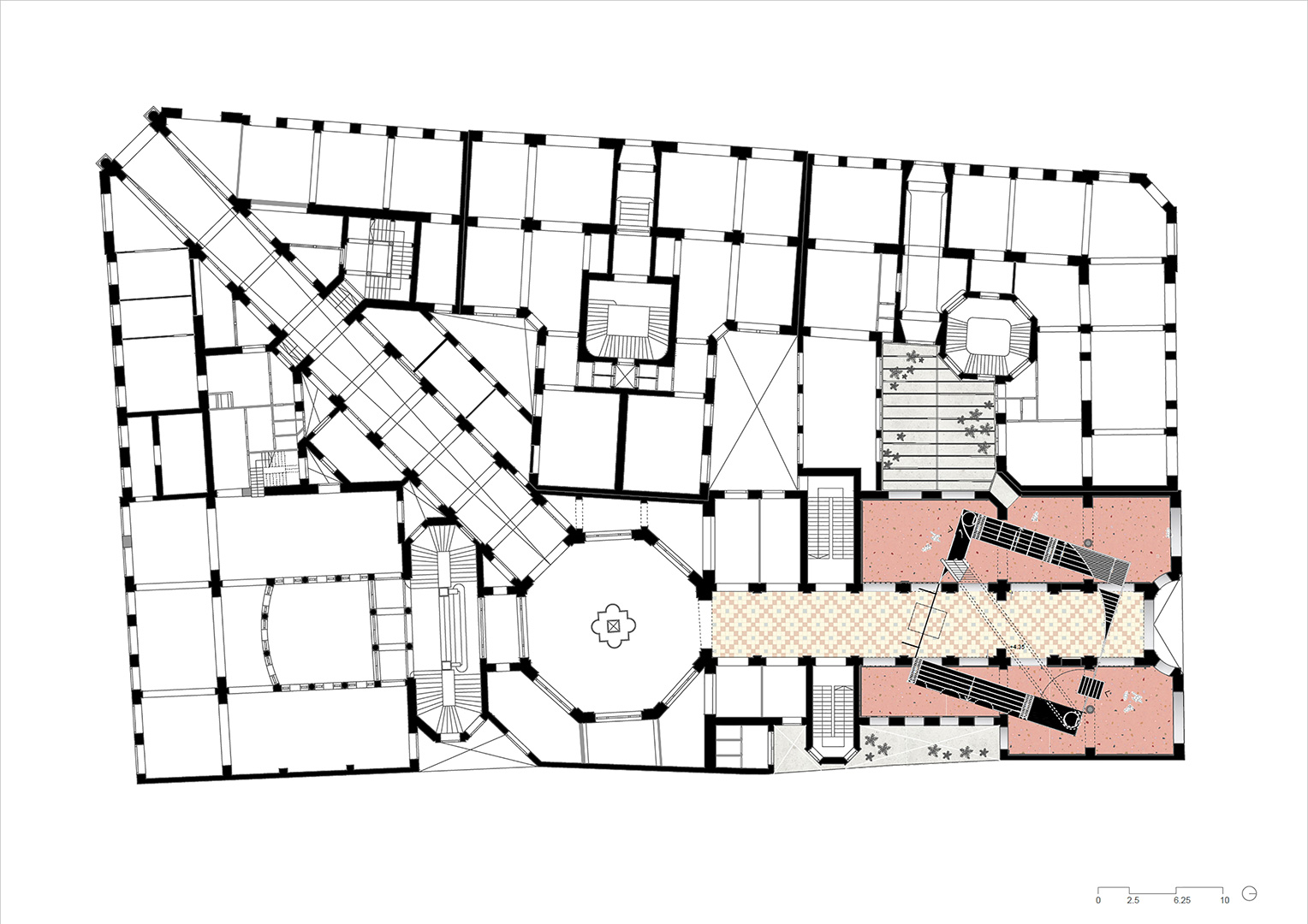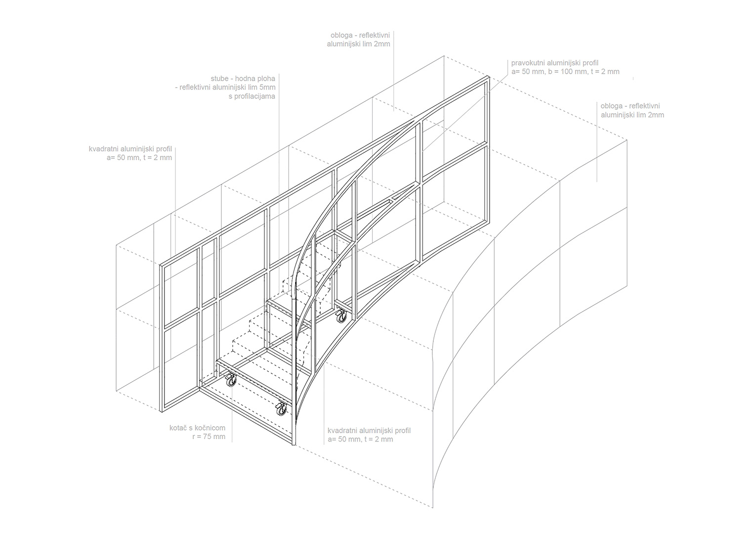 Selected venues are viewed as rooms for the public—interiors accessible to everyone—a non-commercial meeting place. They feature movable elements that anyone can reposition. Some elements serve as stages for street performers, niches for projections, bleachers, worktables, or resting spots, shifting meaning based on arrangement. When connected, they form a teatrino for performances, plays, concerts, and debates. The teatrino redirects movement through the venues and encourages active participation in shaping the space.