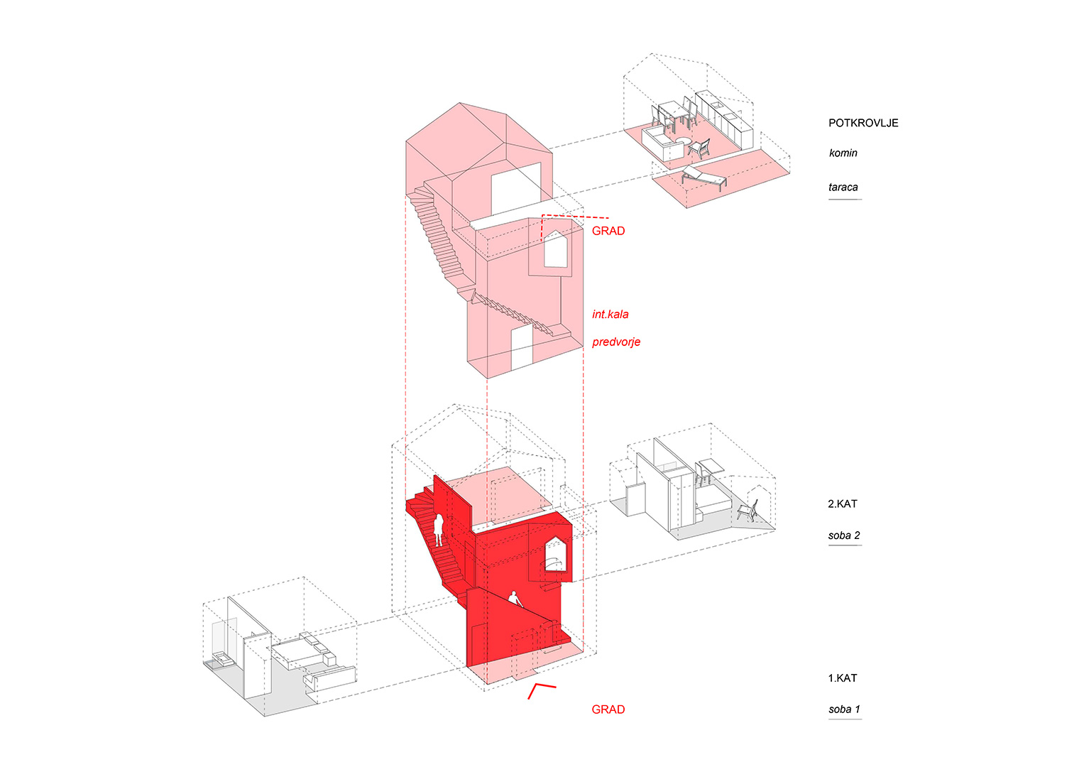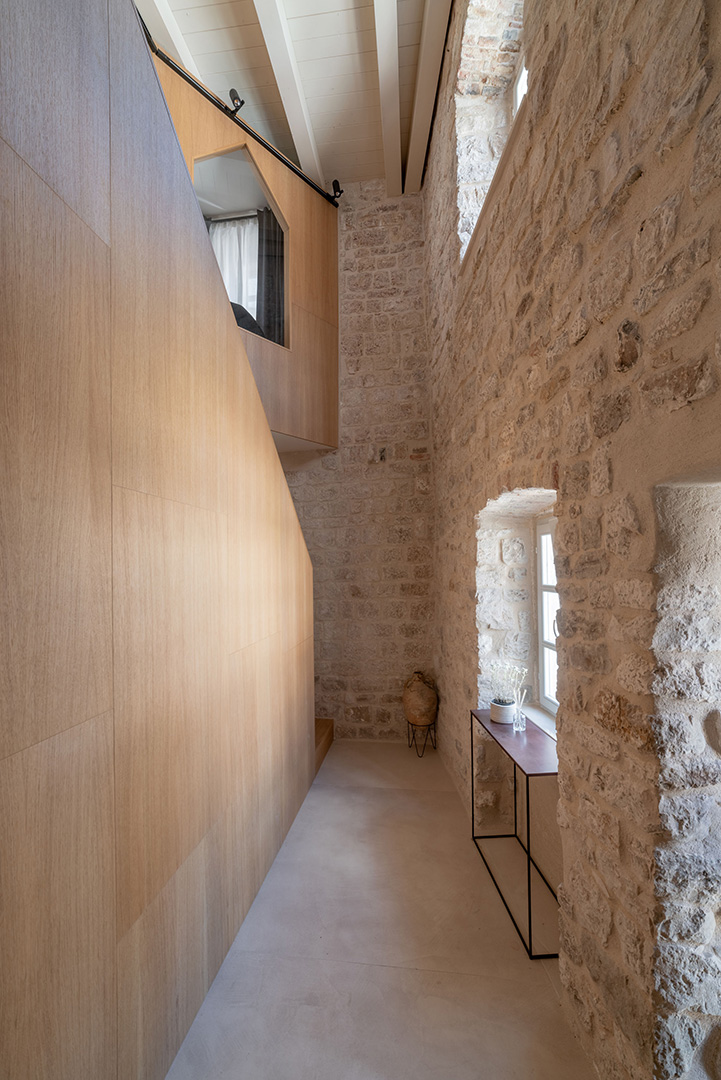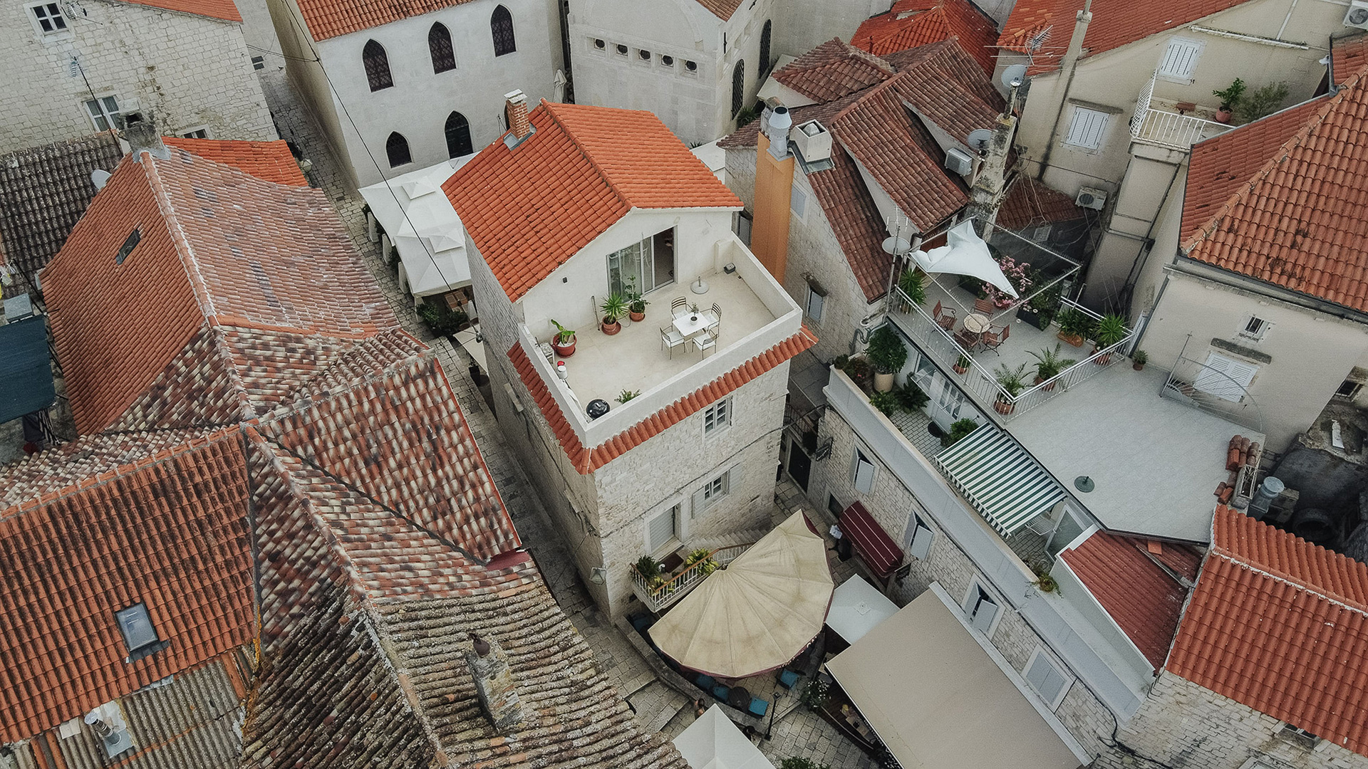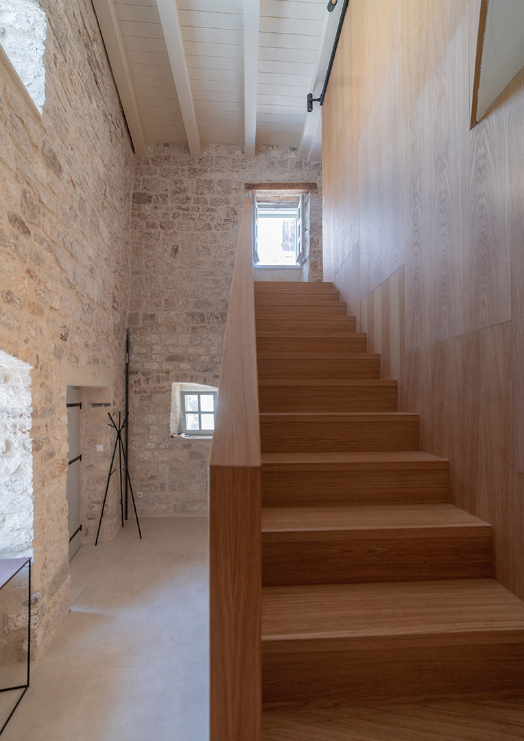Grandfather Marko’s House is one of the rare standalone houses in Trogir’s historic city core. The public space from which one enters the house is transposed within the walls as a vertical void. The void, resembling a traditional Dalmatian alley in proportions, scale, and character, becomes the spine of the house’s spatial and functional structure. This interior alley connects the square in front of the house to the fireplace and rooftop terrace, establishing relationships within the house’s shell and evoking layered connections between the house and the city.