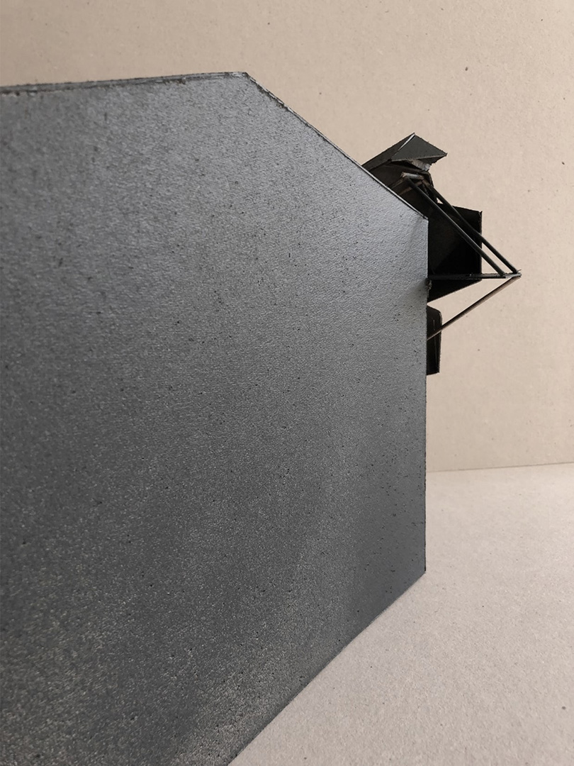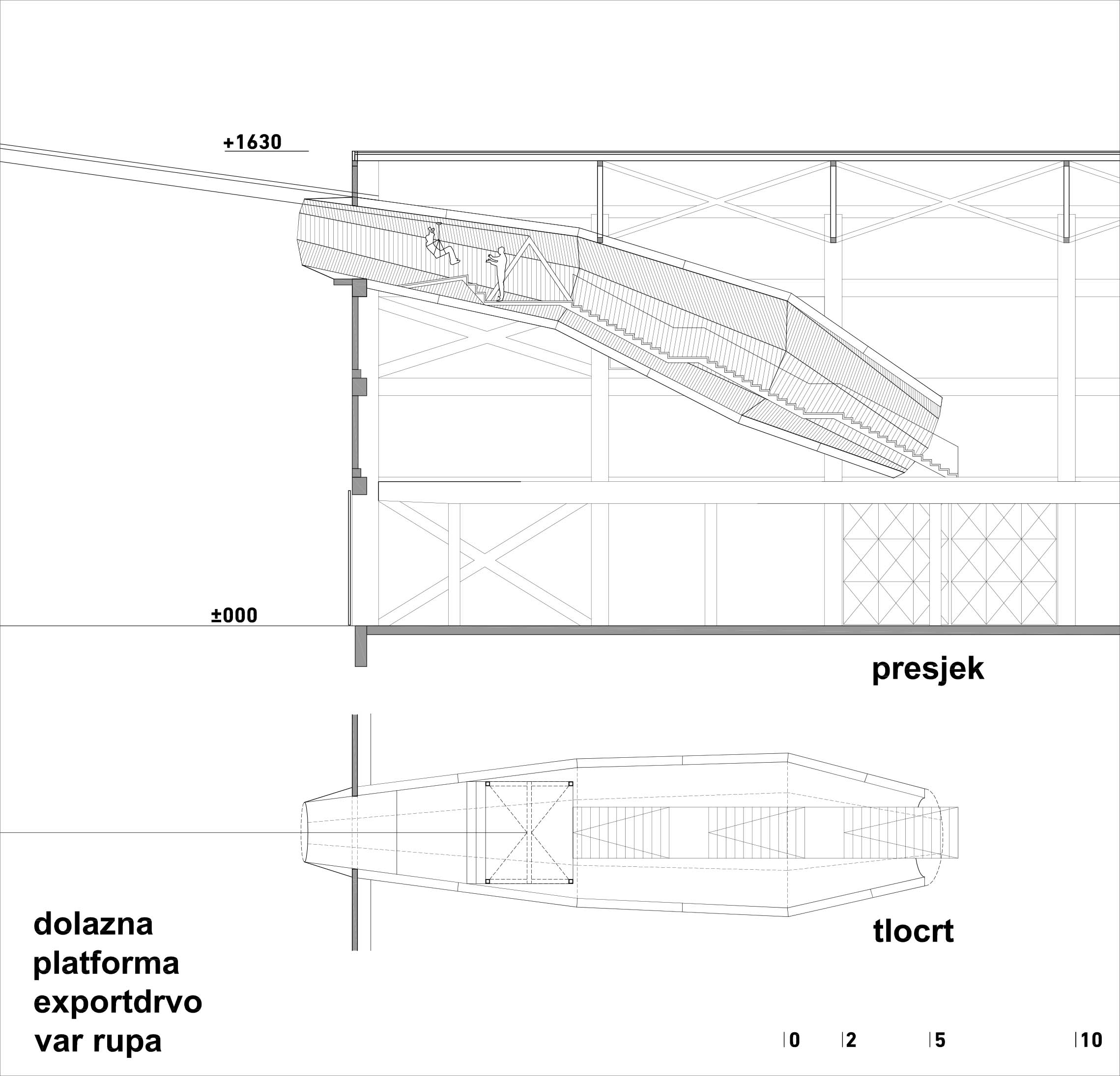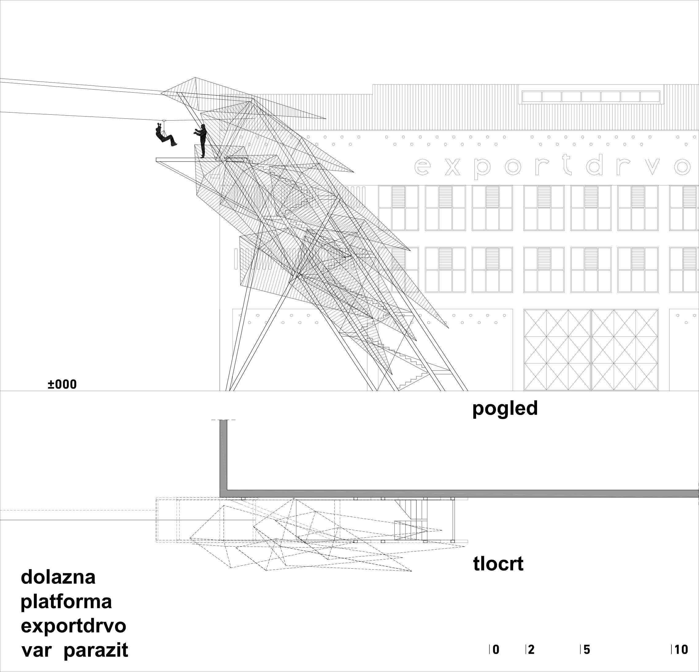 The zipline plunges from Gradina, through the Rječina canyon, and ends at the Exportdrvo building. It amplifies the thrill of such a flight while drawing on the legacy of industry in its materialization. Made from scrap metal, it parasitically attaches to the Exportdrvo building, becoming a beacon of a joyous future that incorporates the waste of the past. Landing at/on Exportdrvo is possible in two forms: into the 'mouth' of a zoomorphic scaffold on to the northwest edge or through a hole in the attic dressed in metal scales.Diving into the unkown culminates the bold freefall experience.