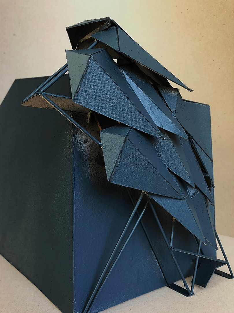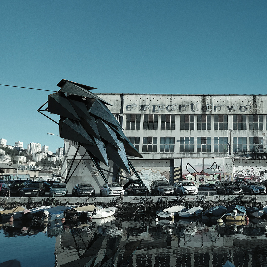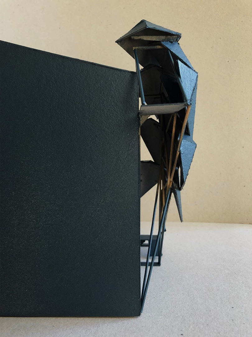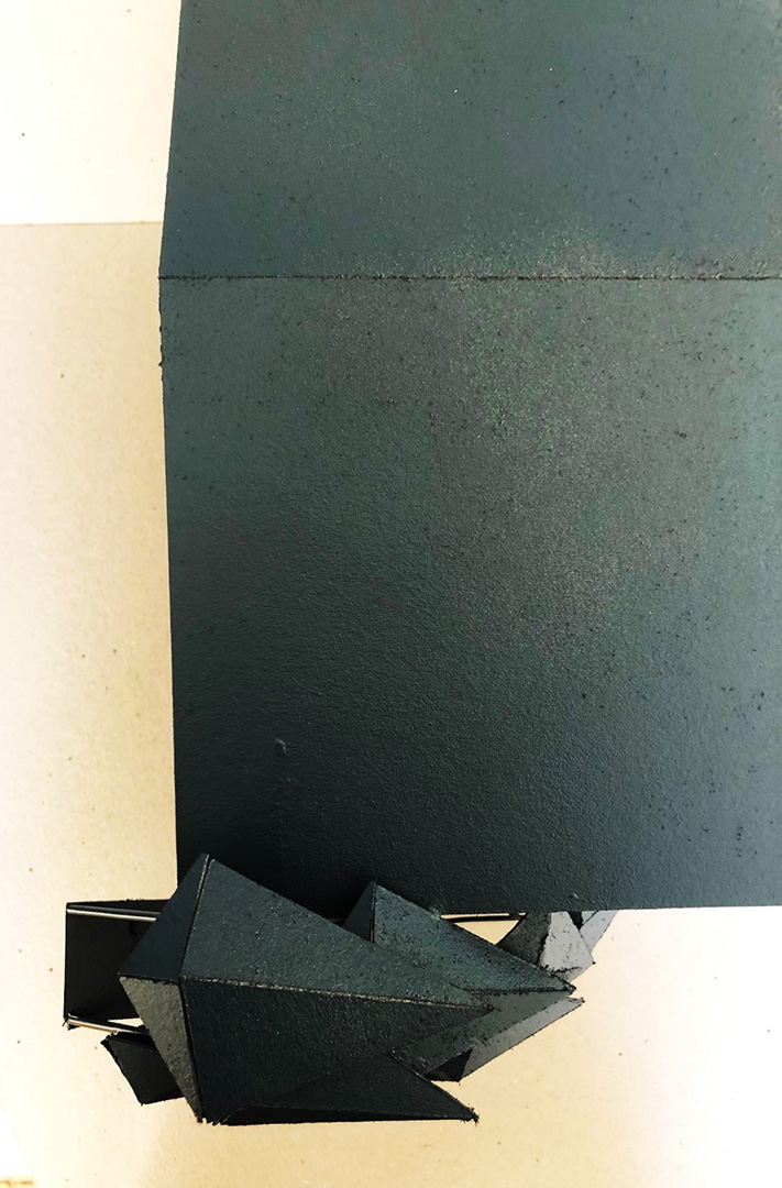 The zipline plunges from Gradina, through the Rječina canyon, and ends at the Exportdrvo building. It amplifies the thrill of such a flight while drawing on the legacy of industry in its materialization. Made from scrap metal, it parasitically attaches to the Exportdrvo building, becoming a beacon of a joyous future that incorporates the waste of the past. Landing at/on Exportdrvo is possible in two forms: into the 'mouth' of a zoomorphic scaffold on to the northwest edge or through a hole in the attic dressed in metal scales.Diving into the unkown culminates the bold freefall experience.