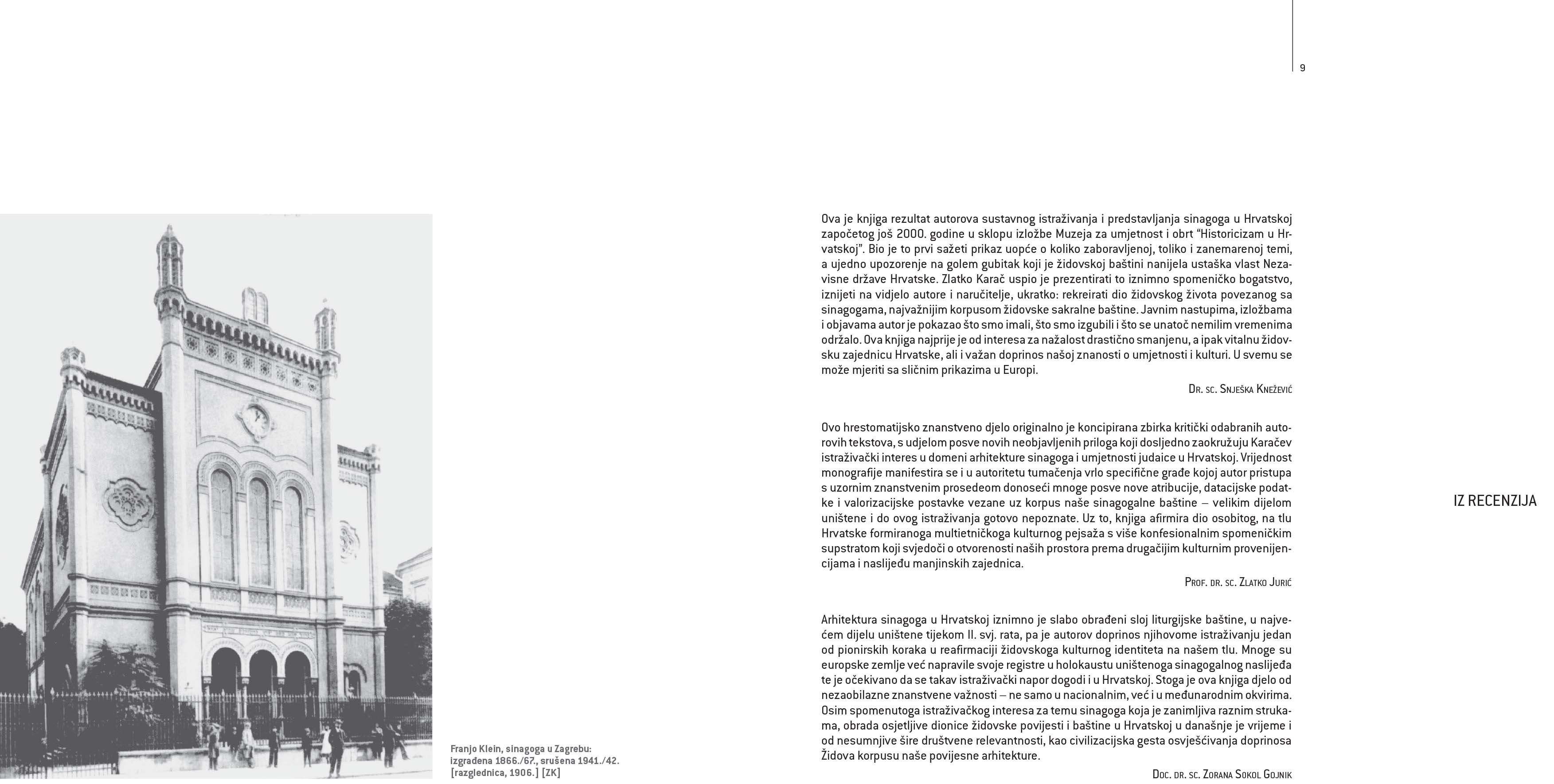This monograph of the chrestomathic genre compiles around 40 key studies by the author on synagogue architecture, a largely unknown and greatly destroyed segment of Jewish heritage in Croatia. Urban voids where synagogues once stood (such as the plot in Praška Street, Zagreb) represent a specific reuse potential for the memory of the lost, along with a few remaining synagogues that are neglected and lack adequate functions to restore their dignity and presence in the urban fabric.
