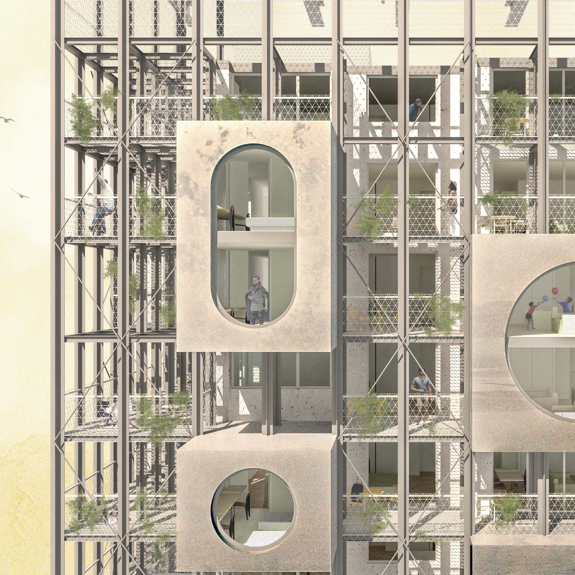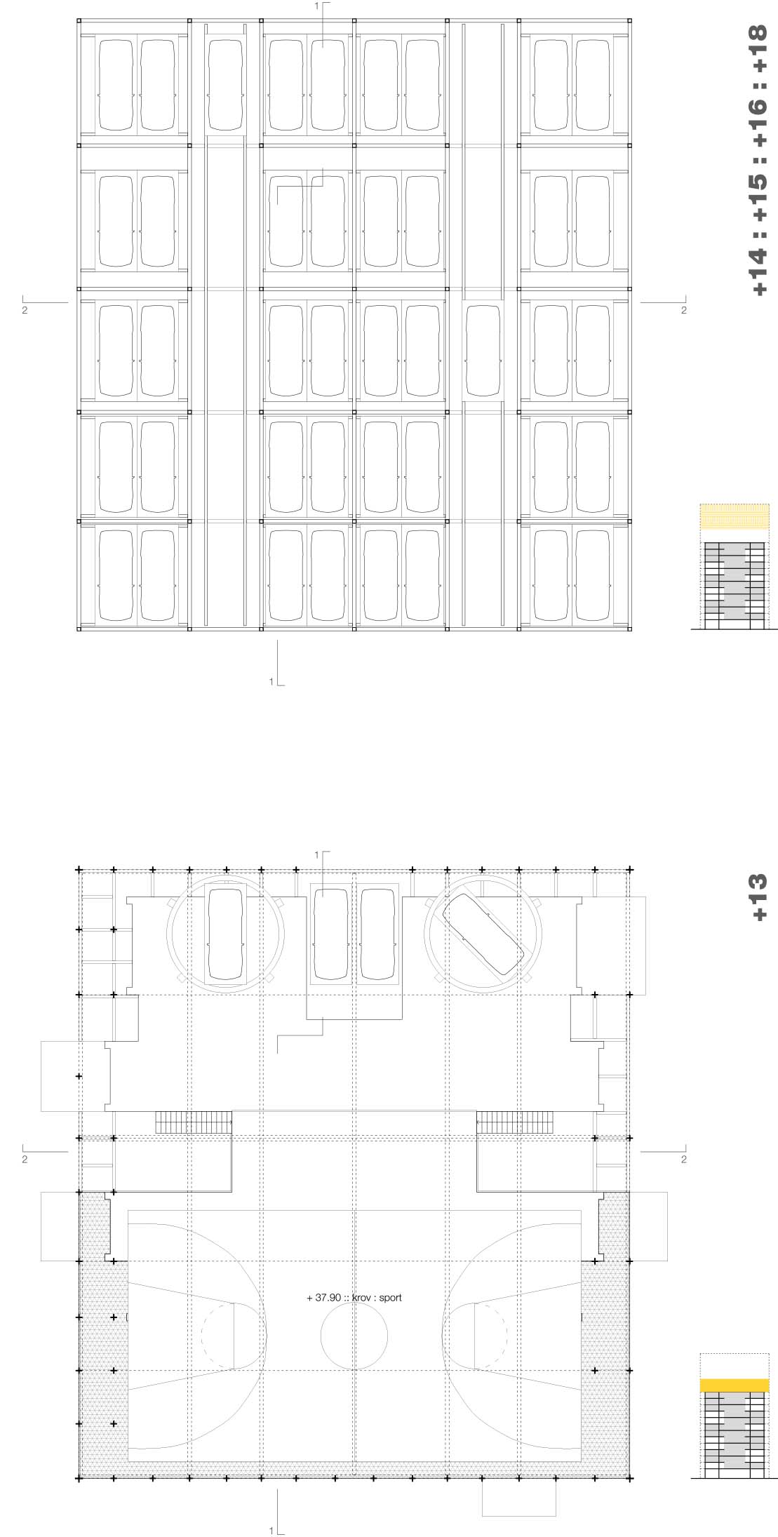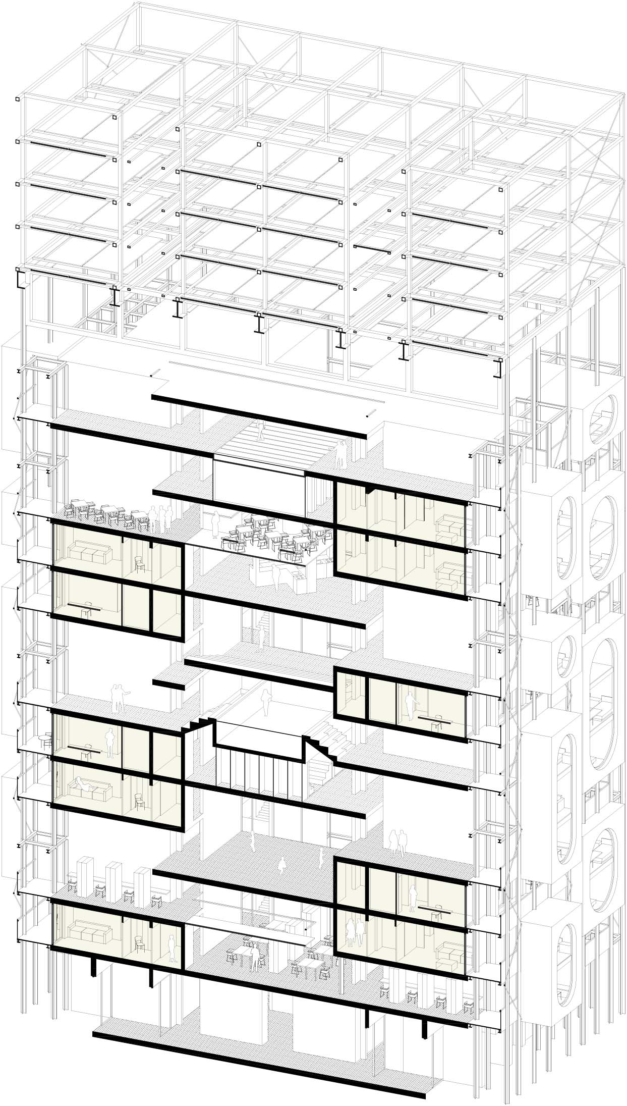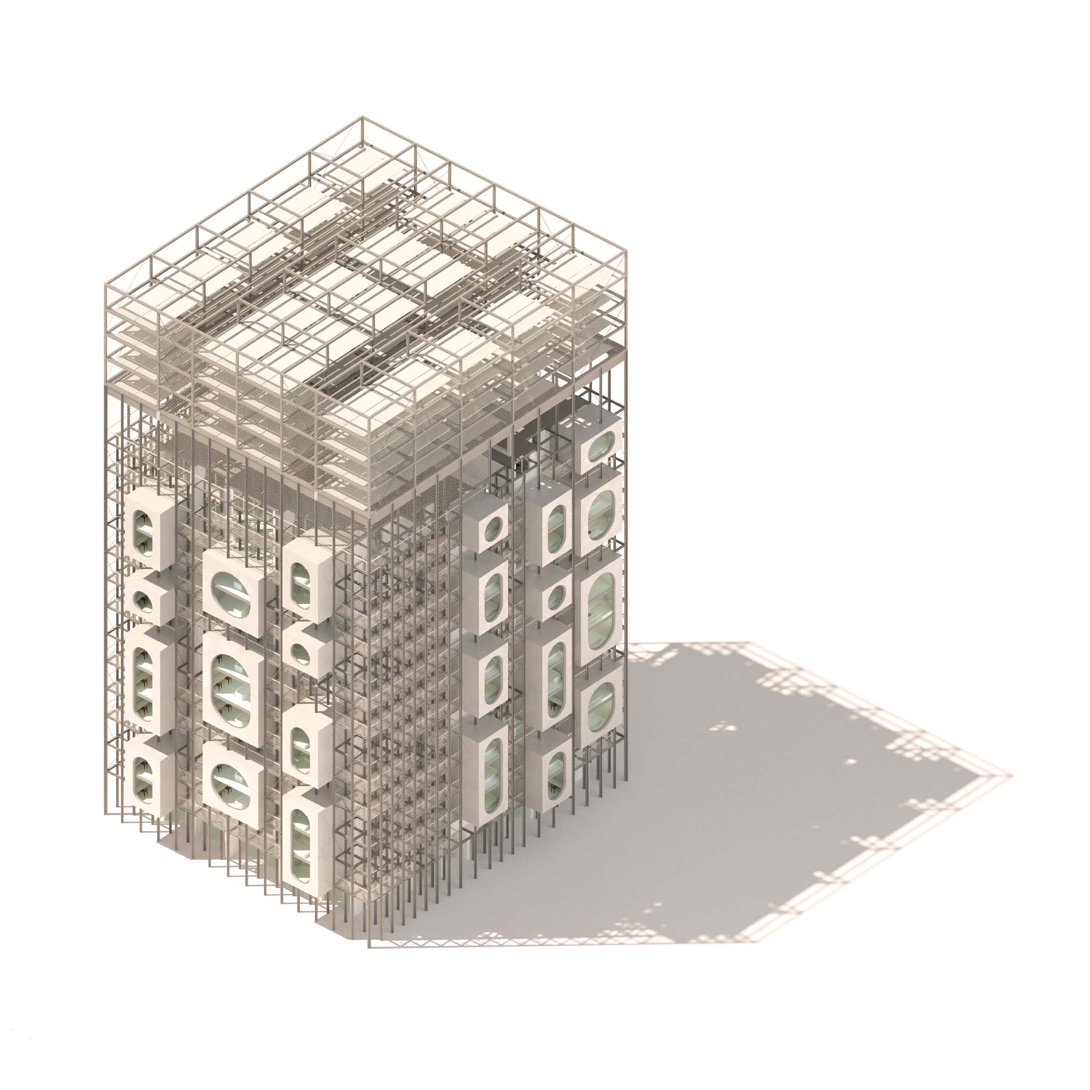 Affirming anonymity means nullifying the individuality of a building and the modernist need for significance. Such a building is stripped of its interior, becoming a body without organs. Three programmatic units and an exoskeleton maintain the system's balance. The “body” is a cleansed interior of the building, featuring shared hypertrophic apartments. Conventional apartments on the periphery gain “organs,” while the third unit, the “crown,” is the building's top where an automated garage compensates for the lack of space.