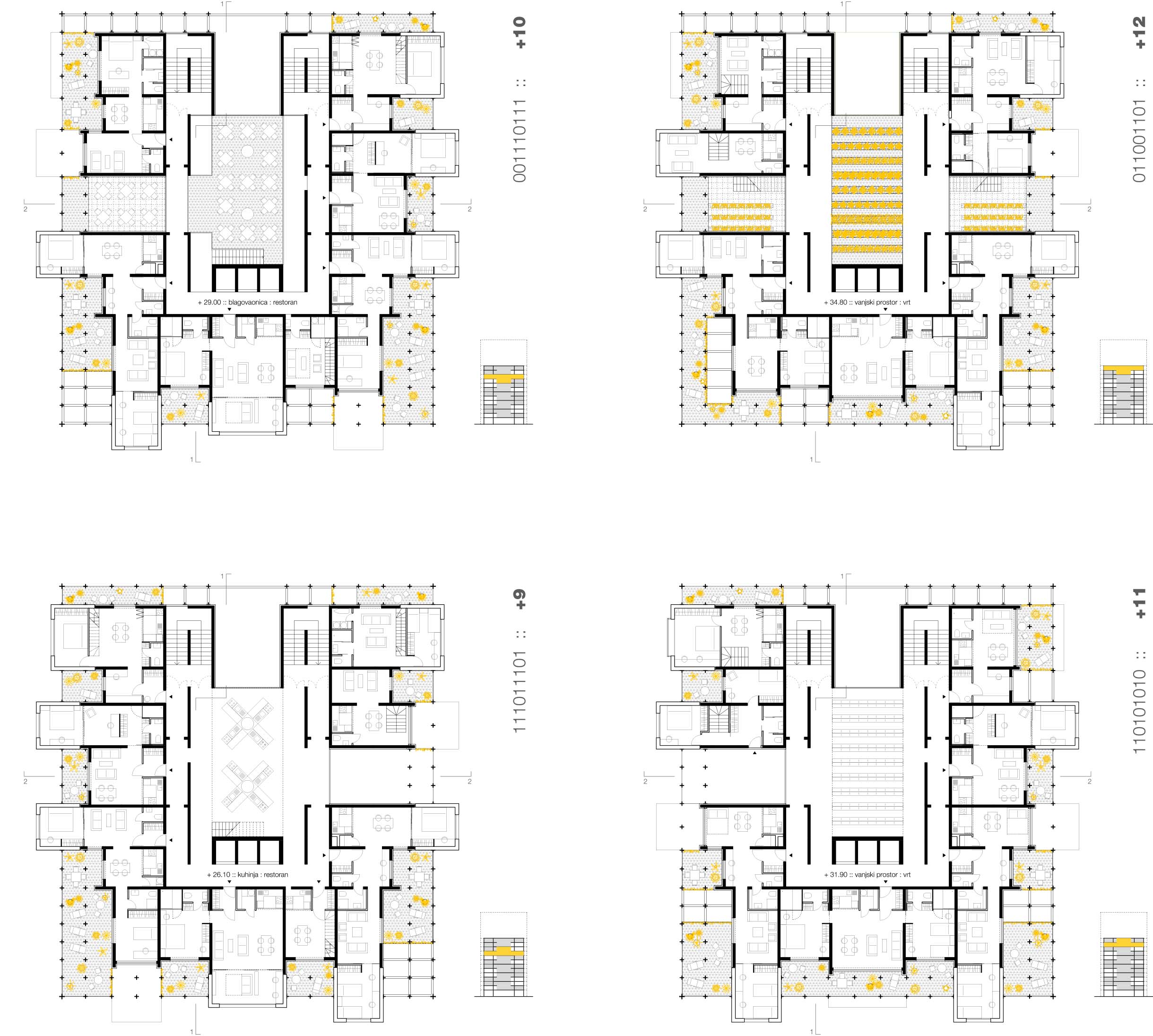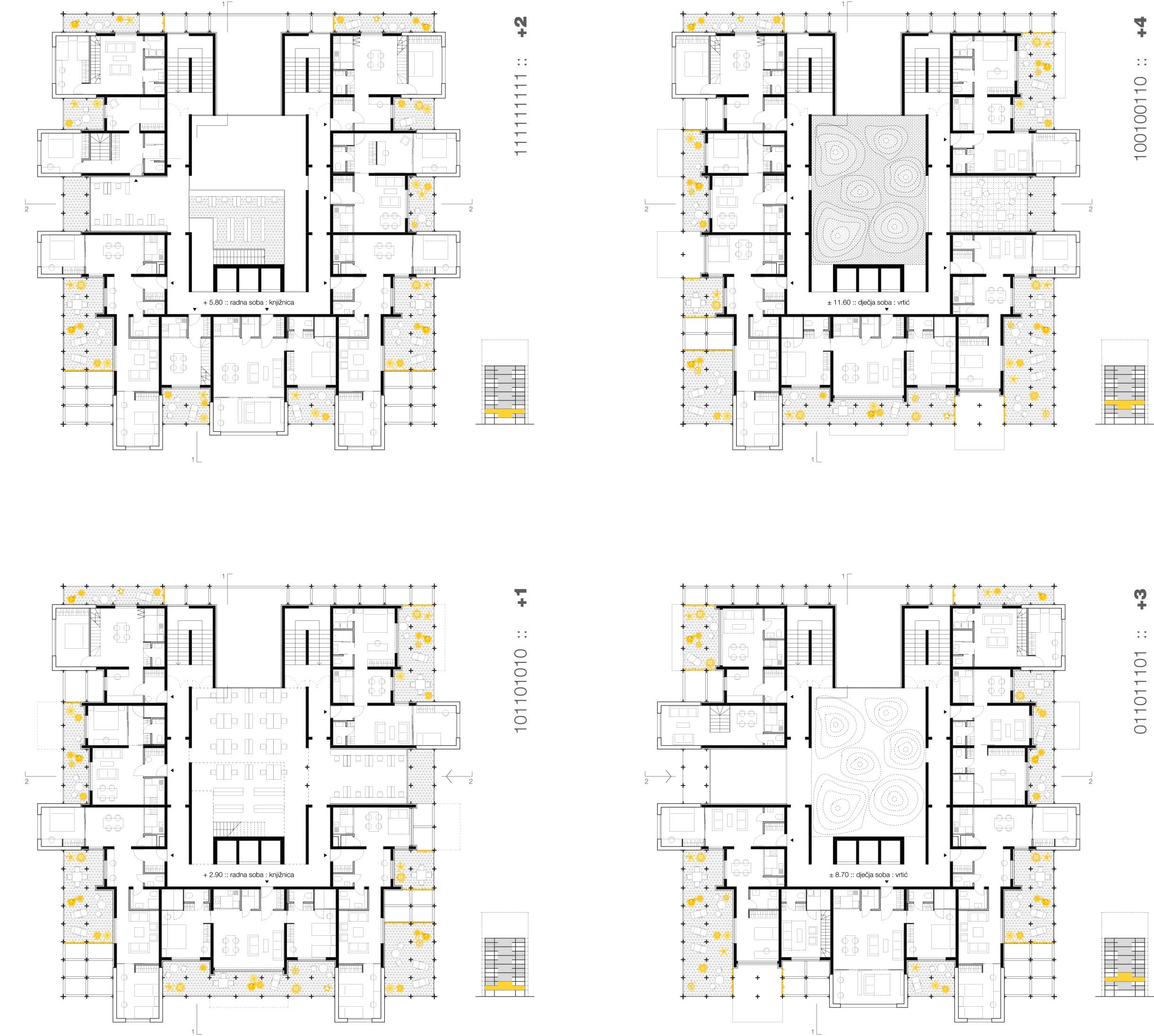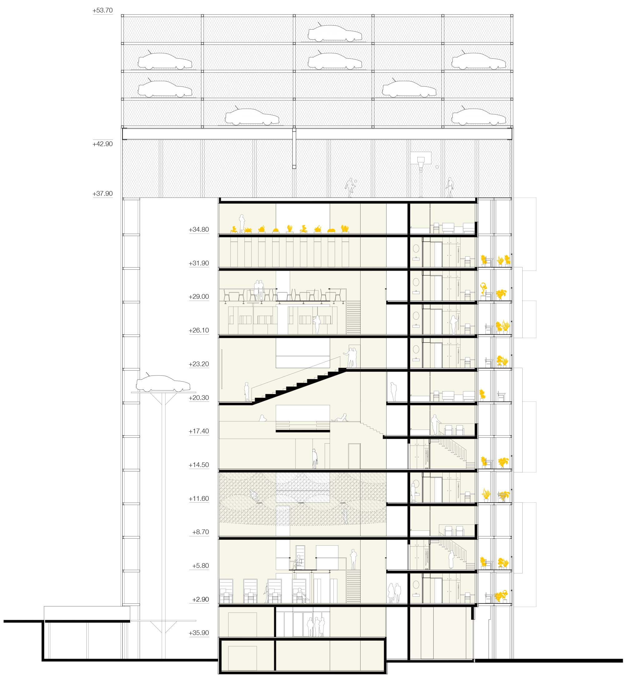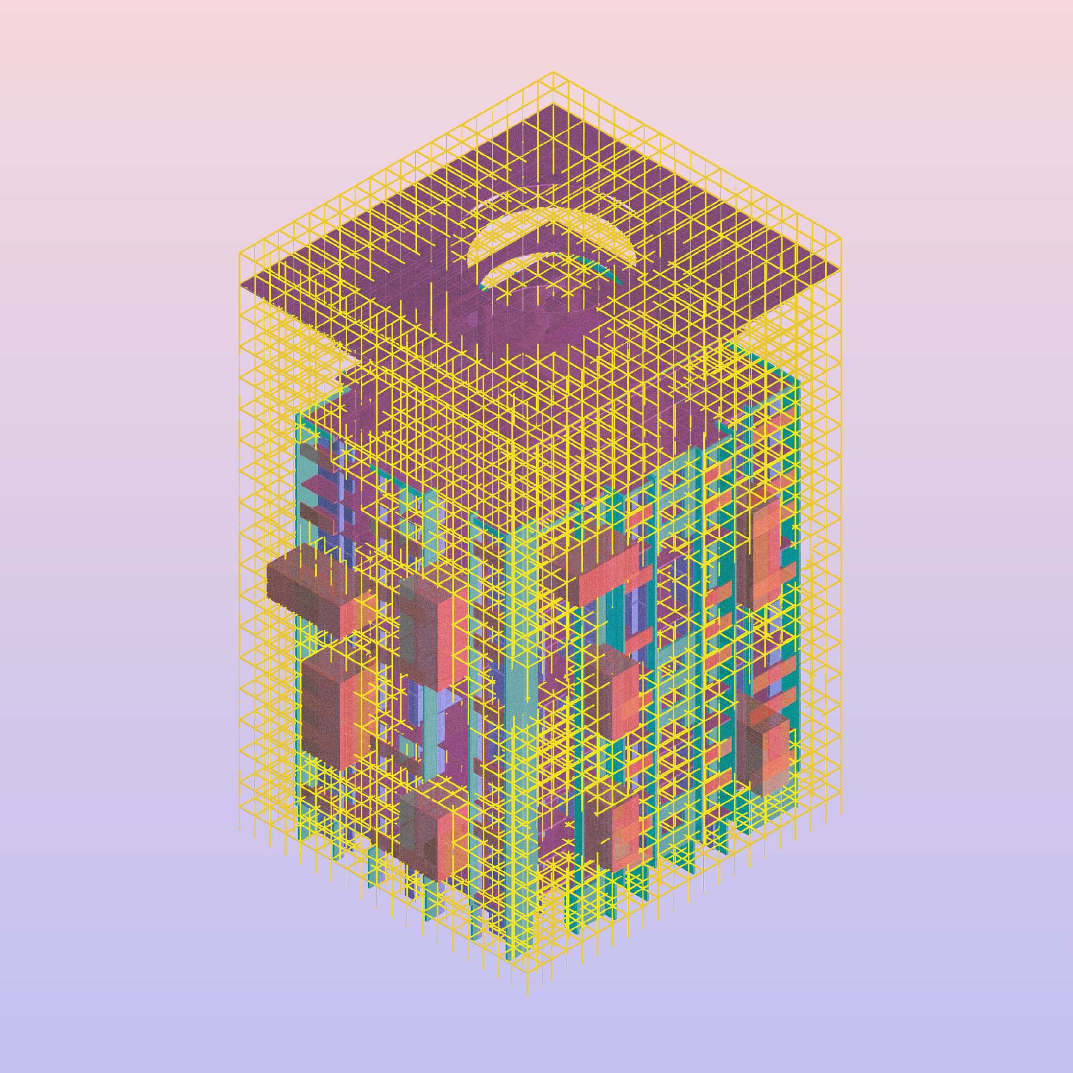 Affirming anonymity means nullifying the individuality of a building and the modernist need for significance. Such a building is stripped of its interior, becoming a body without organs. Three programmatic units and an exoskeleton maintain the system's balance. The “body” is a cleansed interior of the building, featuring shared hypertrophic apartments. Conventional apartments on the periphery gain “organs,” while the third unit, the “crown,” is the building's top where an automated garage compensates for the lack of space.