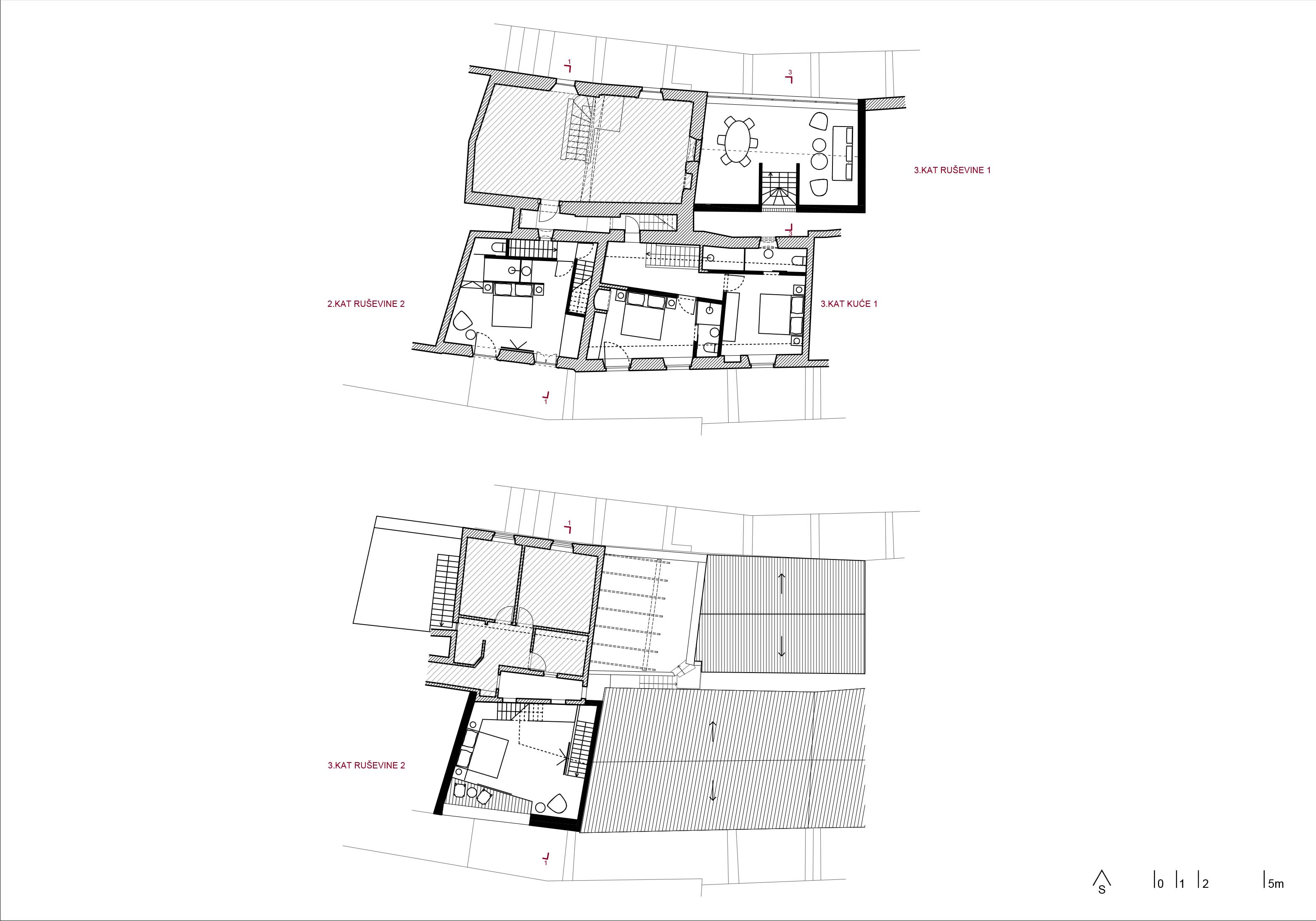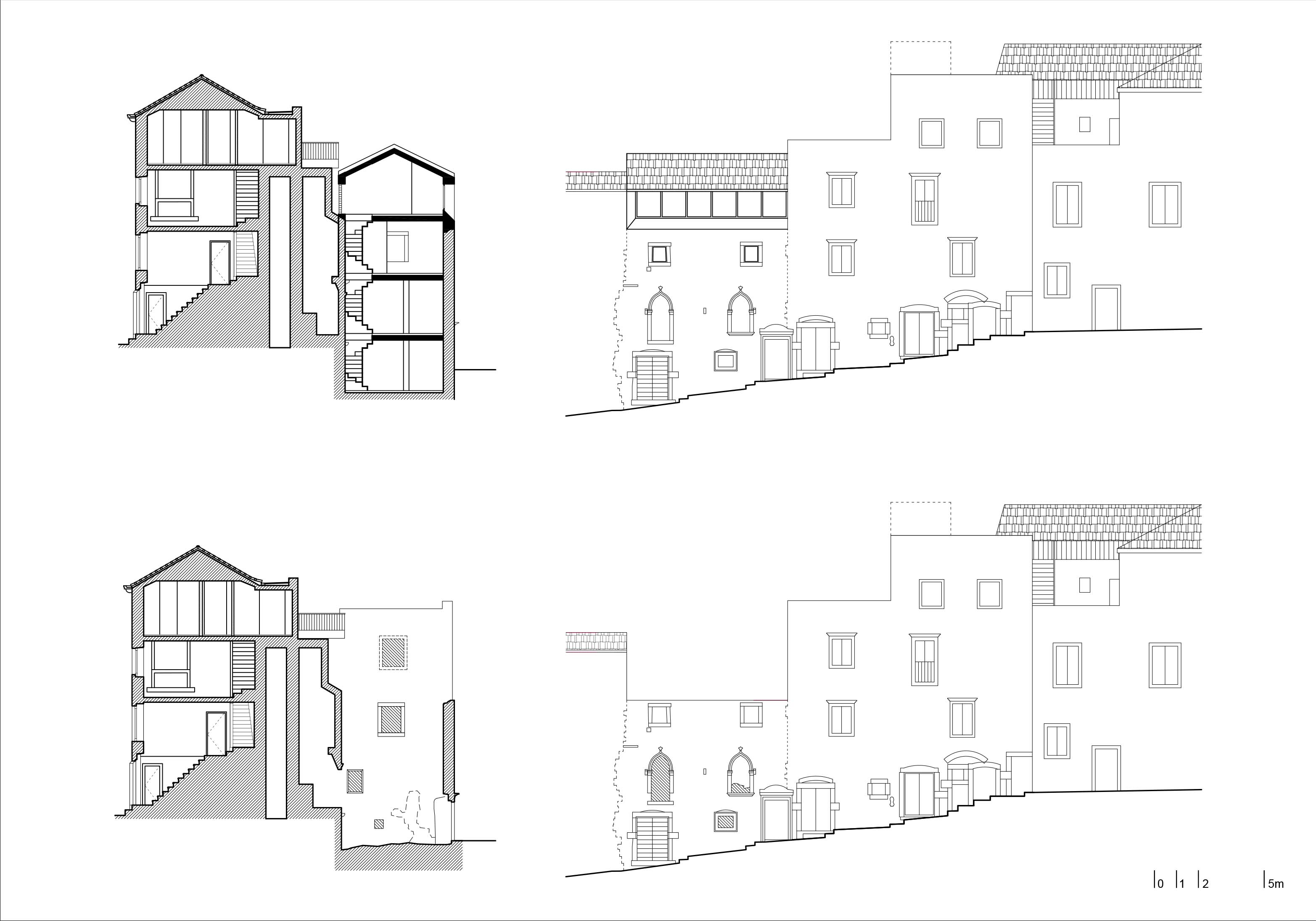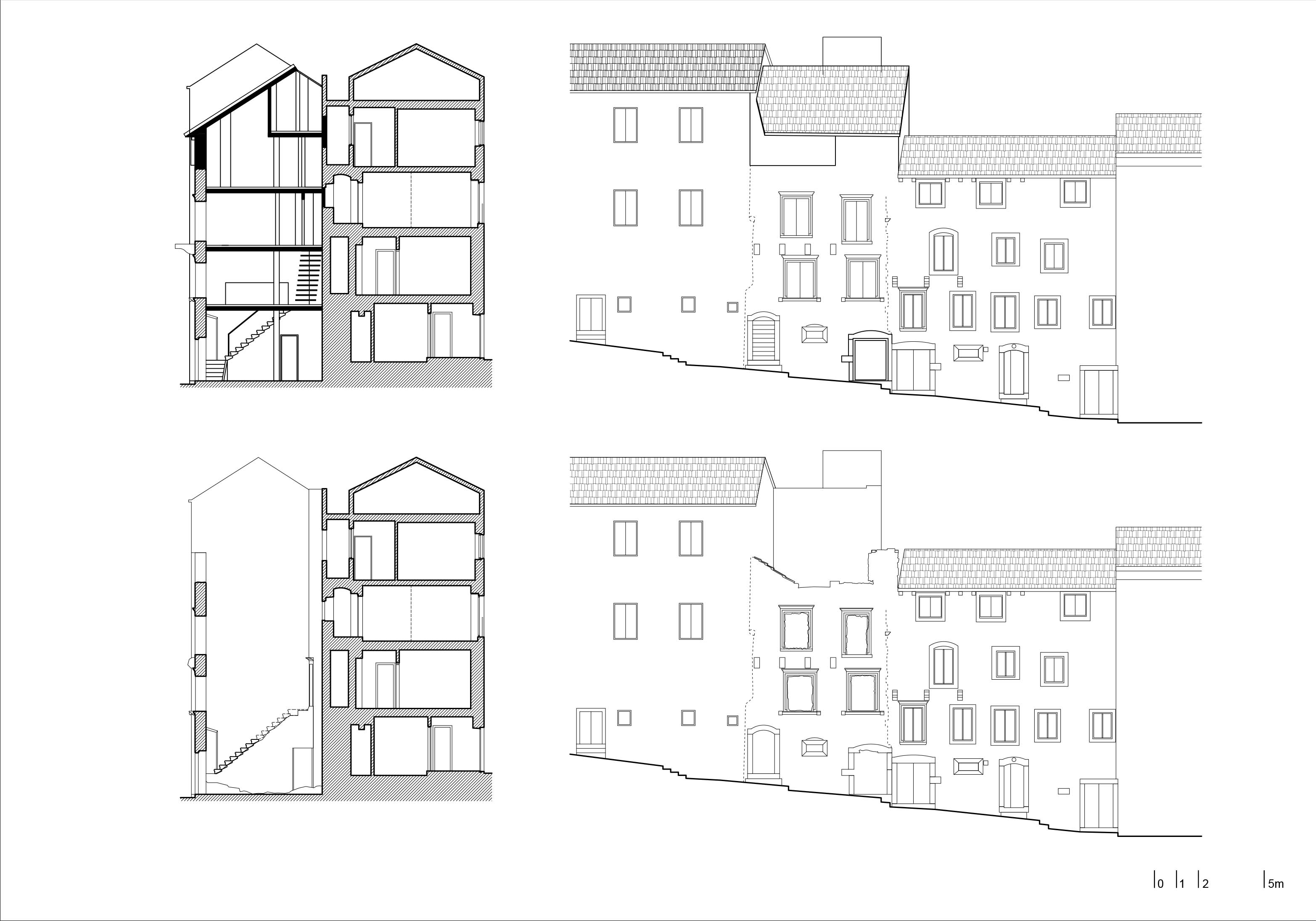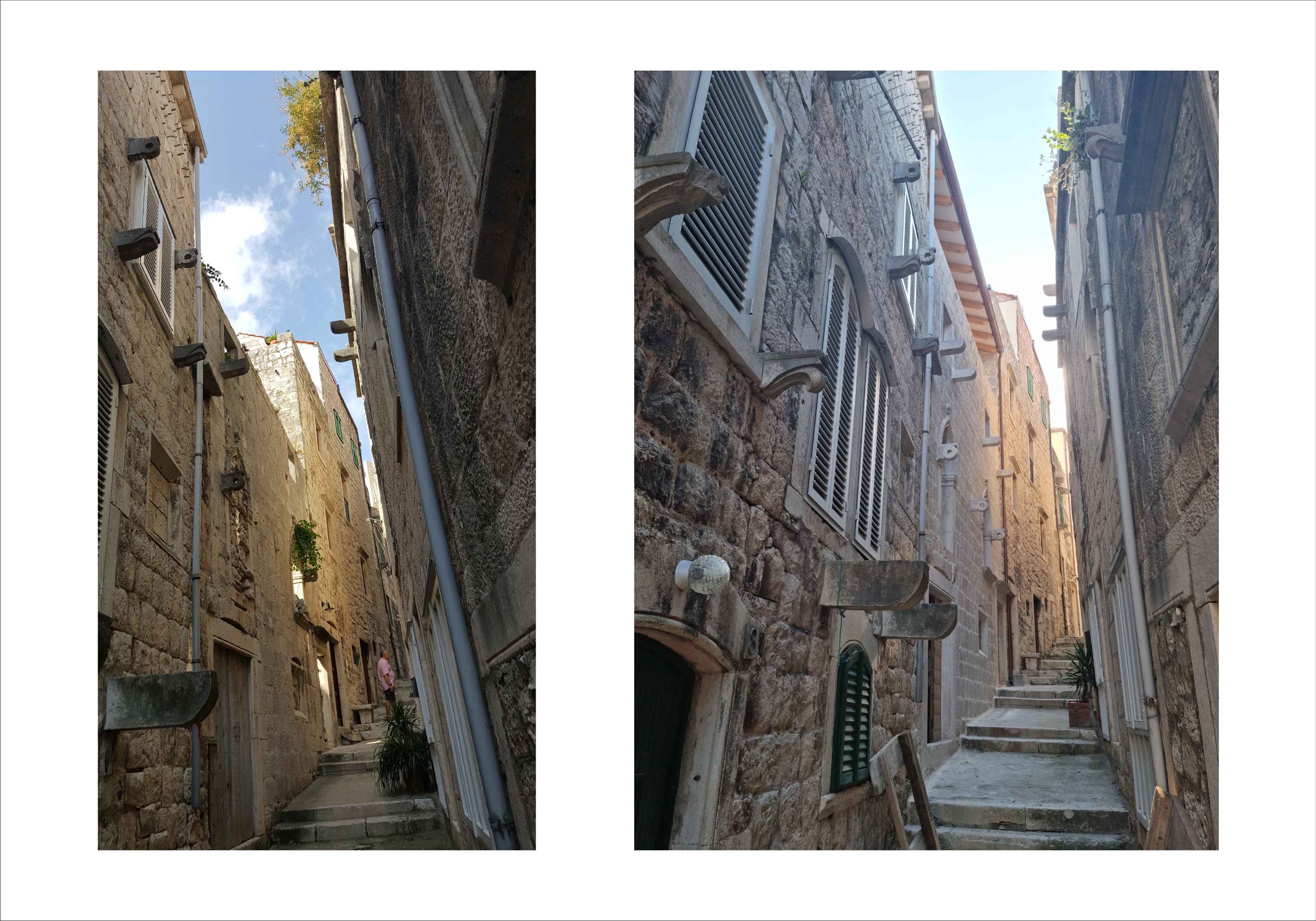 Hollow houses—walls without ceilings or roofs—are a typical spatial element in Korčula. This project involves the reuse of two such ruins on opposite sides of a block and the adaptation of the upper levels of an adjacent house into three apartments, forming part of a dispersed hotel. Between them lies a cloaca. This is one of many iterations developed in collaboration with conservators and through negotiations with neighbors. The northern “Gothic” ruin has been completed with the addition of one level. The southern “Renaissance” ruin is still under construction and negotiation.