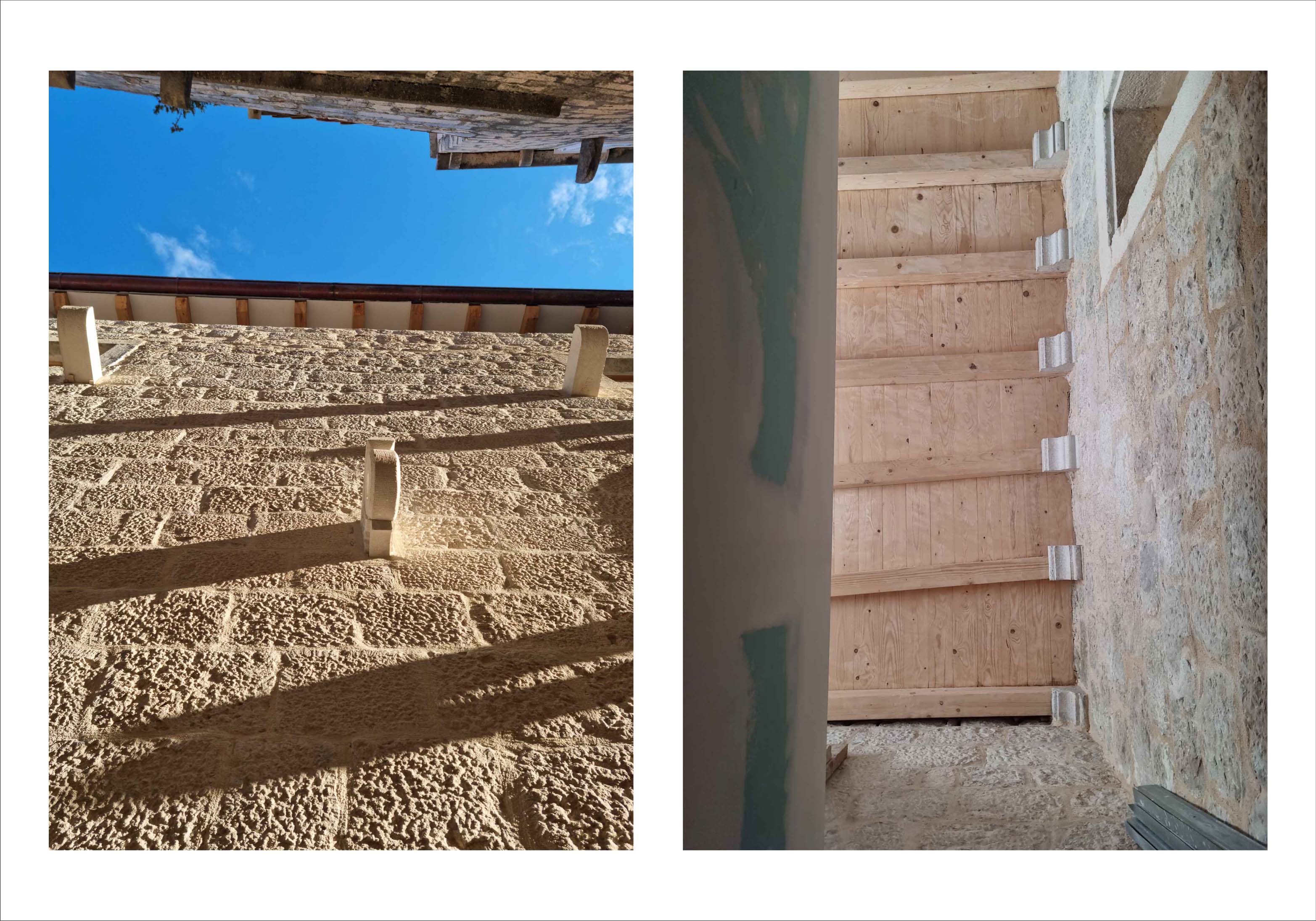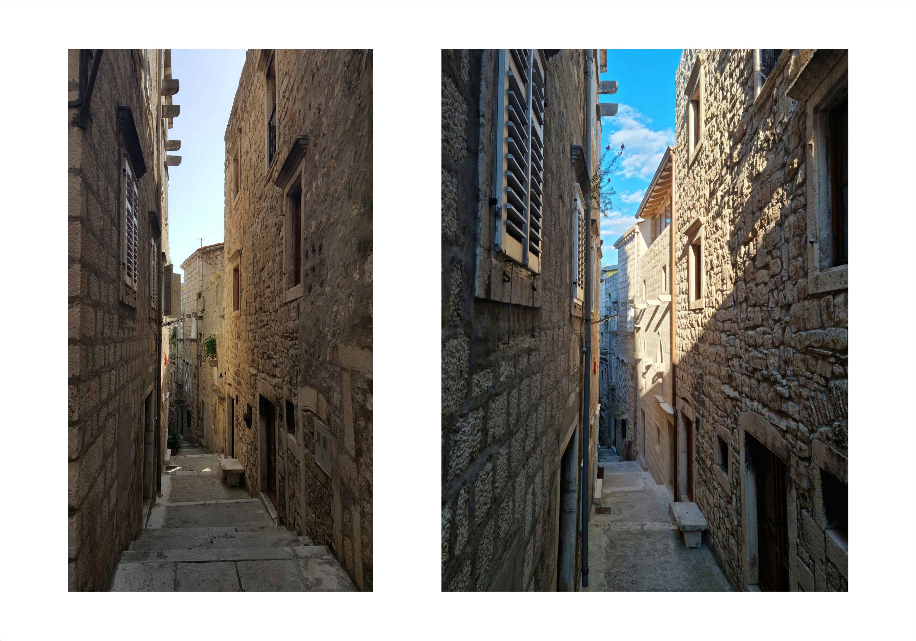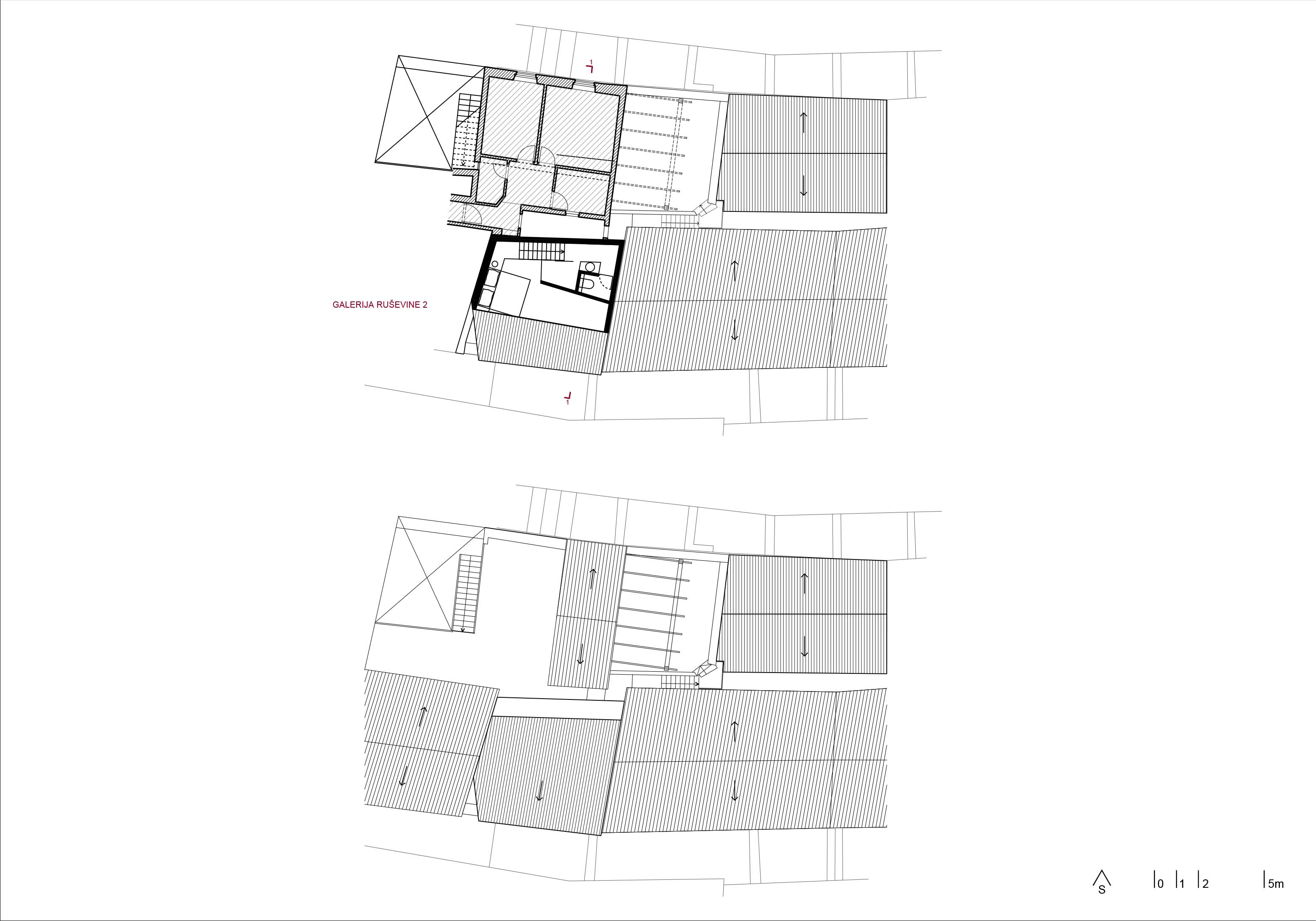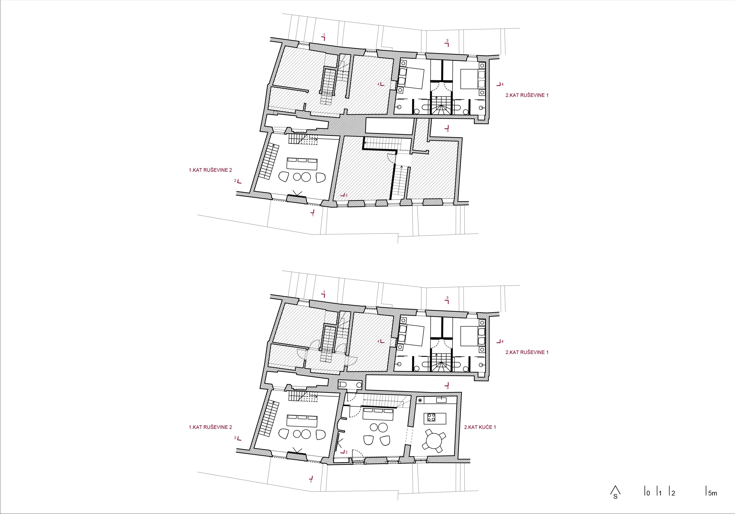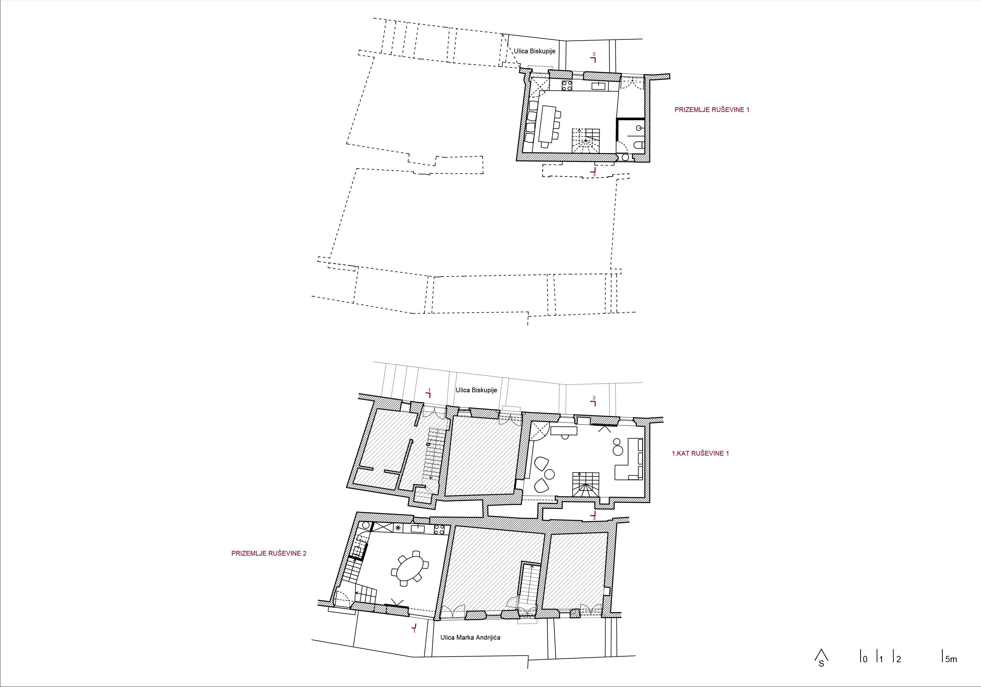 Hollow houses—walls without ceilings or roofs—are a typical spatial element in Korčula. This project involves the reuse of two such ruins on opposite sides of a block and the adaptation of the upper levels of an adjacent house into three apartments, forming part of a dispersed hotel. Between them lies a cloaca. This is one of many iterations developed in collaboration with conservators and through negotiations with neighbors. The northern “Gothic” ruin has been completed with the addition of one level. The southern “Renaissance” ruin is still under construction and negotiation.